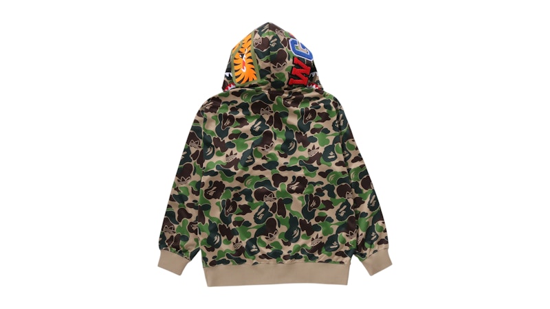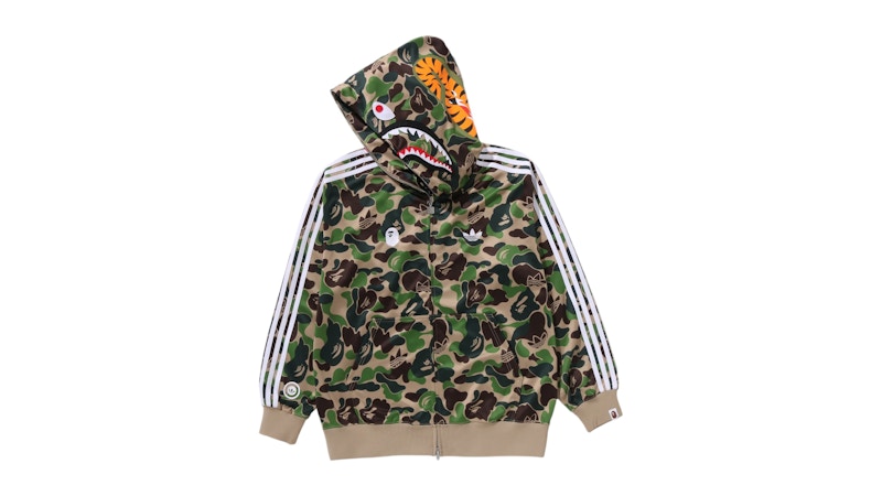 La adidas x BAPE Relaxed Fit Track Camo Shark Full Zip Hoodie Green è una felpa con cappuccio caratterizzata da un mimetico verde e nero. Presenta un'apertura a zip completa e un cappuccio con dettagli grafici, tra cui la testa di squalo. Le maniche presentano le tre strisce tipiche del marchio adidas. La parte inferiore dei polsini e dell'orlo è di colore beige. L'immagine mostra vari dettagli del design, compresi i loghi e i motivi sul cappuccio.
