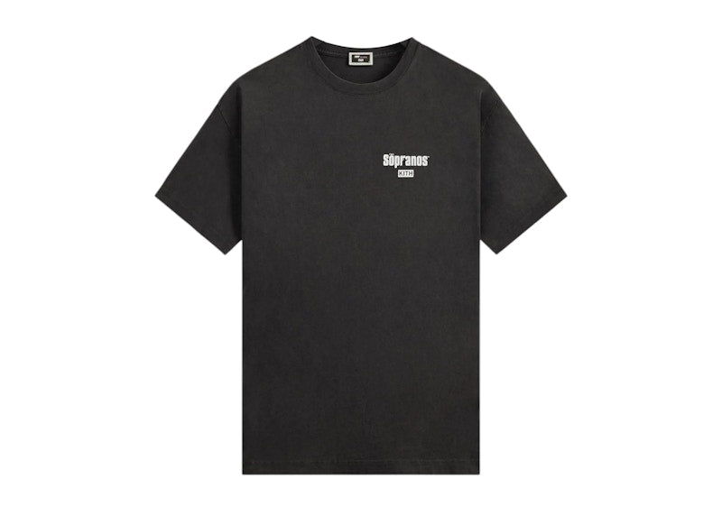 La Kith x The Sopranos Bada Bing Vintage Tee Black è una maglietta nera con grafica ispirata alla serie TV "I Sopranos". La parte anteriore presenta un logo "Sopranos" e "Kith" in bianco, mentre il retro mostra un design più grande con la scritta "BADA BING" accompagnata da un'immagine stilizzata di una donna e dalle parole "Gentlemen's Club" e "Route 80 Lodi, New Jersey". La maglietta è stata rilasciata il 22 dicembre 2025 ed è disponibile nel colore nero.