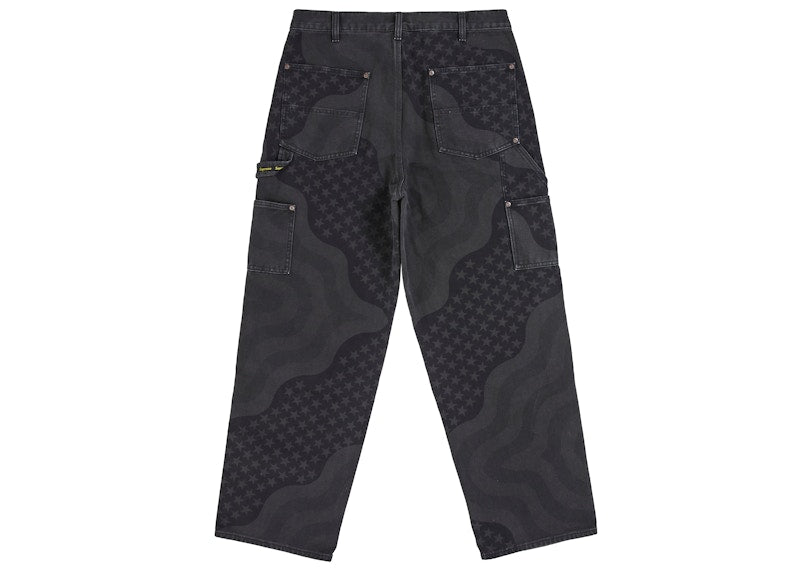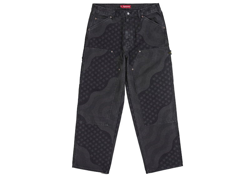 Gli eleganti pantaloni Supreme Flag Double Knee Painter Pant Black fanno parte della collezione streetwear di Supreme. Presentano un design unico con un motivo a stelle e onde nere su sfondo nero, tasche multiple e dettagli in pelle. Realizzati in denim, questi pantaloni sono un capolavoro del marchio Supreme, rilasciato il 26 marzo 2026. La colorazione principale è nero.