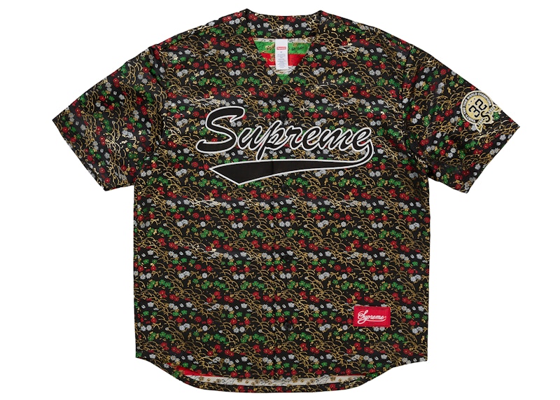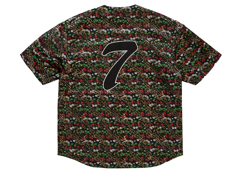 La maglietta da baseball Supreme Floral Jacquard è un capo di abbigliamento unico nel suo genere, caratterizzato da un design floreale jacquard sulla tinta nera. Questo modello, parte della collezione SS26 di Supreme, è stato rilasciato il 26 marzo 2026. La maglietta presenta un motivo floreale multicolore su sfondo nero e reca il logo Supreme sul davanti e un numero 7 sul retro. Realizzata con dettagli curati, come il logo e le patch, questa maglietta è un elemento distintivo dello streetwear.
