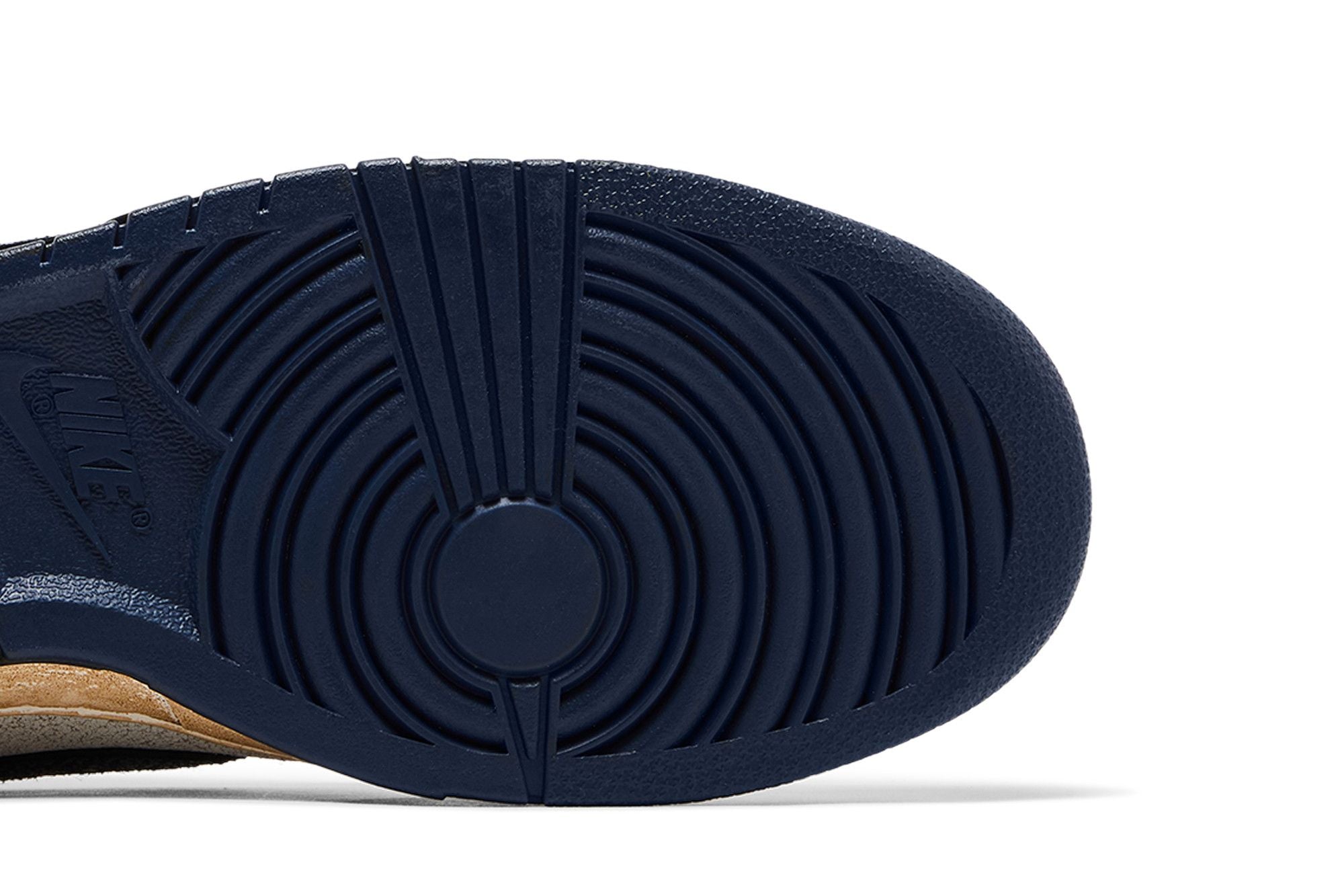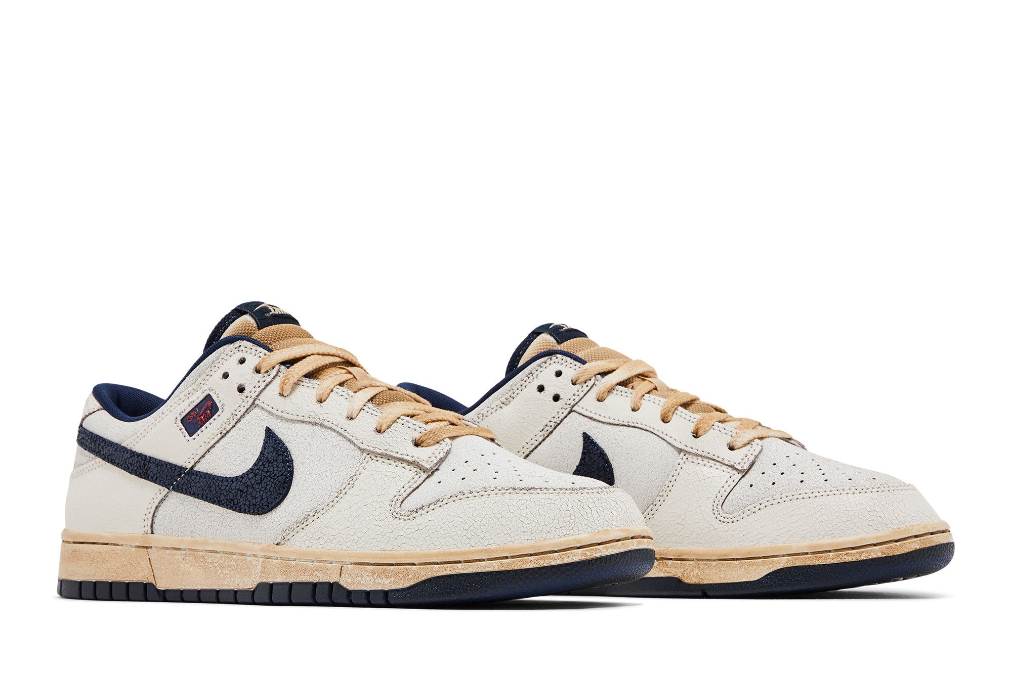 La Nike Dunk Low Pro SB, presenta una tomaia in pelle bianca con dettagli in blu e una suola bicolore beige e nera. La scarpa è caratterizzata da una linguetta interna e da un logo Swoosh sul lato, mentre sulla linguetta posteriore è presente un piccolo logo con scritta rossa. Le stringhe beige completano l'outfit di questa sneaker dal design accattivante.