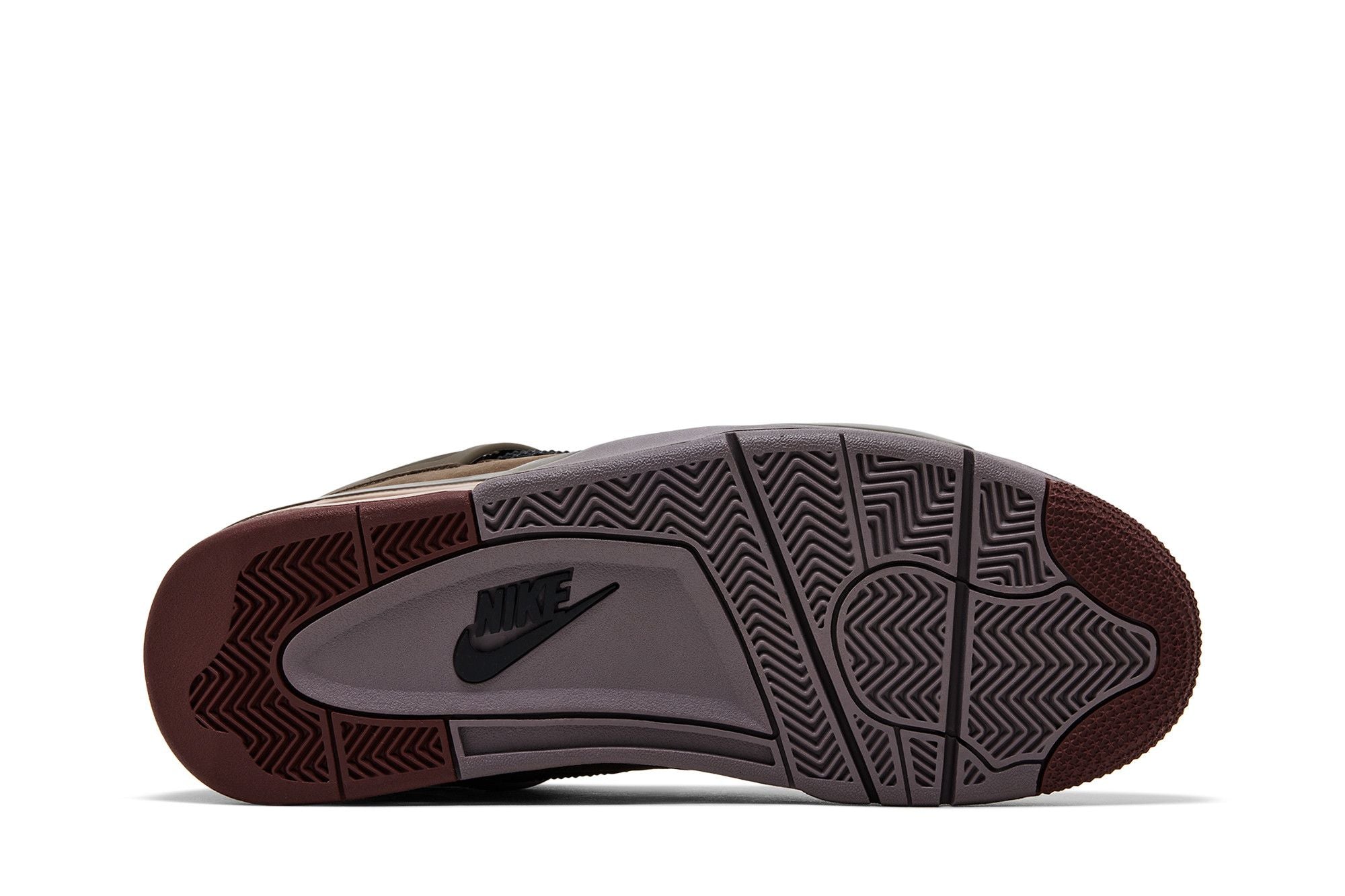 La Air Jordan 4 presenta una tomaia in suede marrone con dettagli in mesh nero e inserti in plastica grigia. La suola è composta da più strati di gomma grigia e marrone, con un'ampia base grigia e un battistrada marrone. Le stringhe sono nere e il collo della scarpa è alto. Il design della Air Jordan 4 è caratterizzato da elementi classici come la "tabella" posteriore e i fori di ventilazione laterali.