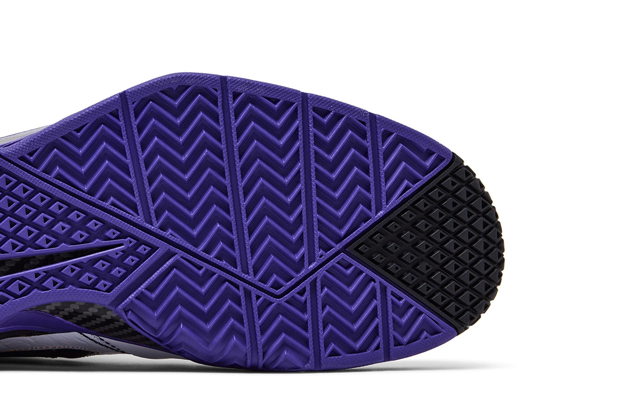 La Nike Kobe 1 Protro 81 Pt Game (2026) presenta una combinazione di colori bianco, nero e viola, con una tomaia in pelle e una suola in gomma. La scarpa è caratterizzata da un design sportivo con un collo alto e una linguetta posteriore con un taglio per facilitare l'infiliamento. La suola presenta un battistrada in gomma nera con elementi viola, mentre la parte posteriore del collo è in tessuto viola. Il marchio Nike è visibile sul lato della scarpa, realizzato in nero con dettagli in oro.