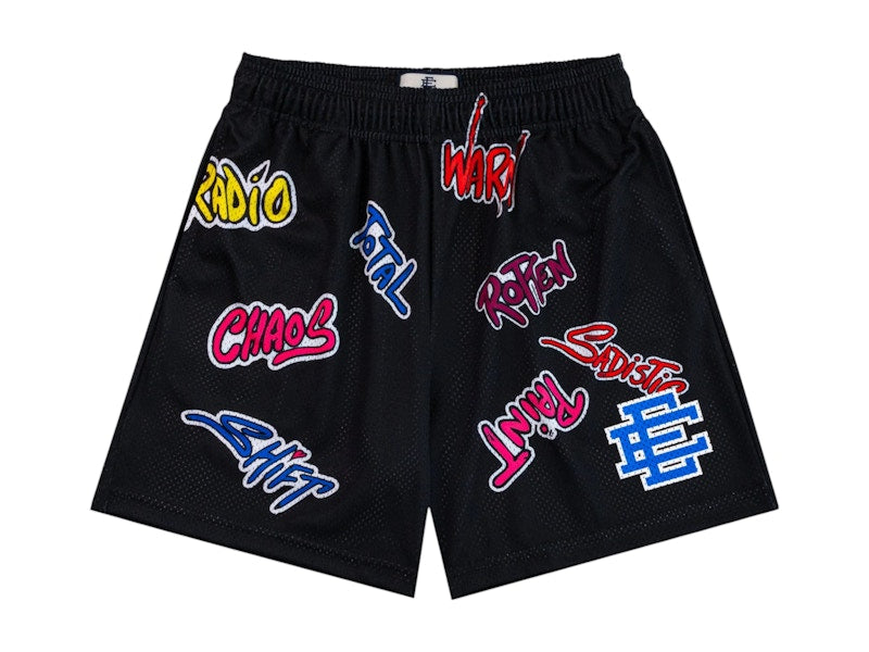 La Eric Emanuel x Matty Boy EE Shorts Black/Blue è una coppia di shorts neri in mesh sportivo con elastico in vita, caratterizzati dal logo interconnesso EE di Eric Emanuel sulla gamba sinistra in blu, delineato in bianco. Gli shorts presentano stampe varie come "Rotten", "Paint" e "Chaos" in lettere in rilievo rosa, rosso, giallo e blu. La collaborazione tra Eric Emanuel e Matty Boy unisce il loro stile unico per creare una versione esclusiva degli EE Shorts.