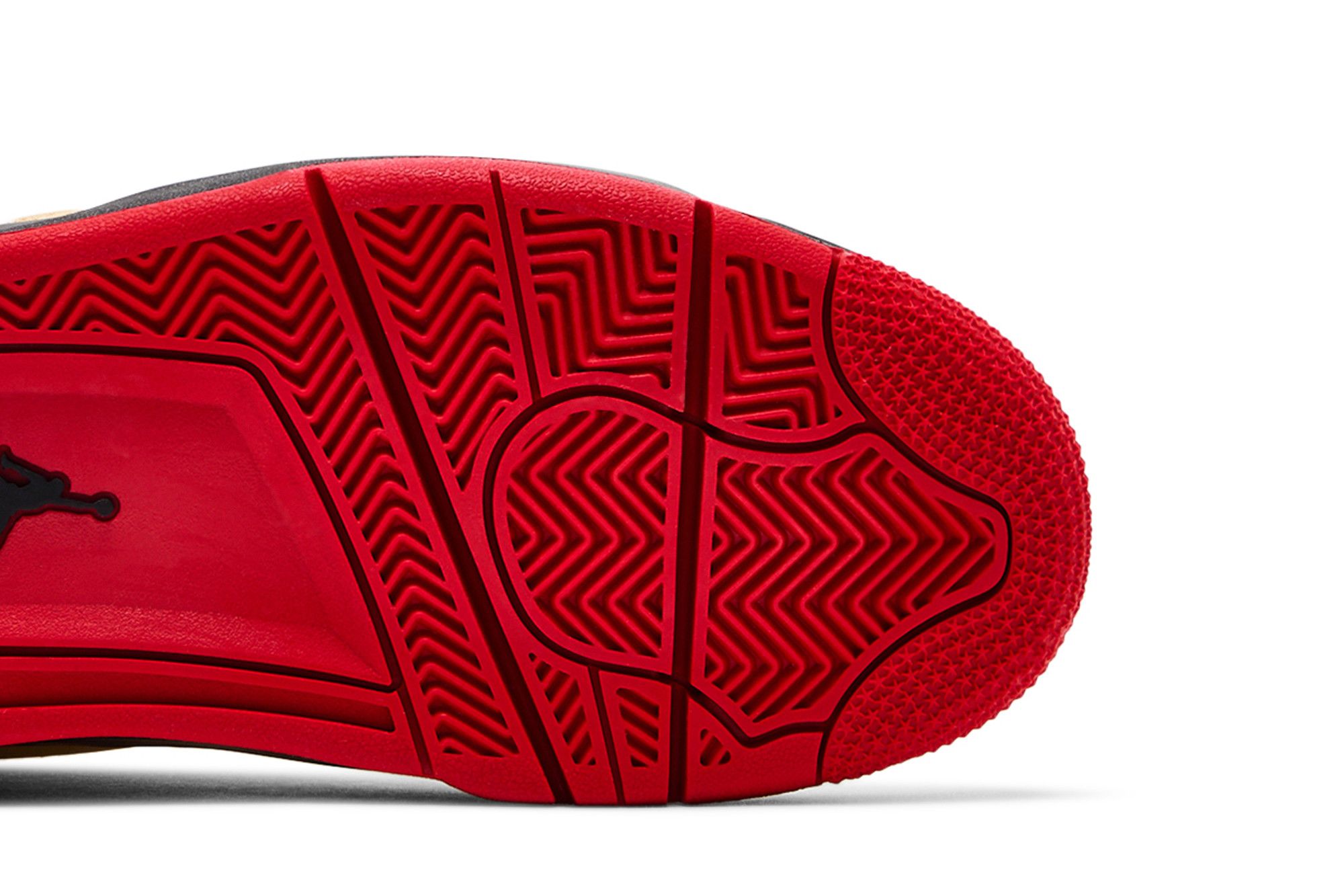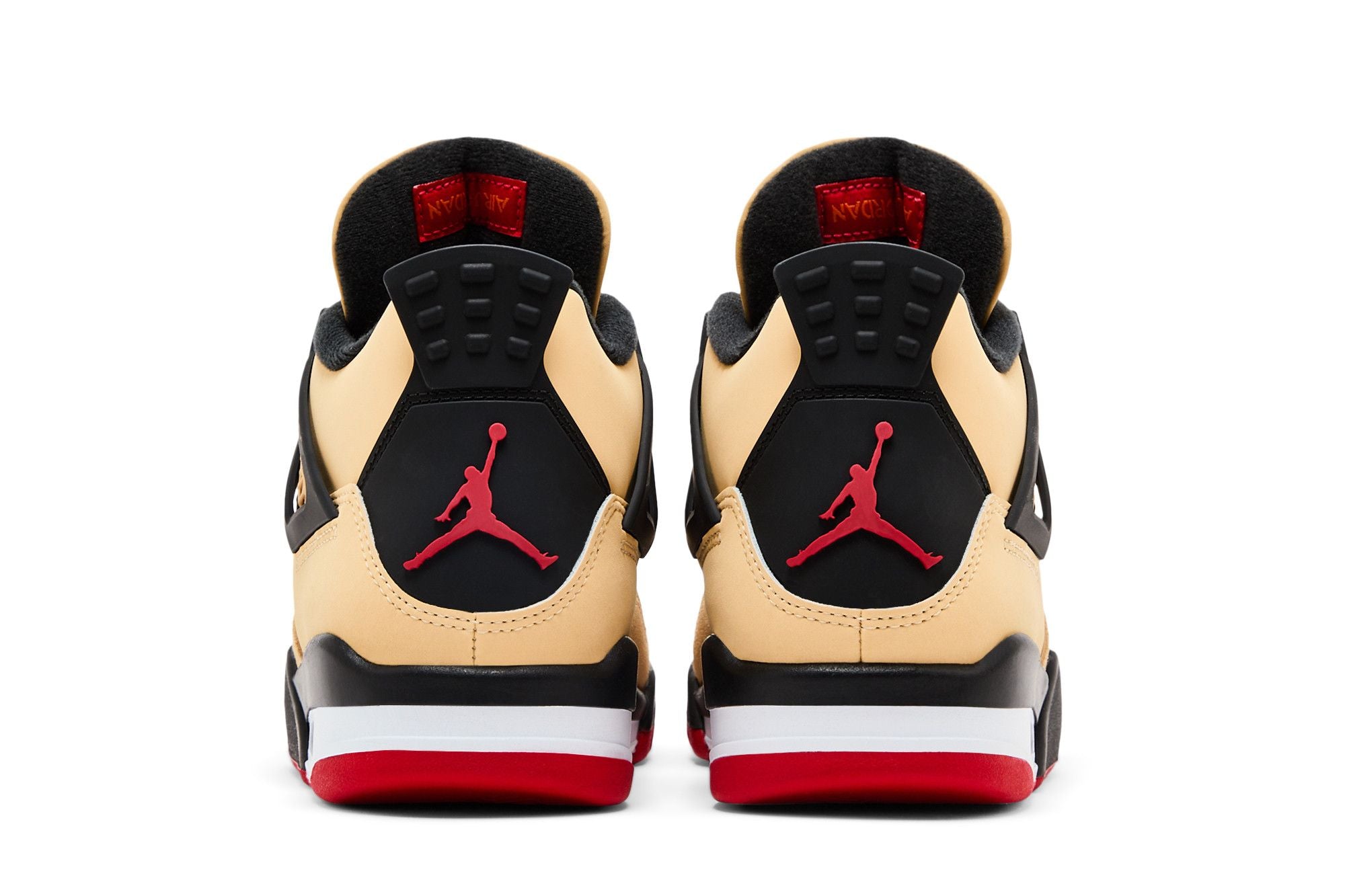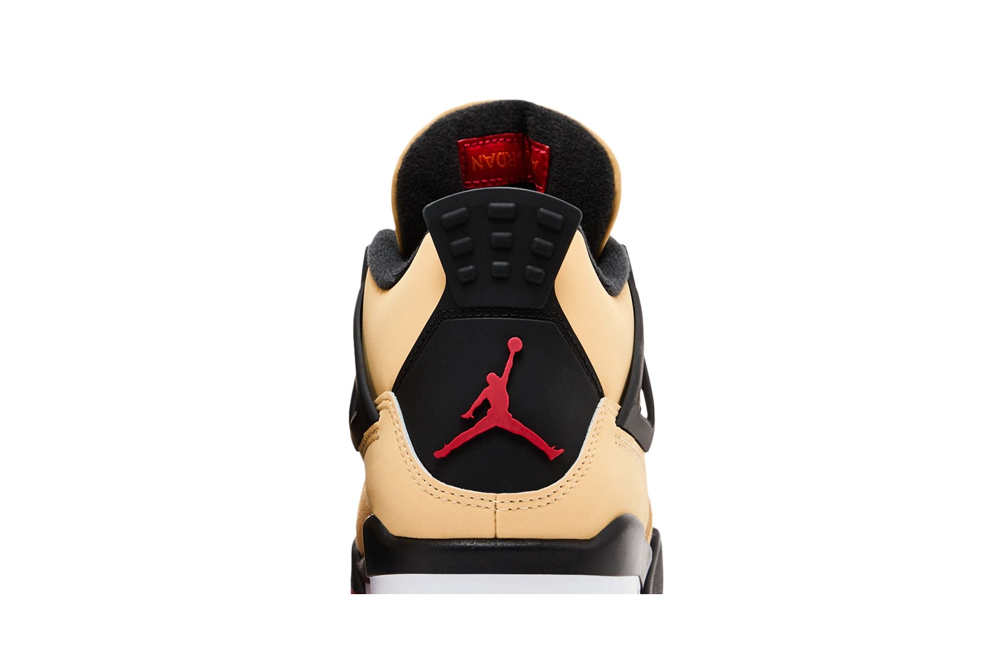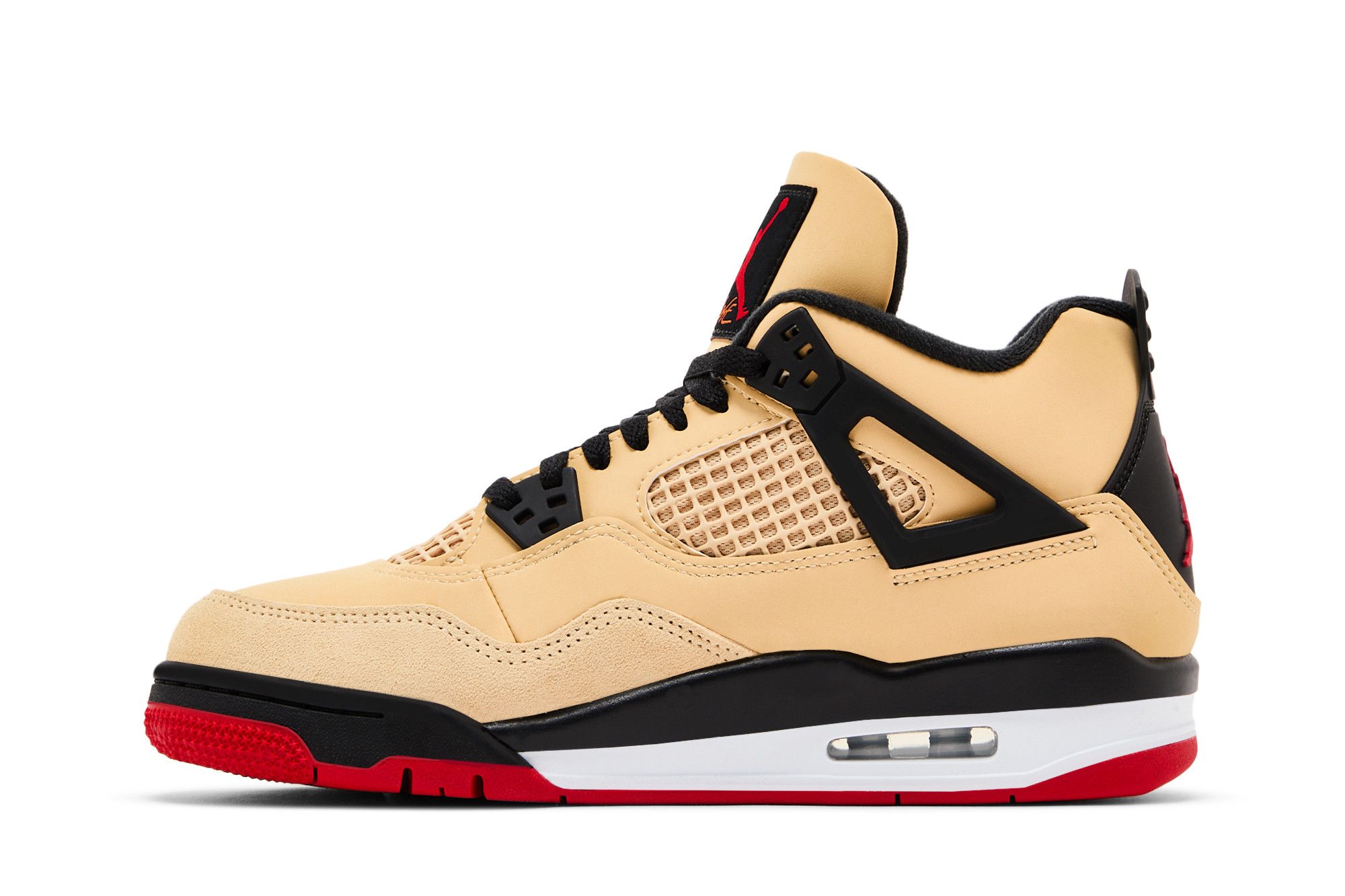 La Air Jordan 4 presenta una combinazione di colori unica e accattivante, con una parte superiore in pelle beige, dettagli in nero e una suola rossa. La tomaia è caratterizzata da una mesh beige sul lato e da un design con inserti neri. La suola è rossa con un'aggiunta nera nella parte centrale e un inserto bianco che ospita la tecnologia Air.