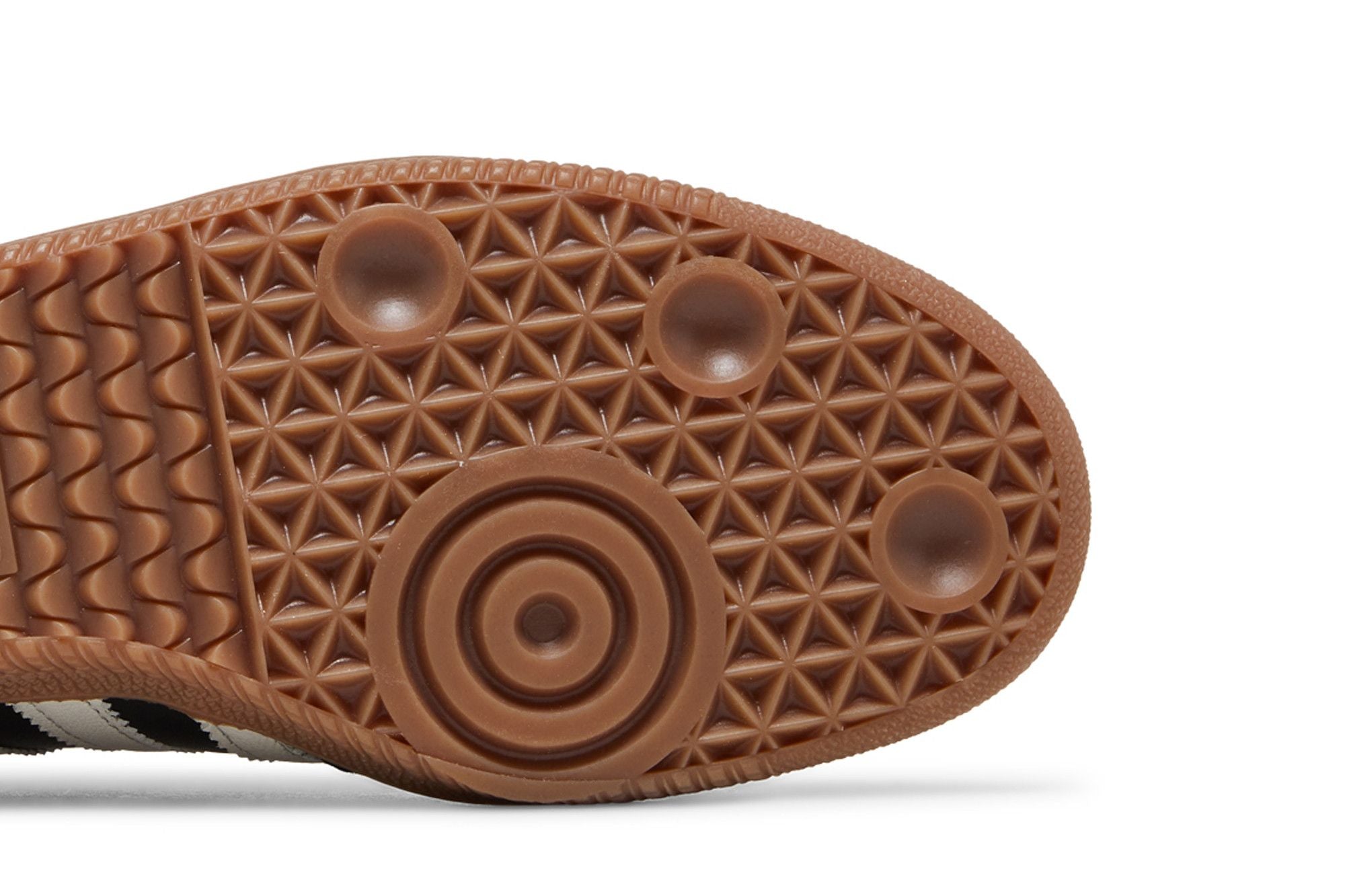 Der adidas Samba JJJJound Off-White Core Black verfügt über ein Obermaterial aus weißem Leder, begleitet von einem grauen Wildleder-Schutzblech. Es folgen die drei legendären adidas-Streifen in schwarzer Farbe und passend zu Zunge und Zunge. Ein bronzefarbenes Lederfutter rundet das Design des Stücks ab, während das Ganze auf einer Gummisohle ruht.
