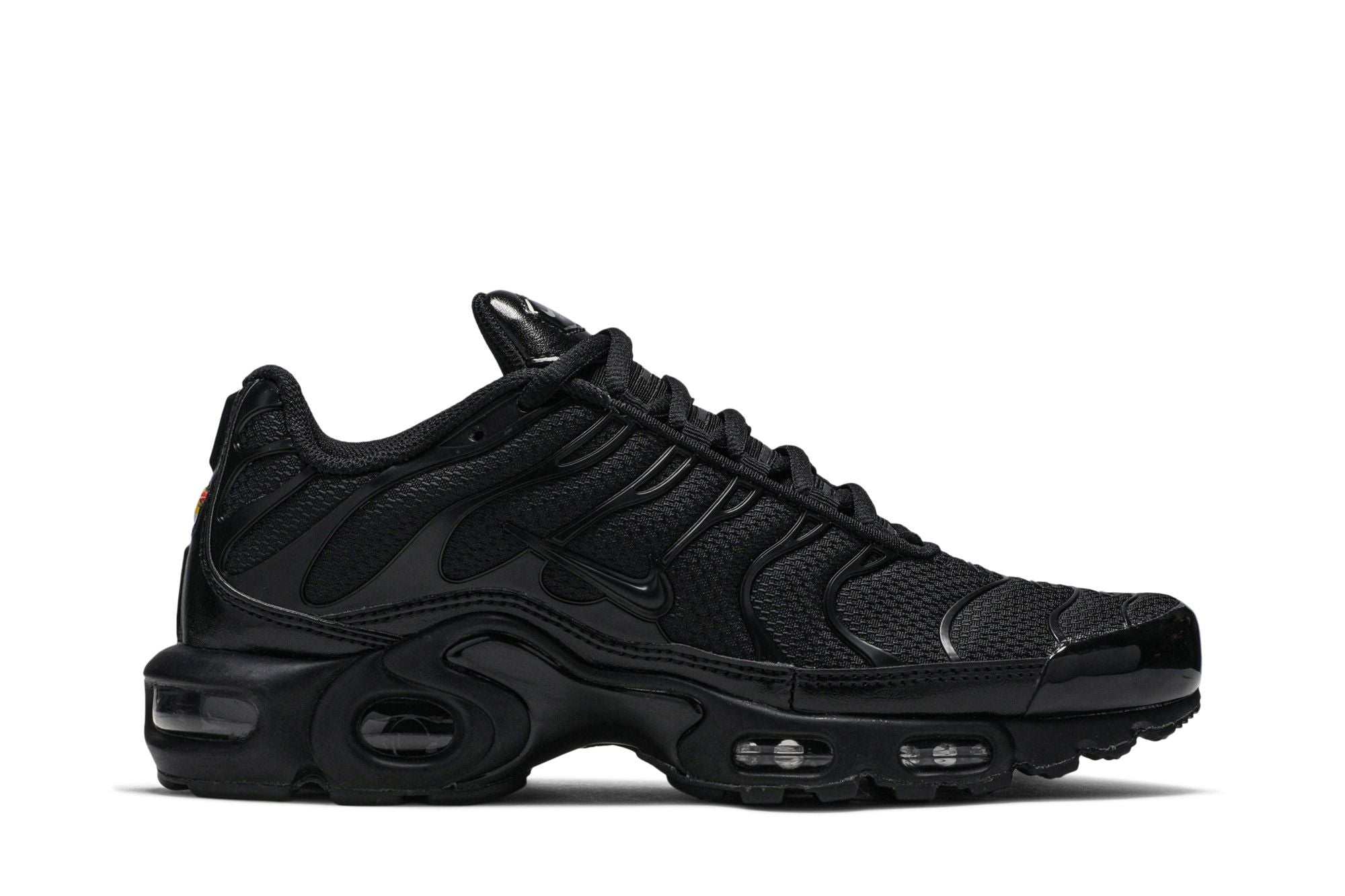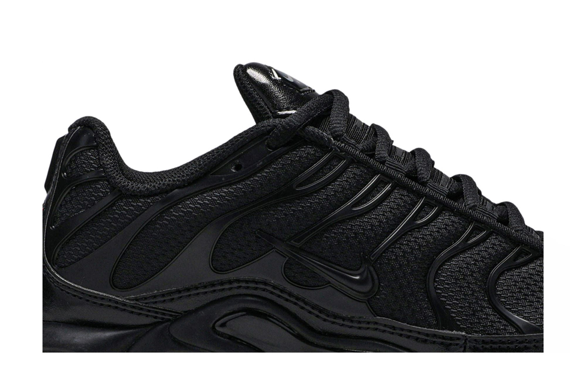 Der Nike Air Max Plus Triple Black ist eine komplett schwarze Version des Nike Air Max Plus. Dieser Schuh wurde vor dem 20. Jubiläum des Nike Air Max Plus auf den Markt gebracht und verfügt über ein atmungsaktives Synthetik-Obermaterial mit geschlossenen Mesh-Einsätzen und TPU-Rippen eckig, eine äußere Zehenkappe, ein strukturiertes Knöchelband und ein niedriger Schutzblech. Außerdem verfügt er über eine leichte Zwischensohle mit Tuned Air-Technologie und eine Max Air-Außensohle.