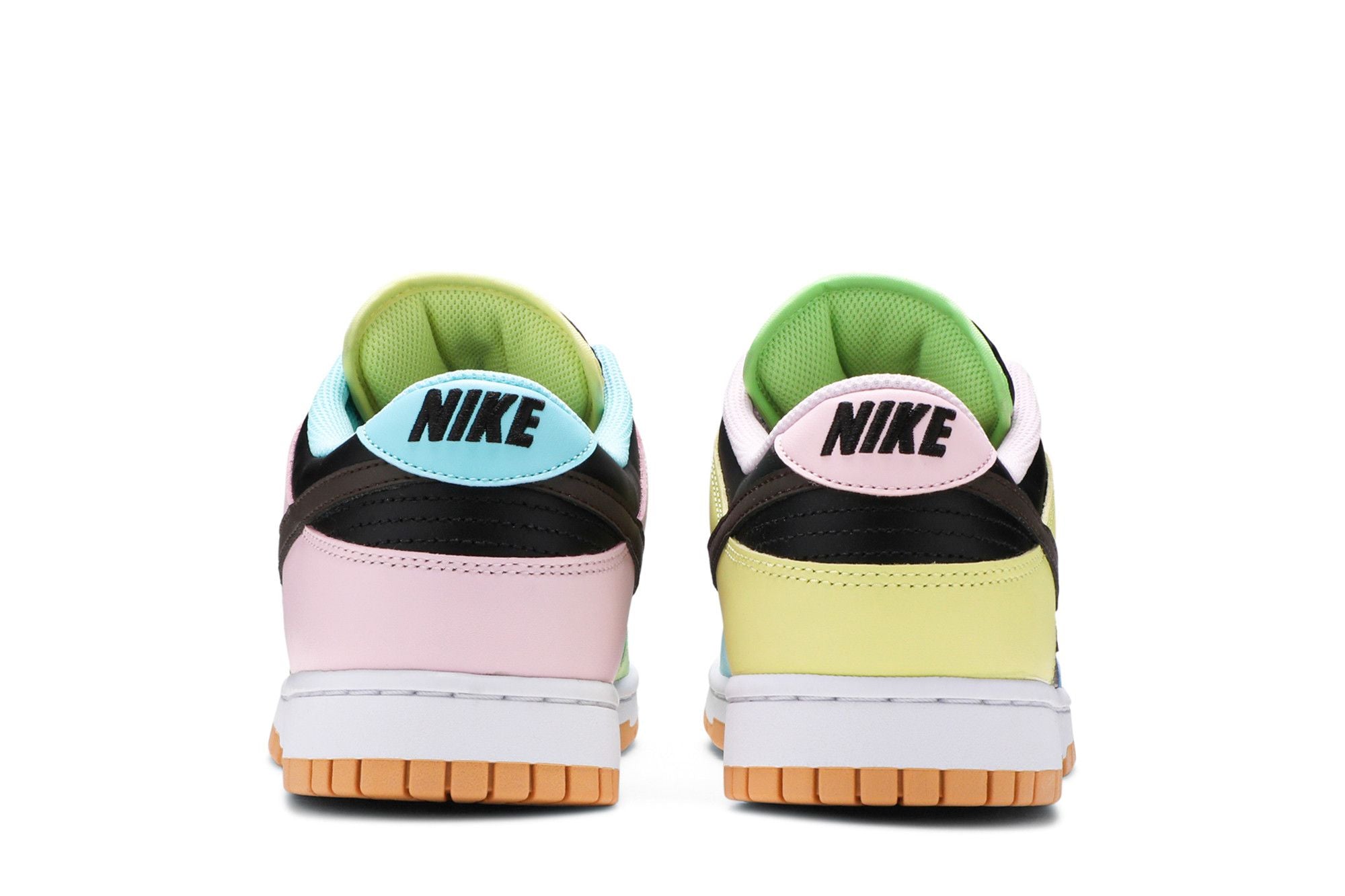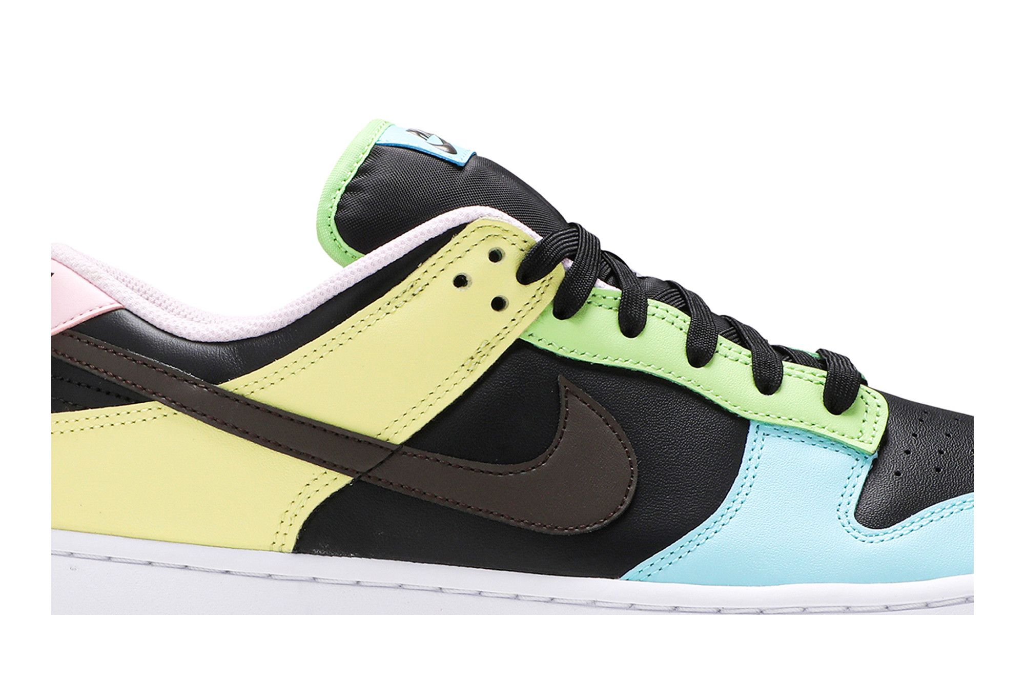 La Nike Dunk Low Free.99 si contraddistingue per il suo design unico, con un'estremità superiore in pelle nera e sovrapposizioni multicolore pastello. Le sue caratteristiche distinctive includono le swooshes color Cioccolato Scuro e le suole interne che presentano grafici di etichette di prezzo con il testo "Free.99" stampato come prezzo, in perfetta armonia con il suo nome.