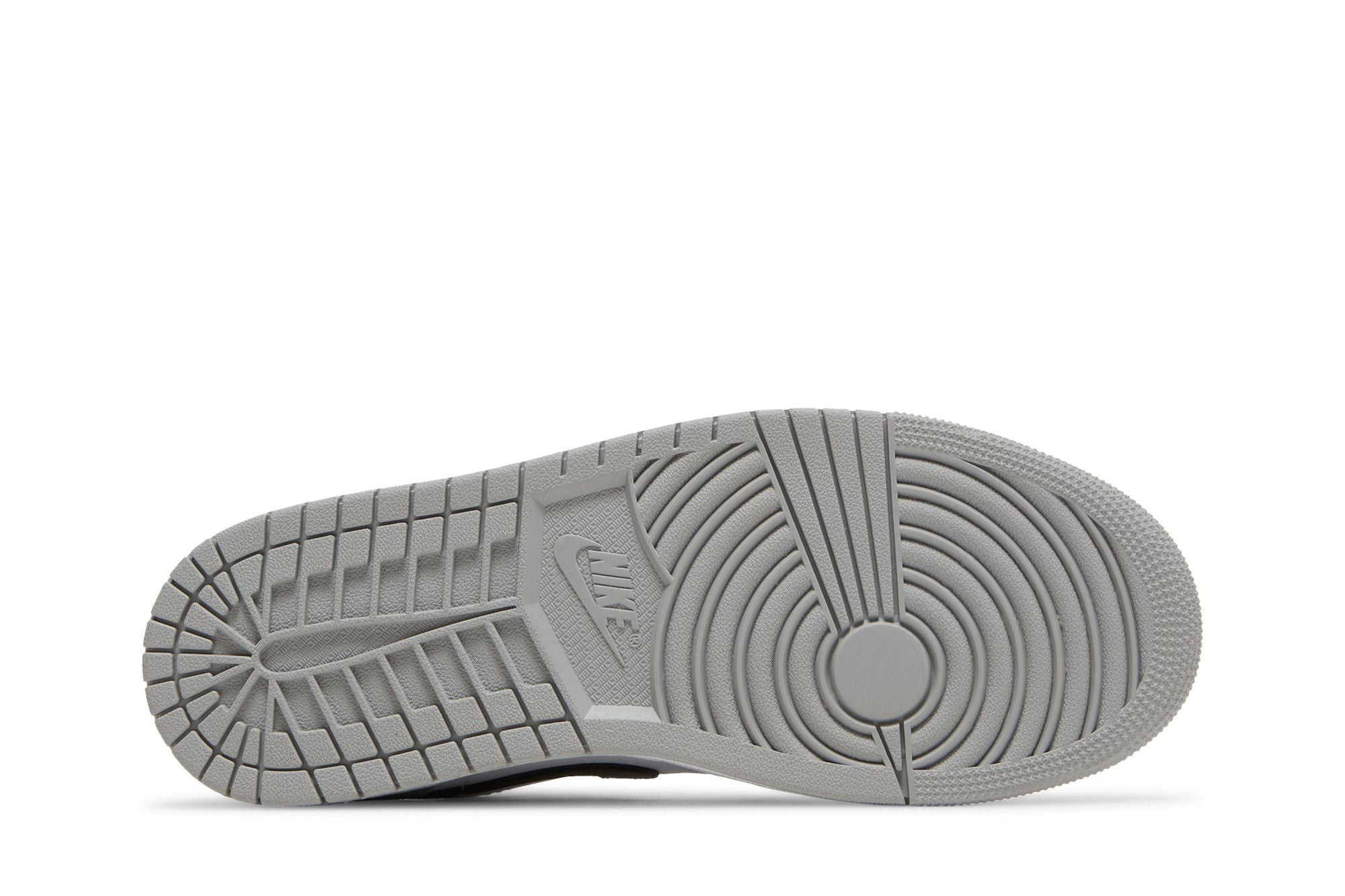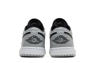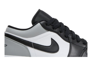 Das Obermaterial des Jordan 1 Low Shadow Toe besteht aus Glattleder und Wildleder, mit einer Kombination aus Grau- und Schwarztönen, die einen Schatteneffekt erzeugen. Die Vorderseite weist die klassische abgerundete Spitze auf, während die Rückseite niedrig ist, um einen lässigeren und leichteren Look zu bieten.