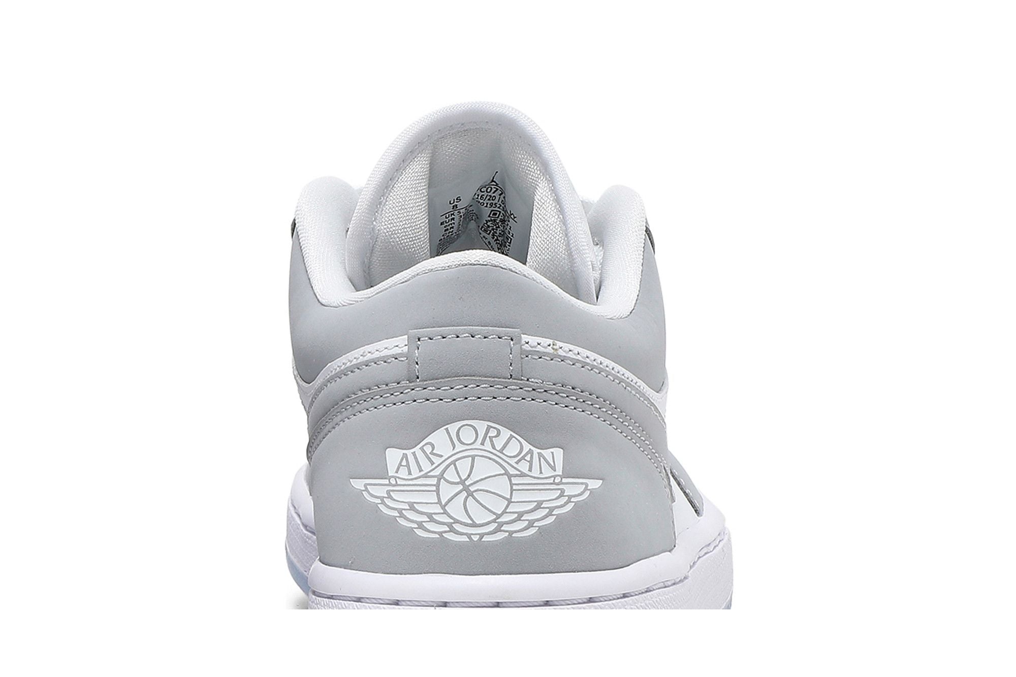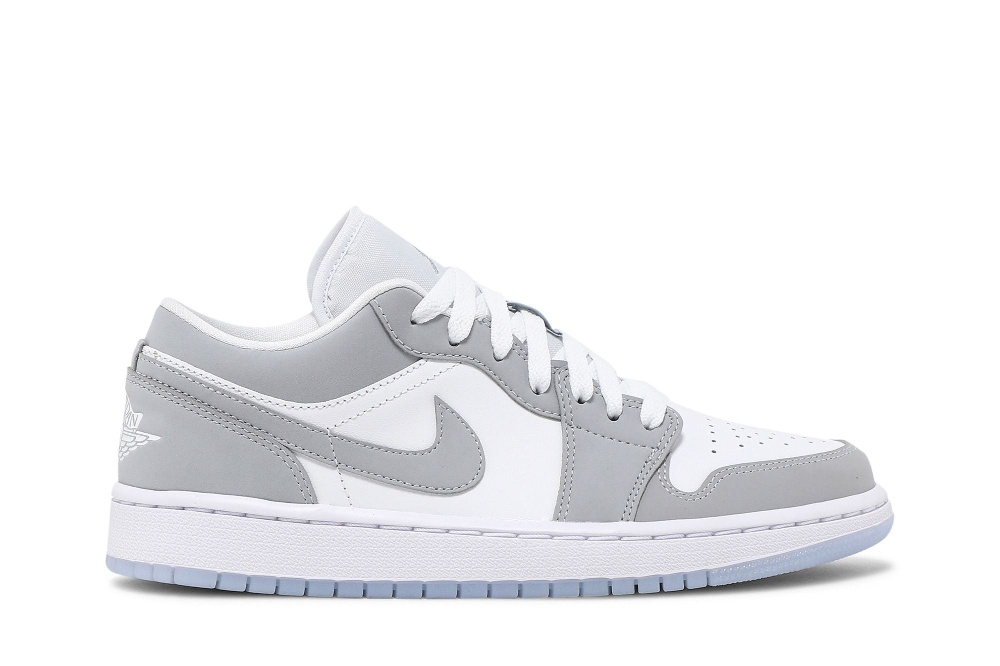 Der Jordan 1 Low Wolf Grey (W) verfügt über ein Obermaterial aus weißem Leder mit Durabuck-Overlays und Swoosh in Wolf Grey. Ein Jordan Wings-Logo an der Ferse und eine durchsichtige Außensohle verleihen den letzten Schliff. Die vollständigen Spezifikationen finden Sie unter Nike