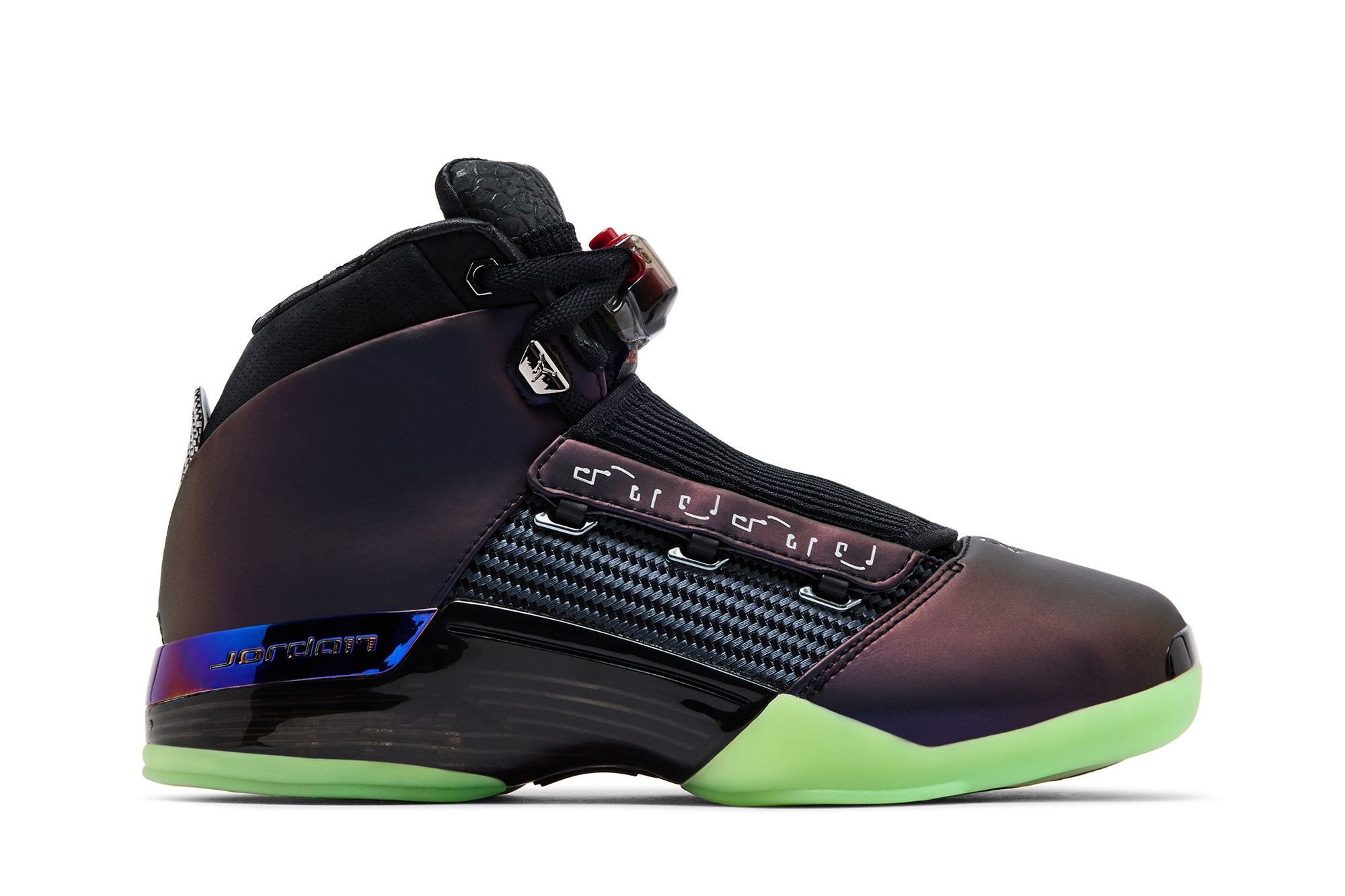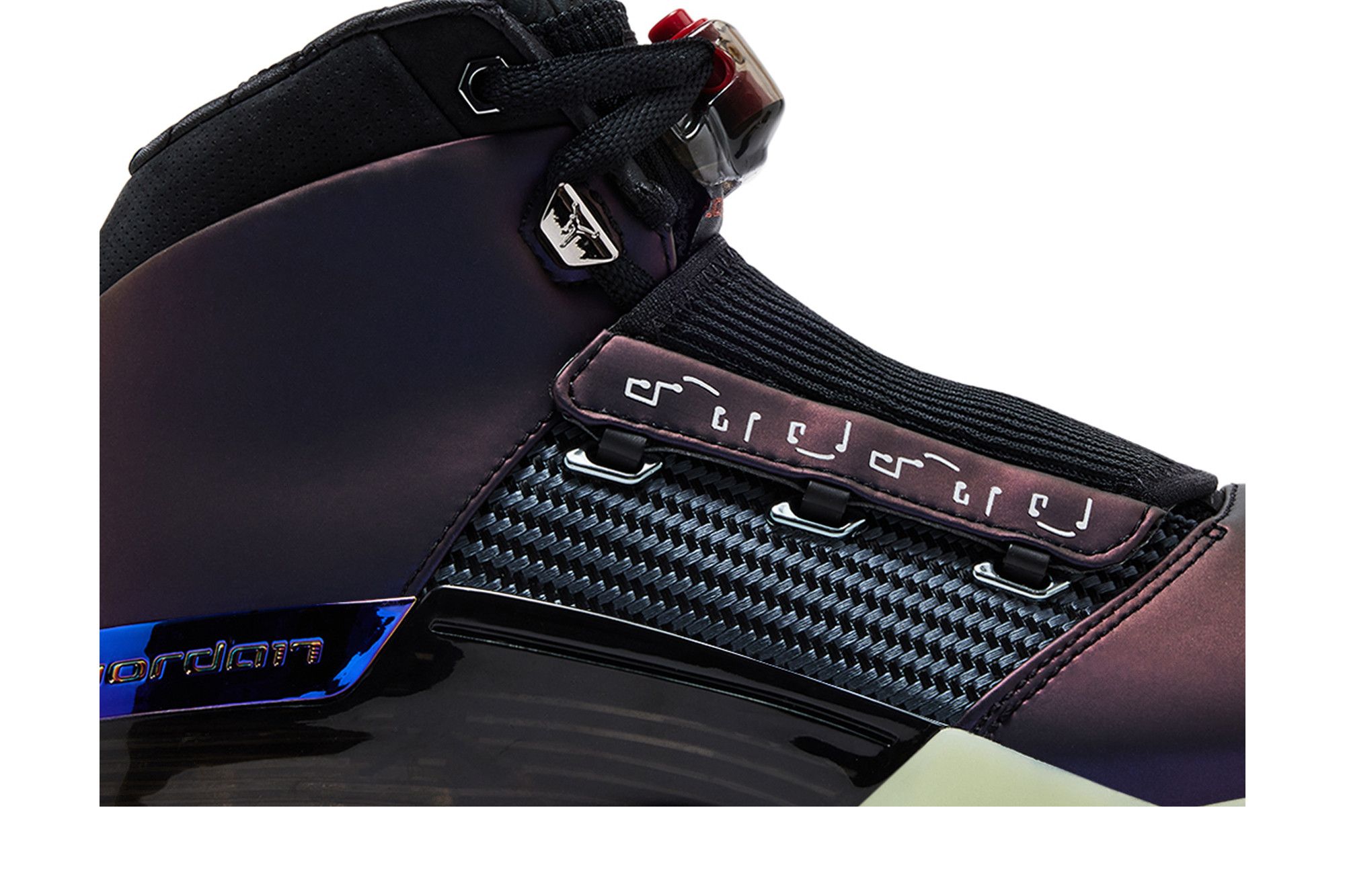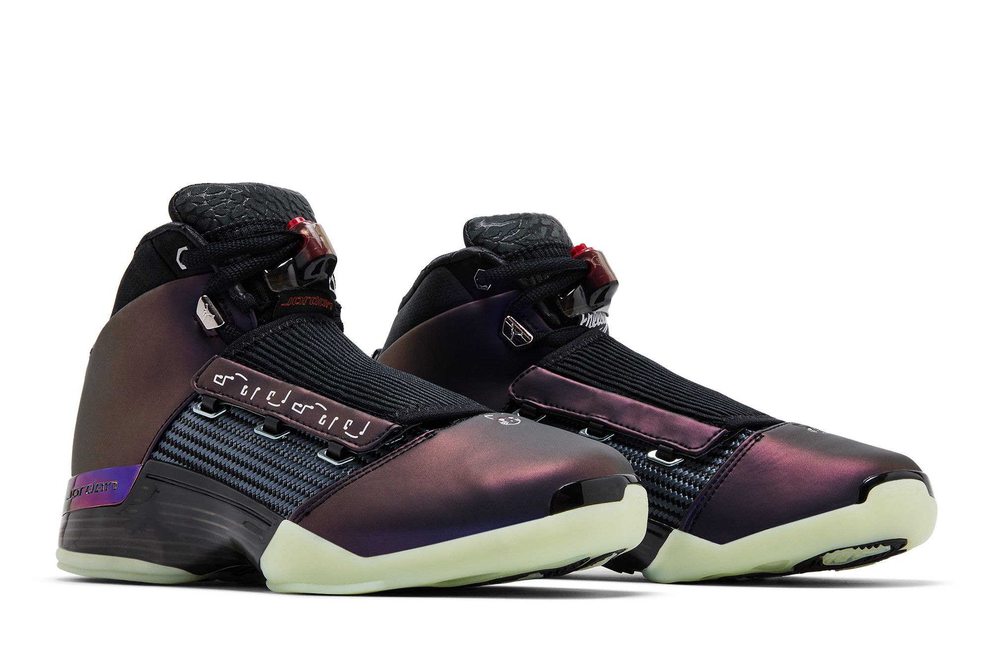 Le sneakers Jordan 17 Retro Doernbecher Zach Rumbaugh sono un modello unico e moderno, caratterizzato da una combinazione di materiali innovativi e design accattivante. La tomaia è realizzata con un materiale sintetico che presenta un effetto cangiante, con sfumature di colore che vanno dal nero al viola. La parte posteriore della scarpa è alta e presenta un design sportivo, con una linguetta imbottita e un sistema di lacciatura con fibbie metalliche. La suola è bianca e presenta un design a onde, mentre la parte inferiore è realizzata con un materiale gommoso. Il tallone posteriore presenta il logo "Jordan" inciso. Queste sneakers sono disponibili in una varietà di colori, ma nella foto è visibile solo la versione nera.
