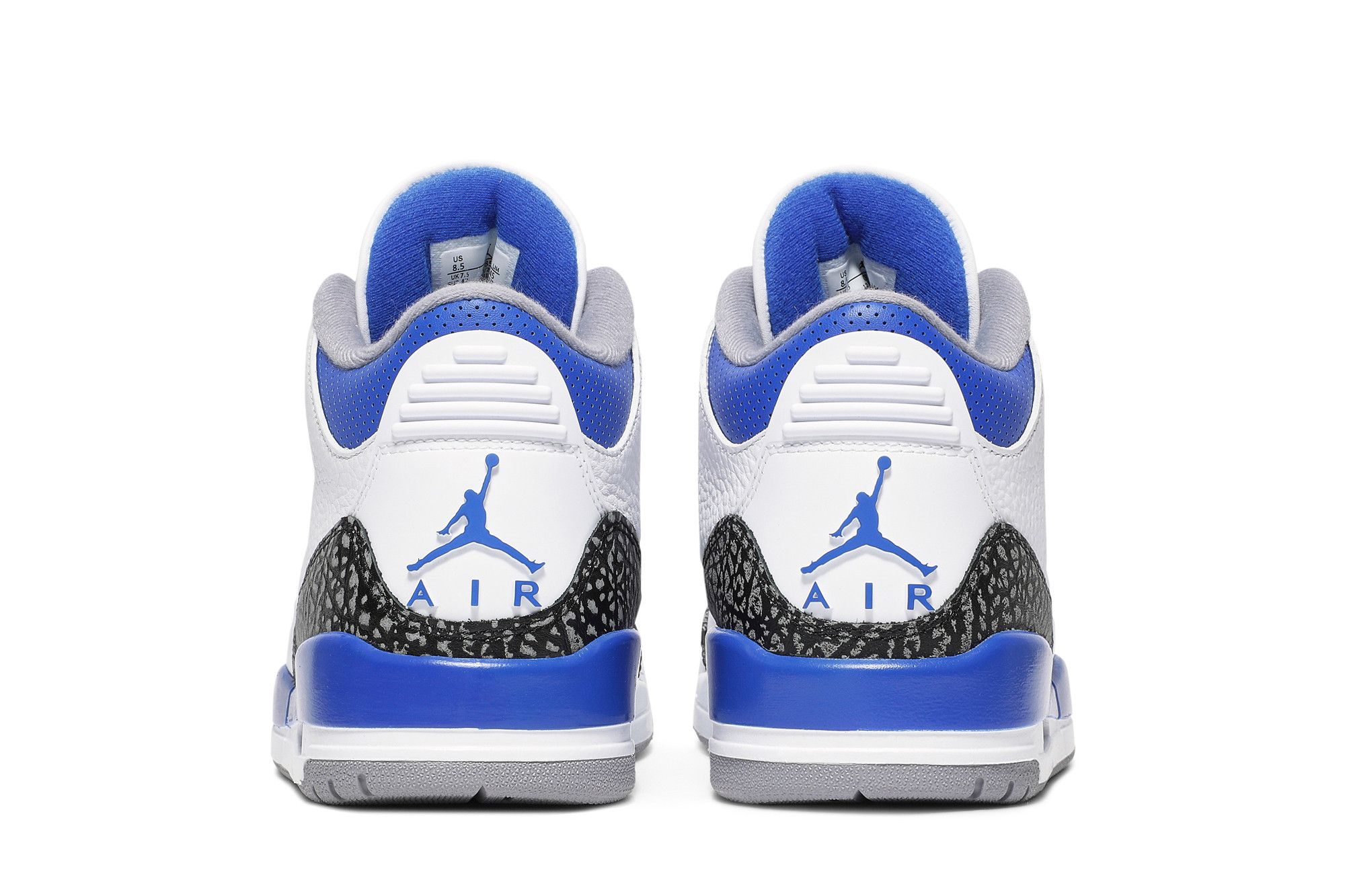 Der Air Jordan 3 Retro Racer Blue verfügt über ein weißes Obermaterial aus genarbtem Leder, kombiniert mit dem Elefantenaufdruck an der Ferse und am Schutzblech. Es gibt mehrere leuchtend blaue Akzente am Kragen, an der Zunge und an der Zwischensohle. Weitere graue Akzente an den Ösen und der Außensohle runden den Look ab. Alle Spezifikationen finden Sie auf Nike.