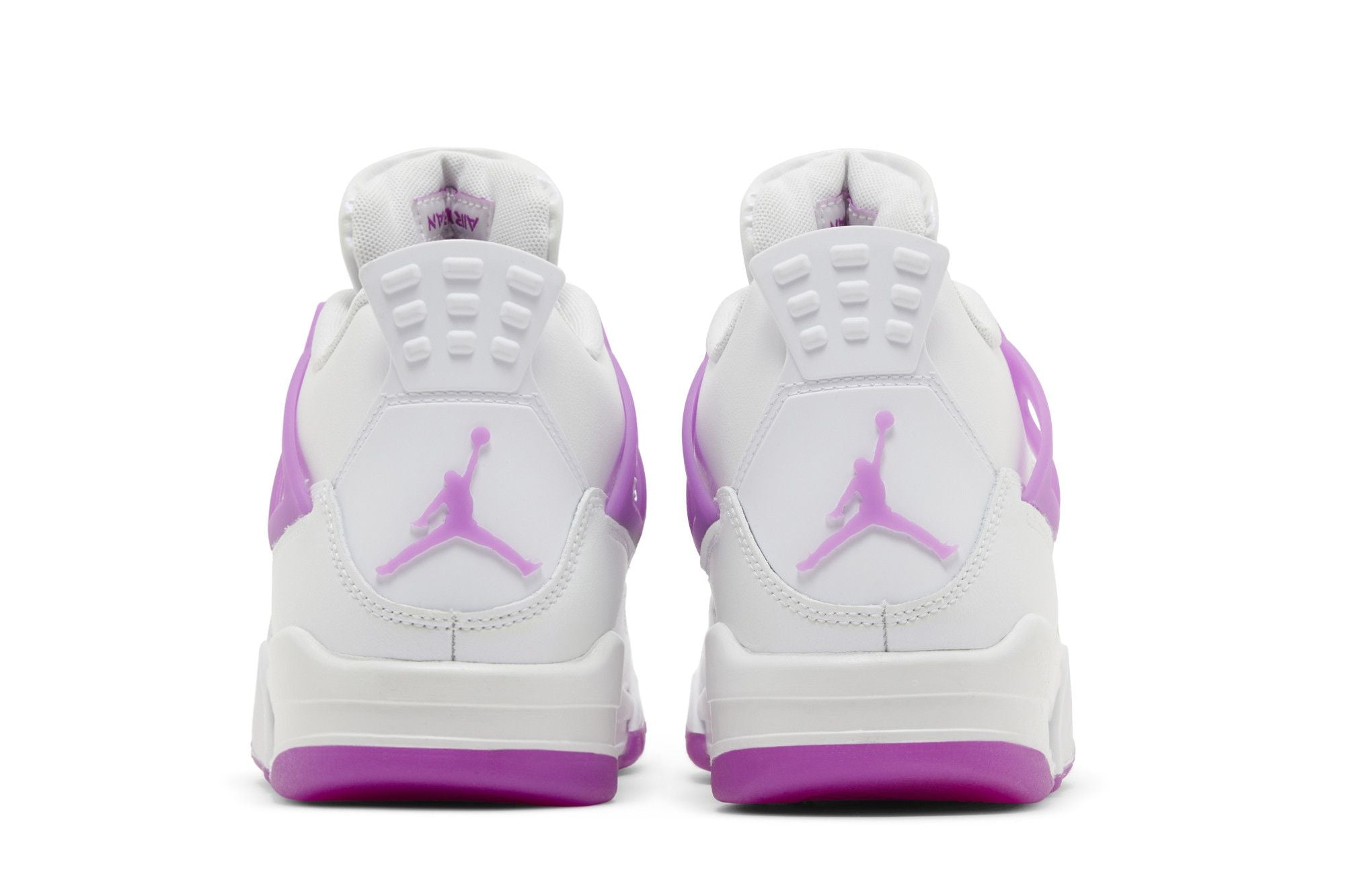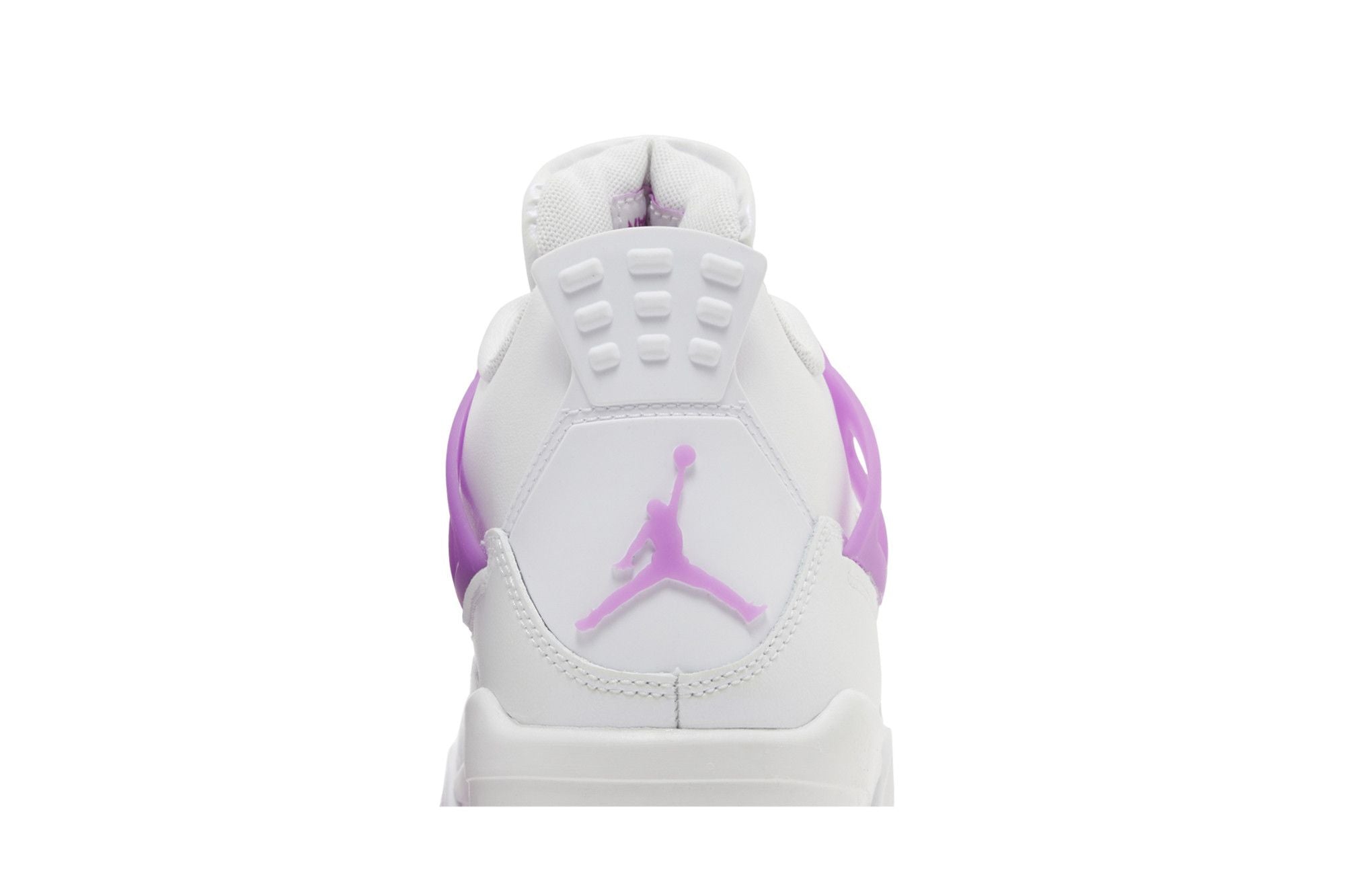 Dieser Air Jordan 4 Hyper Violet verfügt über eine weiße Lederbasis, die als Hintergrund für die auffälligen violetten Akzente dient. Diese dynamischen Details finden sich an den Ösen, dem Logo und der Zwischensohle und sorgen für einen kräftigen Kontrast, der ins Auge fällt.