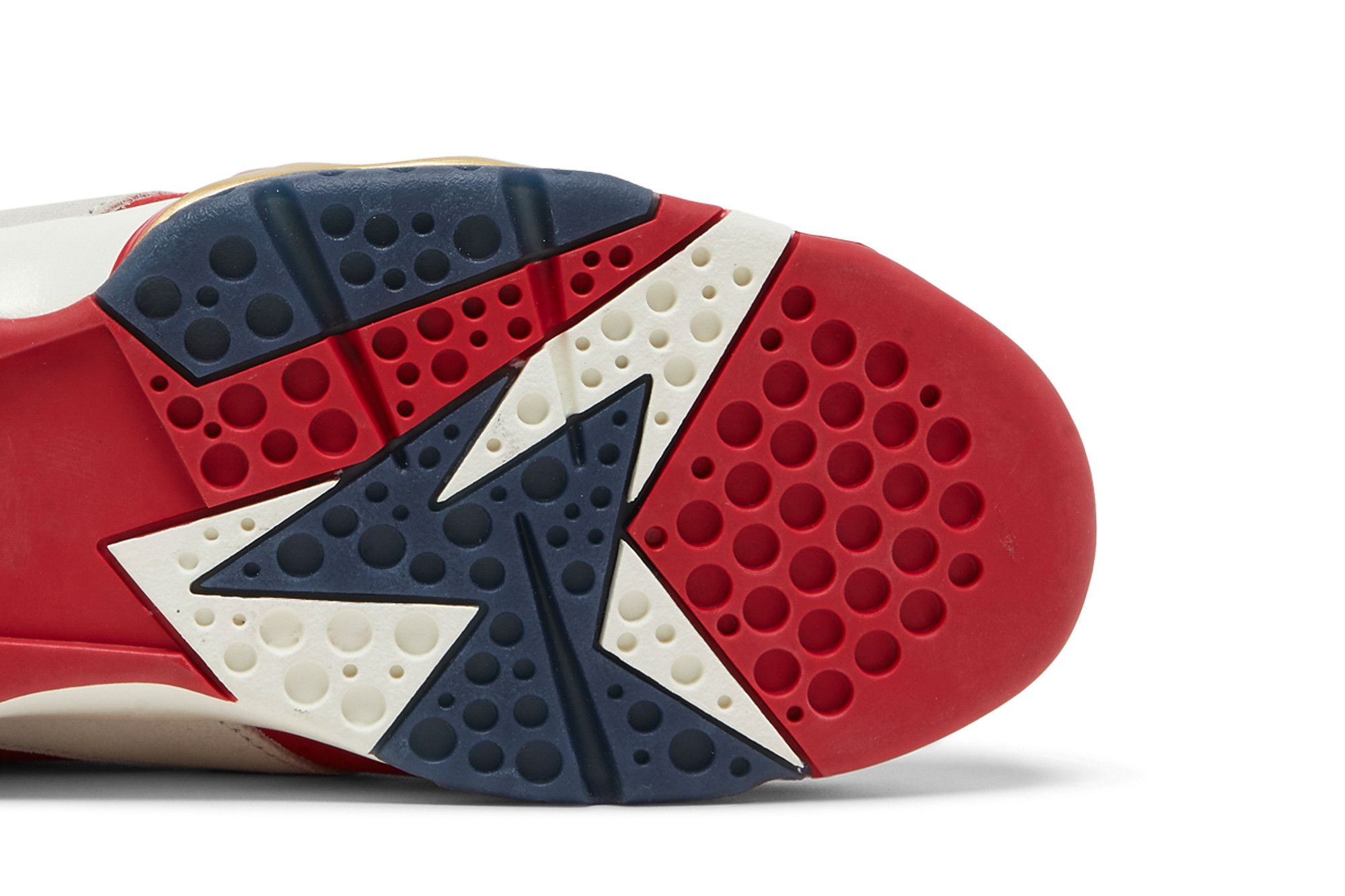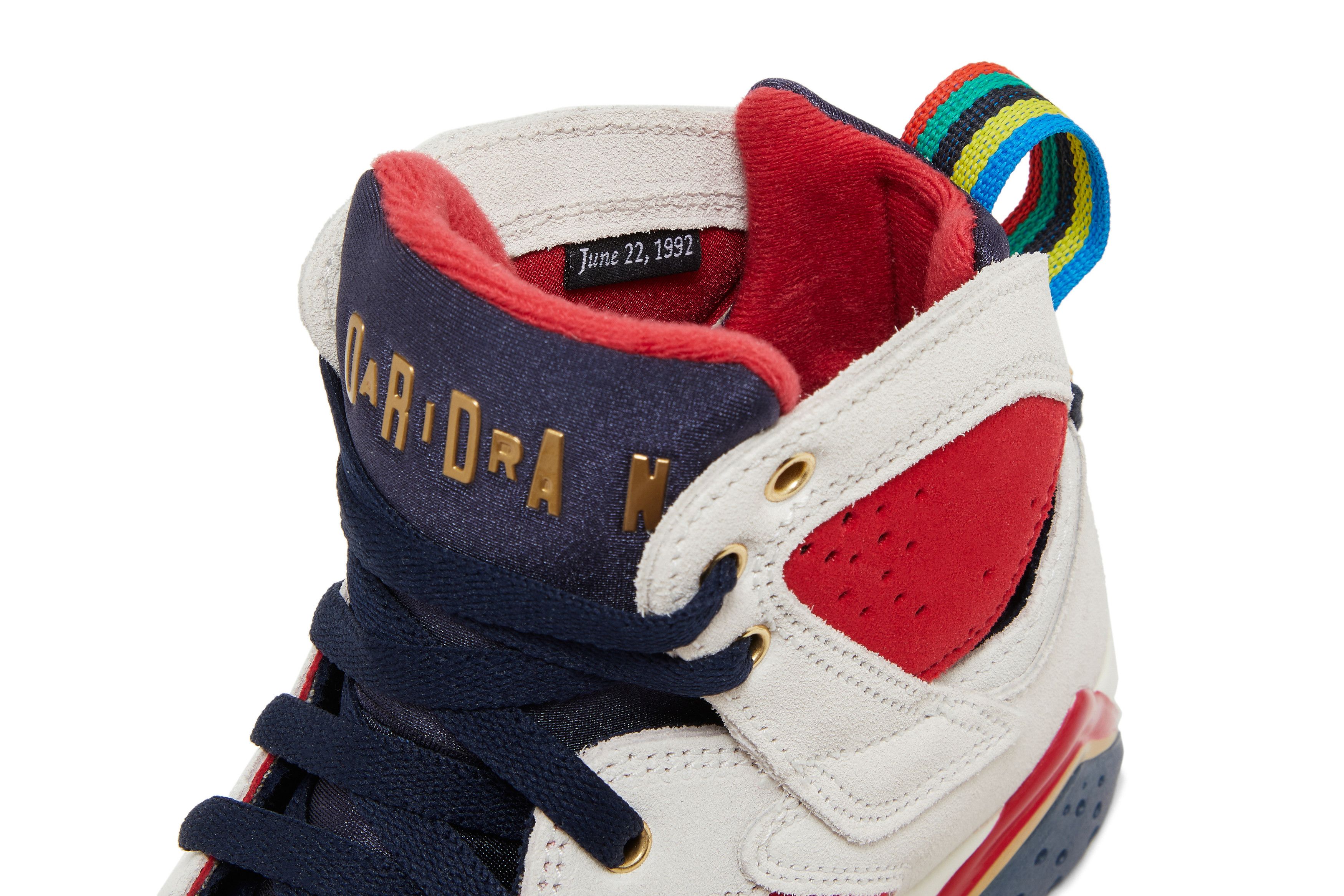 Die Air Jordan 7 Trophy Room Olympics werden in einer farbenfrohen Hommage an die Olympischen Spiele 1992 enthüllt, bei denen das Dream Team geboren wurde. So finden wir eine rote Wildlederbasis, begleitet von cremefarbenen Wildlederüberzügen und einer marineblauen Zunge. Wir bemerken auch einige goldene Details wie den Jumpman am Knöchel, aber auch das Branding an der Ferse, auf dem wir auf der einen Seite das Trophy Room-Logo und auf der anderen die Nummer 9 von Michael Jordan sehen können, nicht weit von MJs eingelegter Unterschrift entfernt. Schließlich greift die hintere Spurstange den Farbcode der Olympischen Ringe auf. Alle Spezifikationen finden Sie auf Nike.
