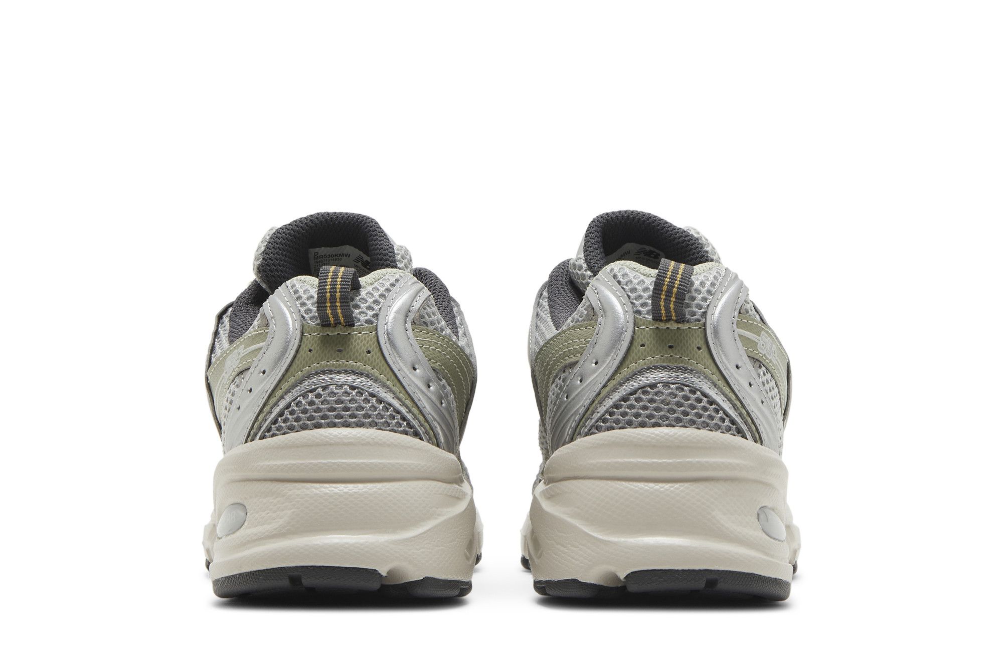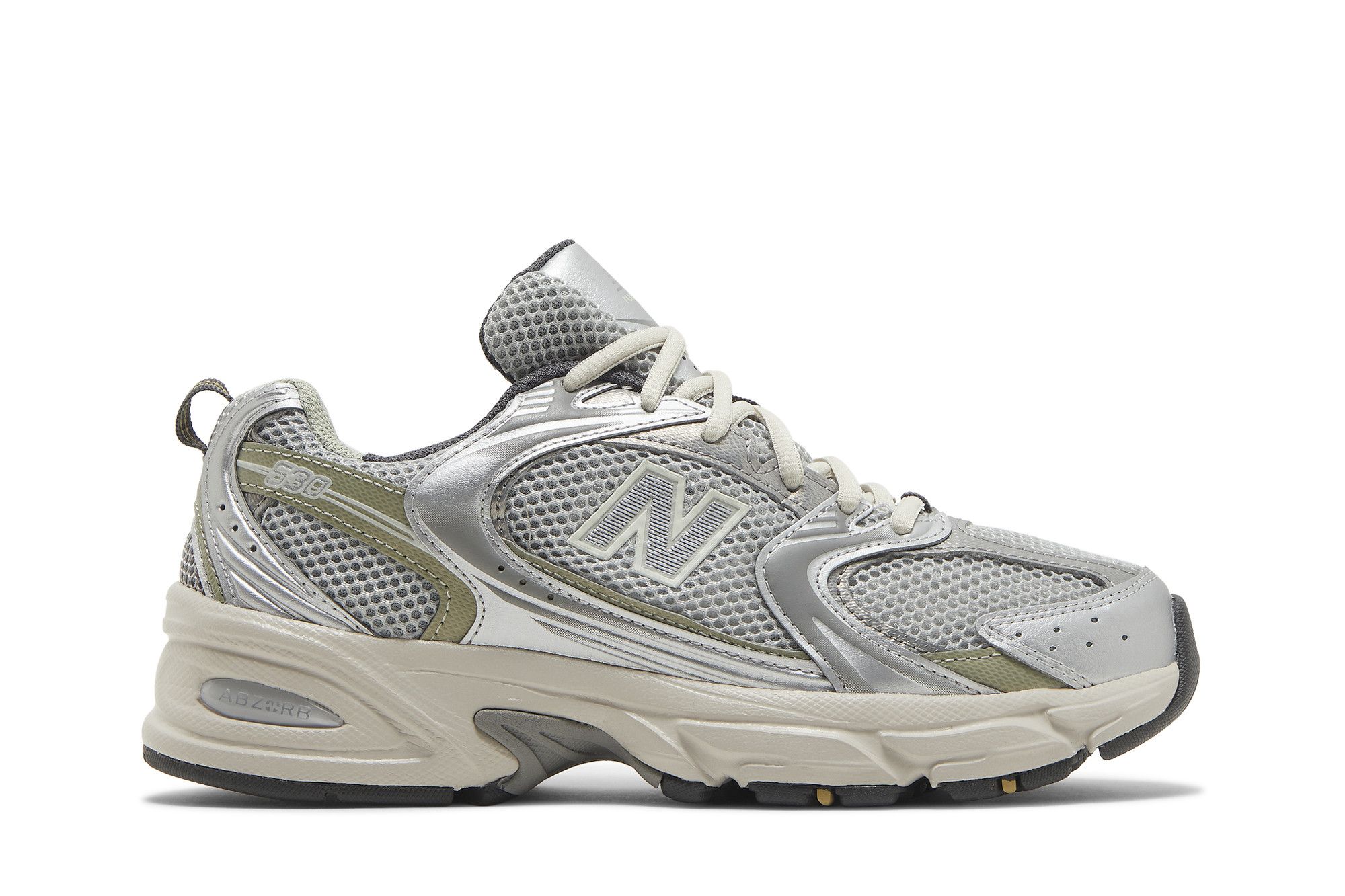 Scopri il New Balance 530 Silver Khaki, una scarpa da corsa innovativa e confortevole. Realizzata in una combinazione di materiali sintetici e mesh, questa sneaker presenta una tomaia grigia e beige con dettagli metallici. La sua suola bianca e nera offre un'ottima ammortizzazione, mentre il design accattivante con il logo "N" in bianco sulla fiancata la rende unica. I dettagli in beige e grigio creano un look moderno e versatile, adatto a diversi outfit.