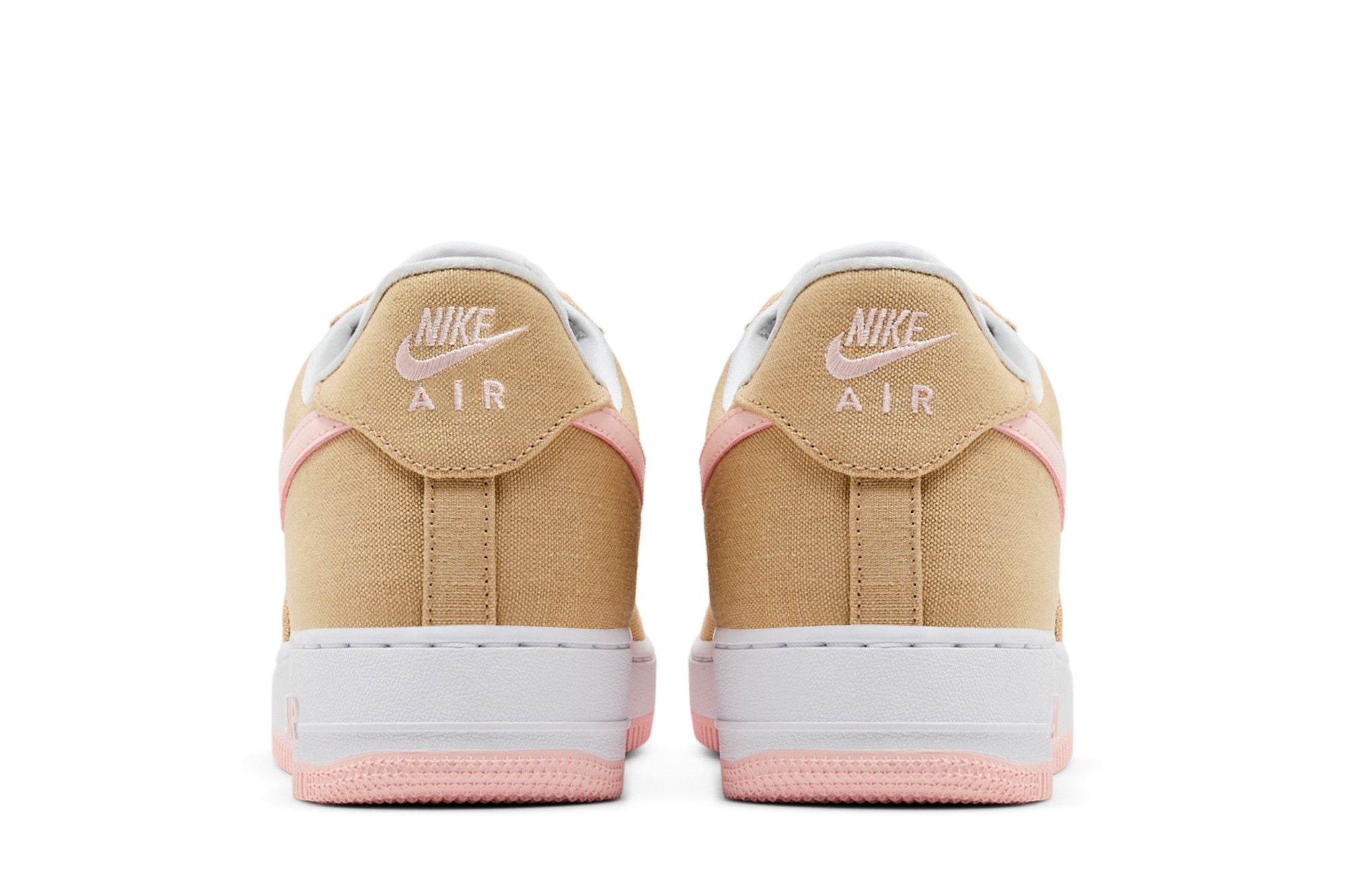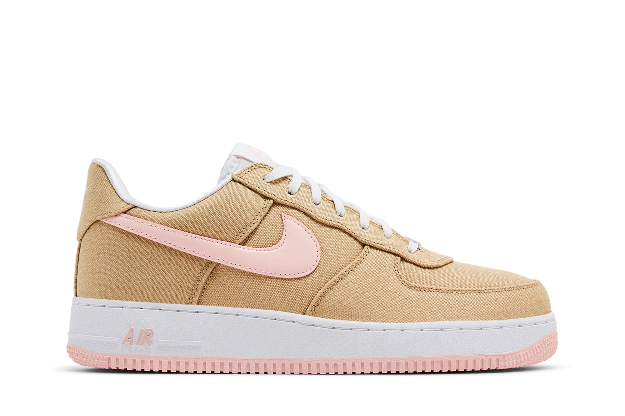 Nike Air Force1 Low Linen Canvas è una scarpa dalle linee classiche e minimali, realizzata in canvas di lino. La tomaia è di colore beige con una prominente logo Nike in pelle rosa. La suola è bianca con una parte inferiore rosa, mentre la linguetta e i lacci sono bianchi. Gli elementi di design sono essenziali e moderni, con un tocco di eleganza grazie al materiale in lino.