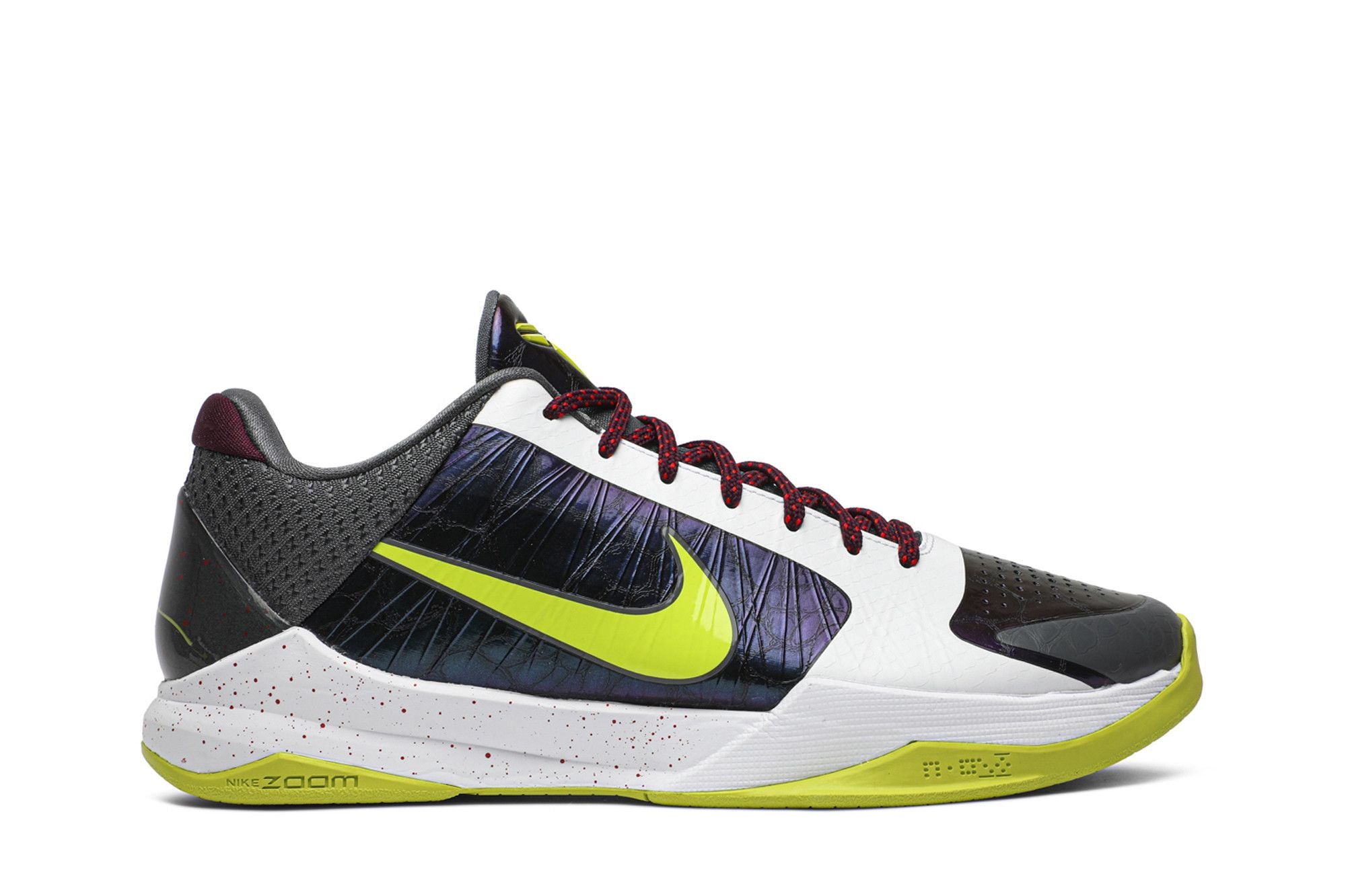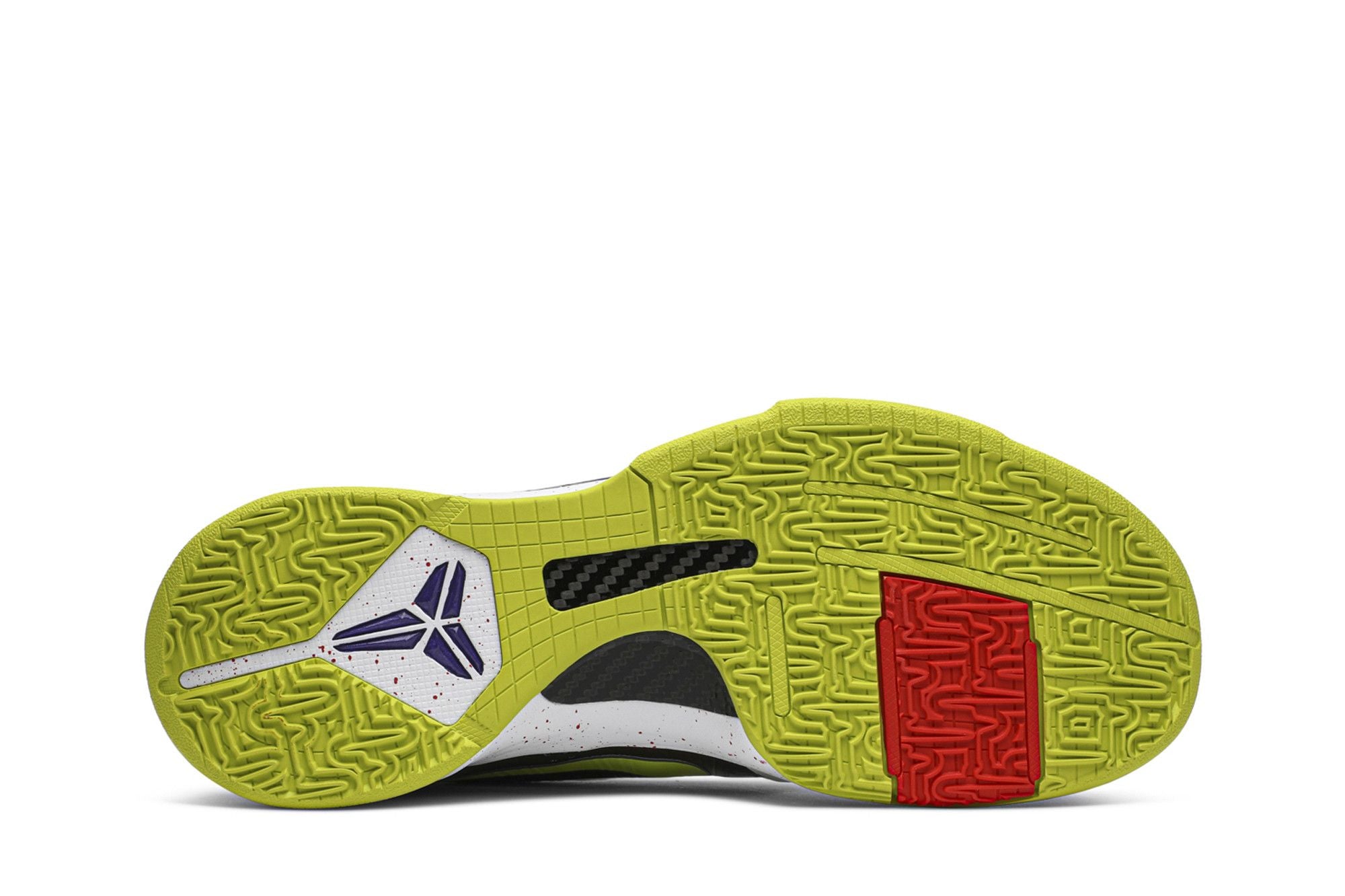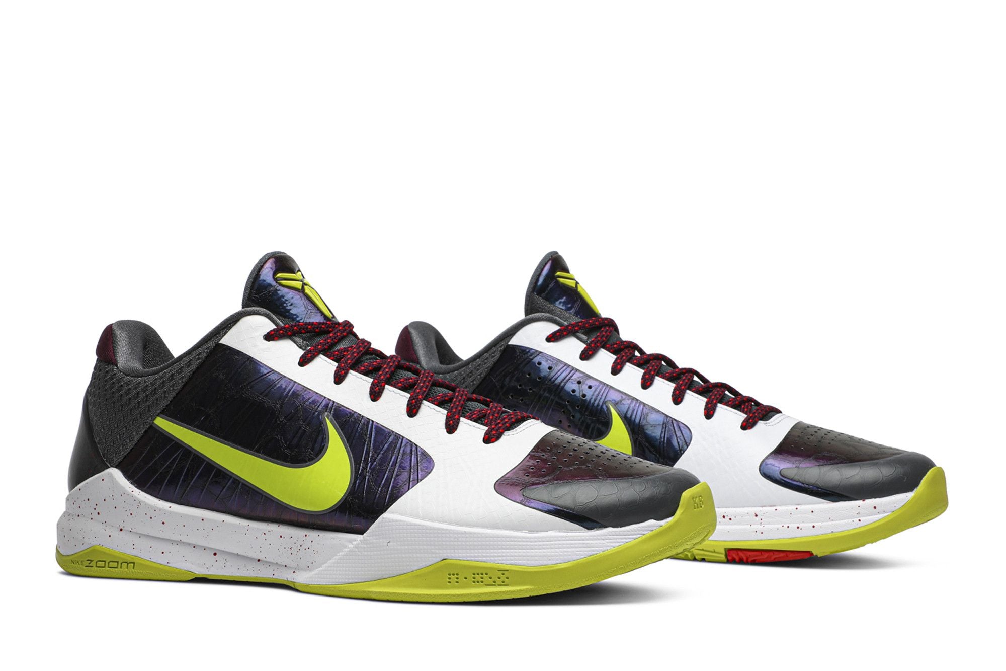La Kobe 5 Protro Chaos rappresenta un omaggio al personaggio di Joker interpretato da Heath Ledger in "The Dark Knight". Questa versione unisce tecnologia avanzata e materiali di alta qualità, con un design che include un upper in FlyWire camouflage con sovrapposizioni bianche e grigio carbone. Il midsole bianco con puntini rossi, il tallone in verde lime e il marchio Swoosh verde lime completano l'aspetto unico della Kobe 5 Protro Chaos.