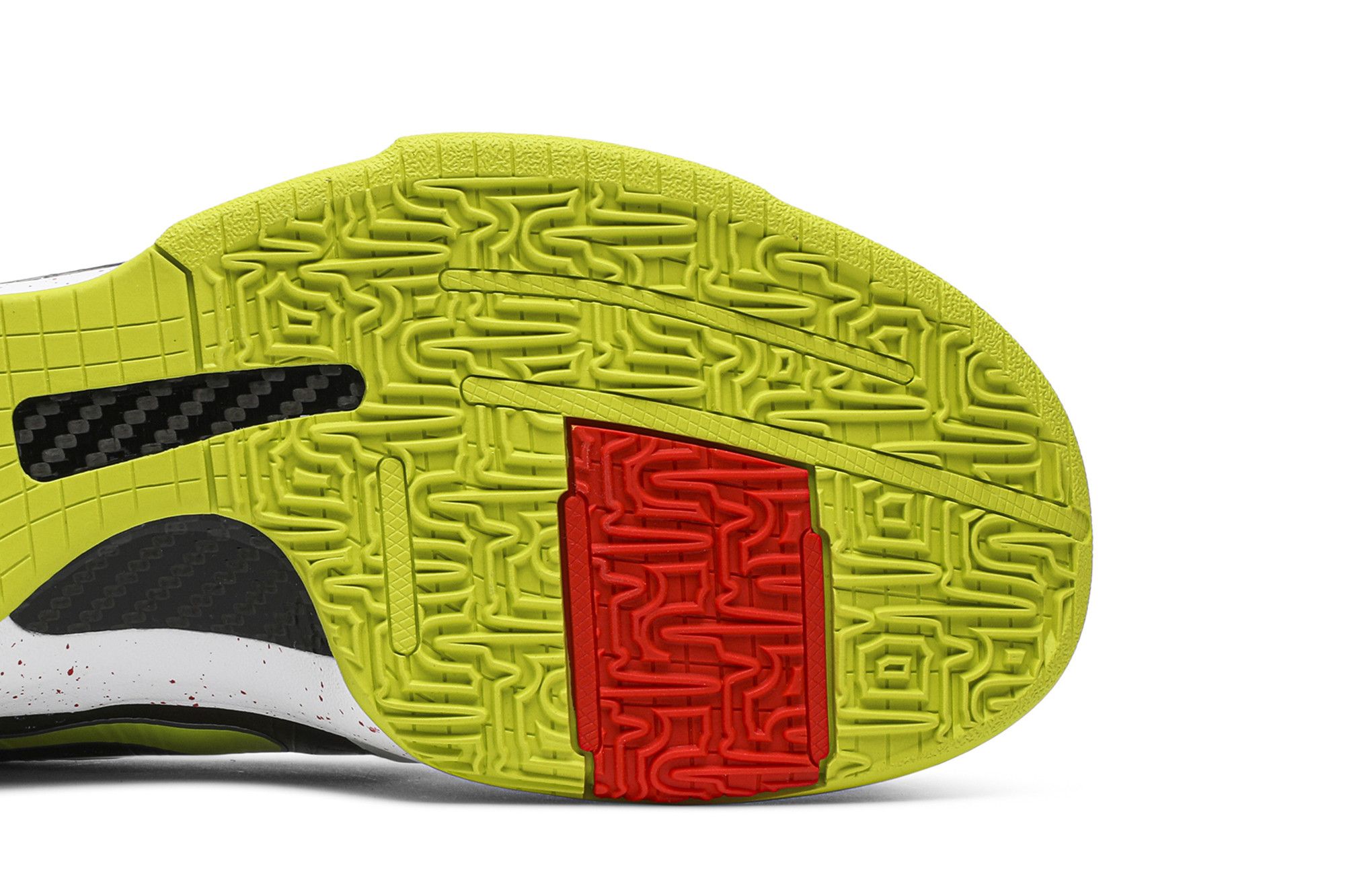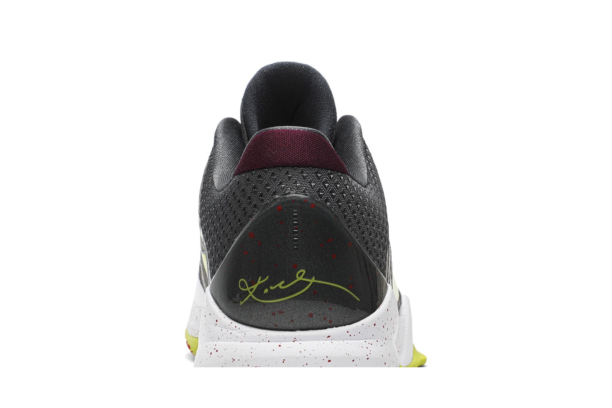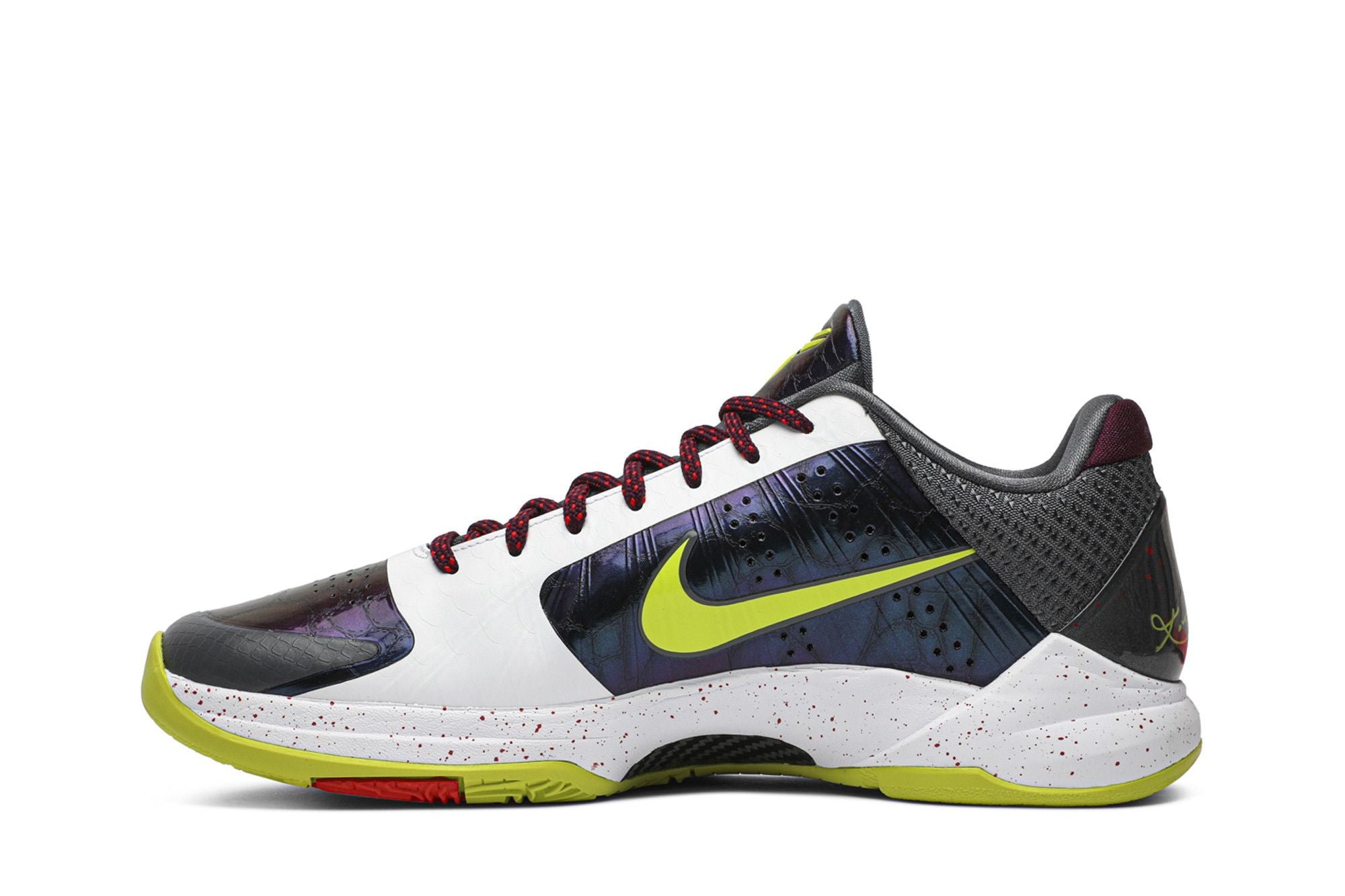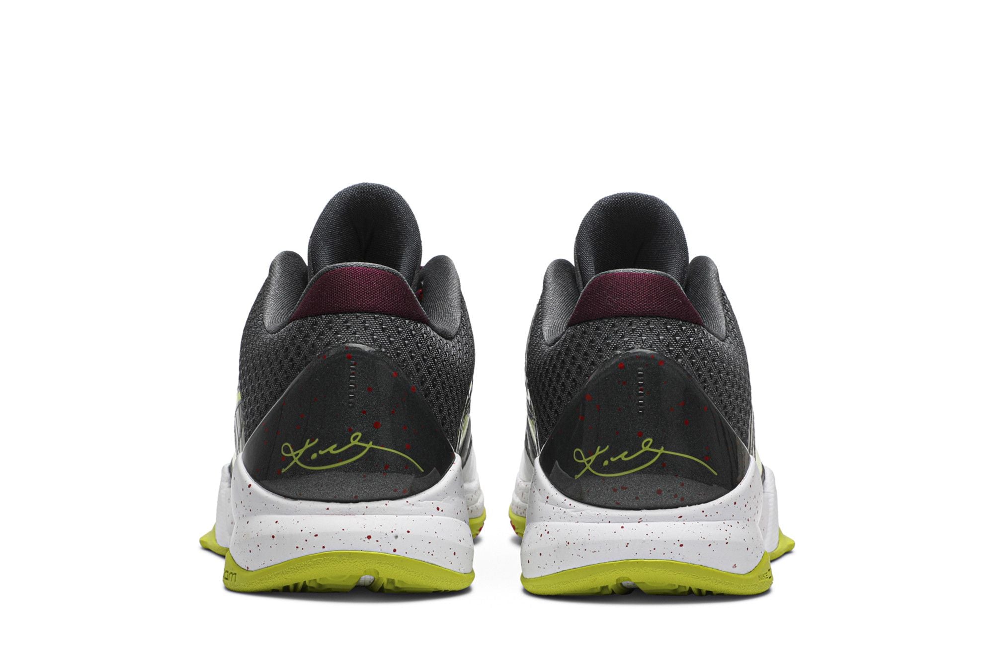 La Kobe 5 Protro Chaos rappresenta un omaggio al personaggio di Joker interpretato da Heath Ledger in "The Dark Knight". Questa versione unisce tecnologia avanzata e materiali di alta qualità, con un design che include un upper in FlyWire camouflage con sovrapposizioni bianche e grigio carbone. Il midsole bianco con puntini rossi, il tallone in verde lime e il marchio Swoosh verde lime completano l'aspetto unico della Kobe 5 Protro Chaos.
