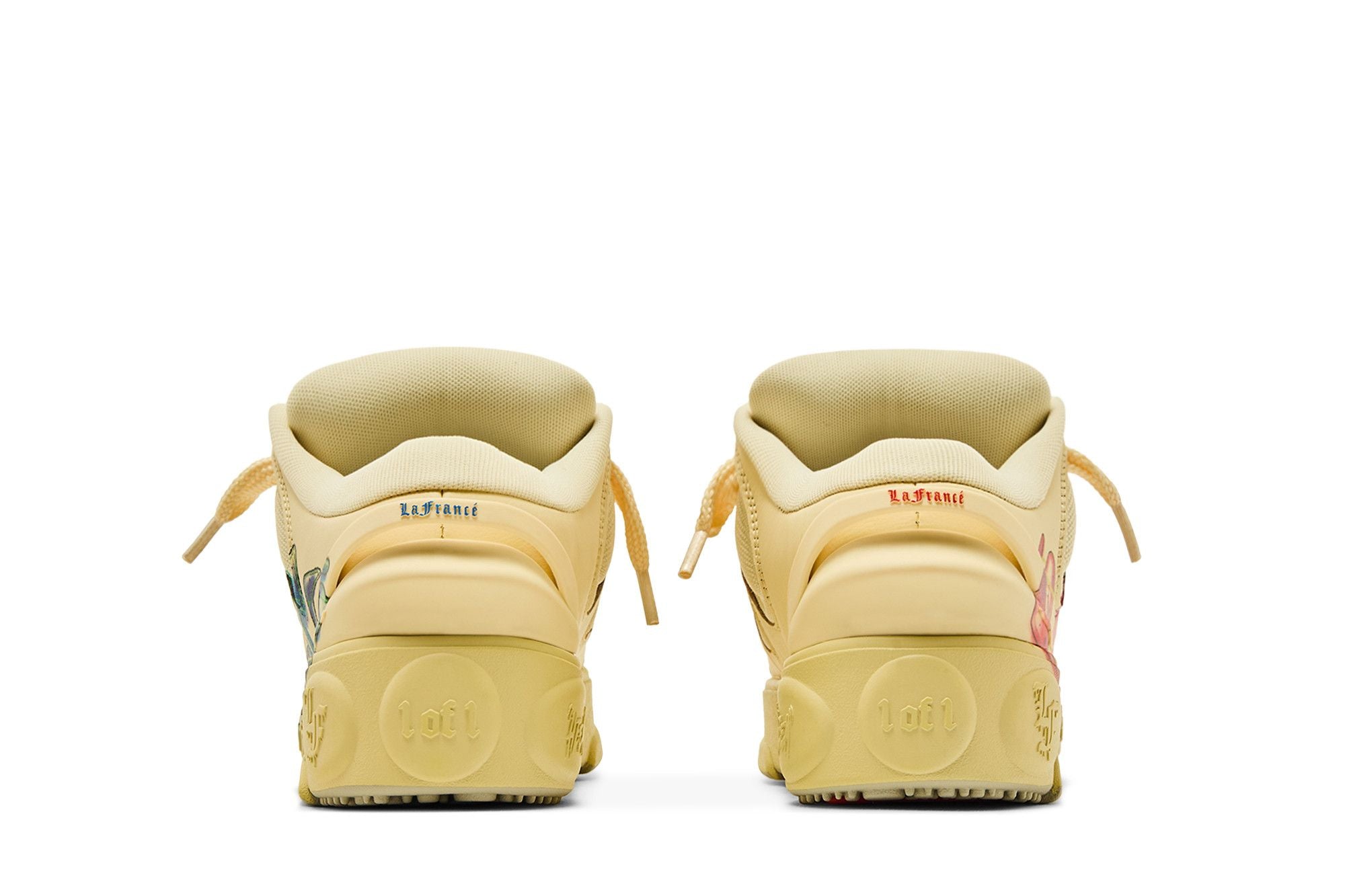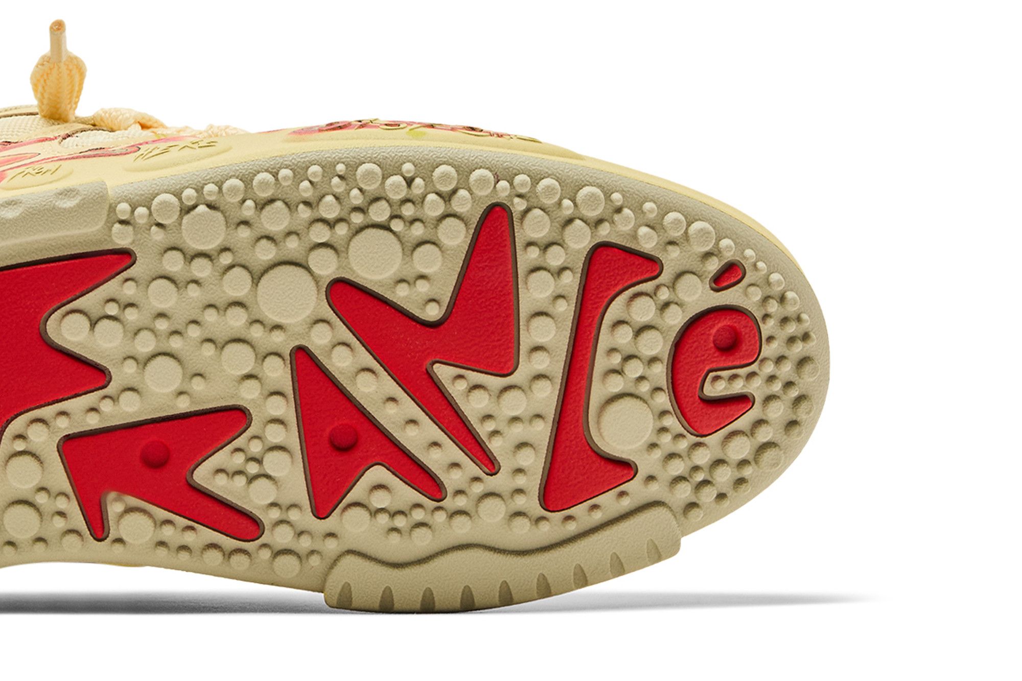 Puma LaMelo Ball LaFrancé Airbrush è una sneaker caratterizzata da una tomaia in materiale sintetico di colore beige. La parte laterale è arricchita da un design graffiti in rosso con sfumature gialle, mentre la linguetta interna presenta un accenno di colore rosso. La suola, dello stesso colore della tomaia, sembra essere realizzata in gomma. L'intero design è completato da dettagli in bianco e da una stringa bianca.