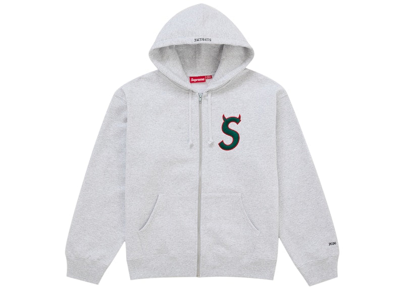 La Supreme Devil S Logo Zip Up Hooded Sweatshirt Ash Grey è una felpa con cappuccio e zip della linea streetwear del noto brand Supreme. Rilasciata il 26 marzo 2026, presenta un design caratteristico con un logo "S" diavolesco sul petto e una tinta unita grigio cenere. La felpa è realizzata in materiale morbido e presenta dettagli come tasche laterali e un cappuccio. Il look è completato da piccoli dettagli come la stampa "2026" sulla manica e il logo del marchio sull'etichetta interna.