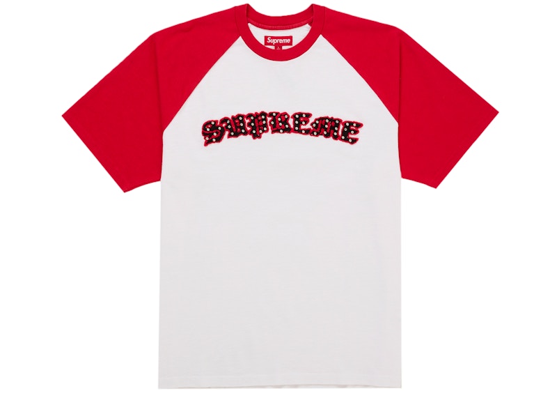 La maglietta Supreme Rhinestone Raglan S/S Top White è un capo d'abbigliamento della categoria streetwear di marca Supreme, rilasciato il 26 marzo 2026. Questa maglietta presenta un design con maniche rosse e un logo decorato con strass sulla parte frontale. Il modello è caratterizzato da un look estivo, con maniche corte. La maglietta è disponibile in colorazione bianca.