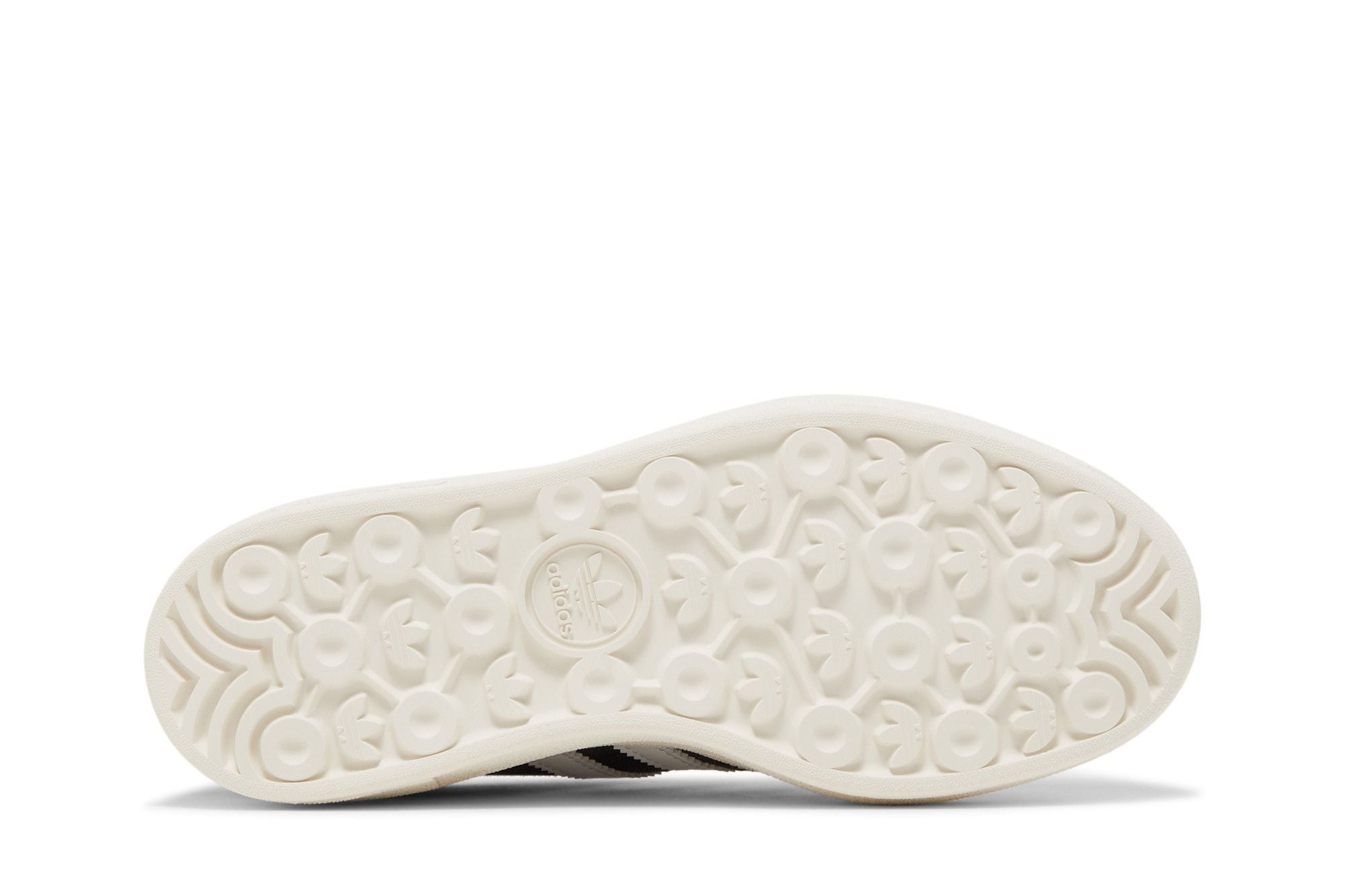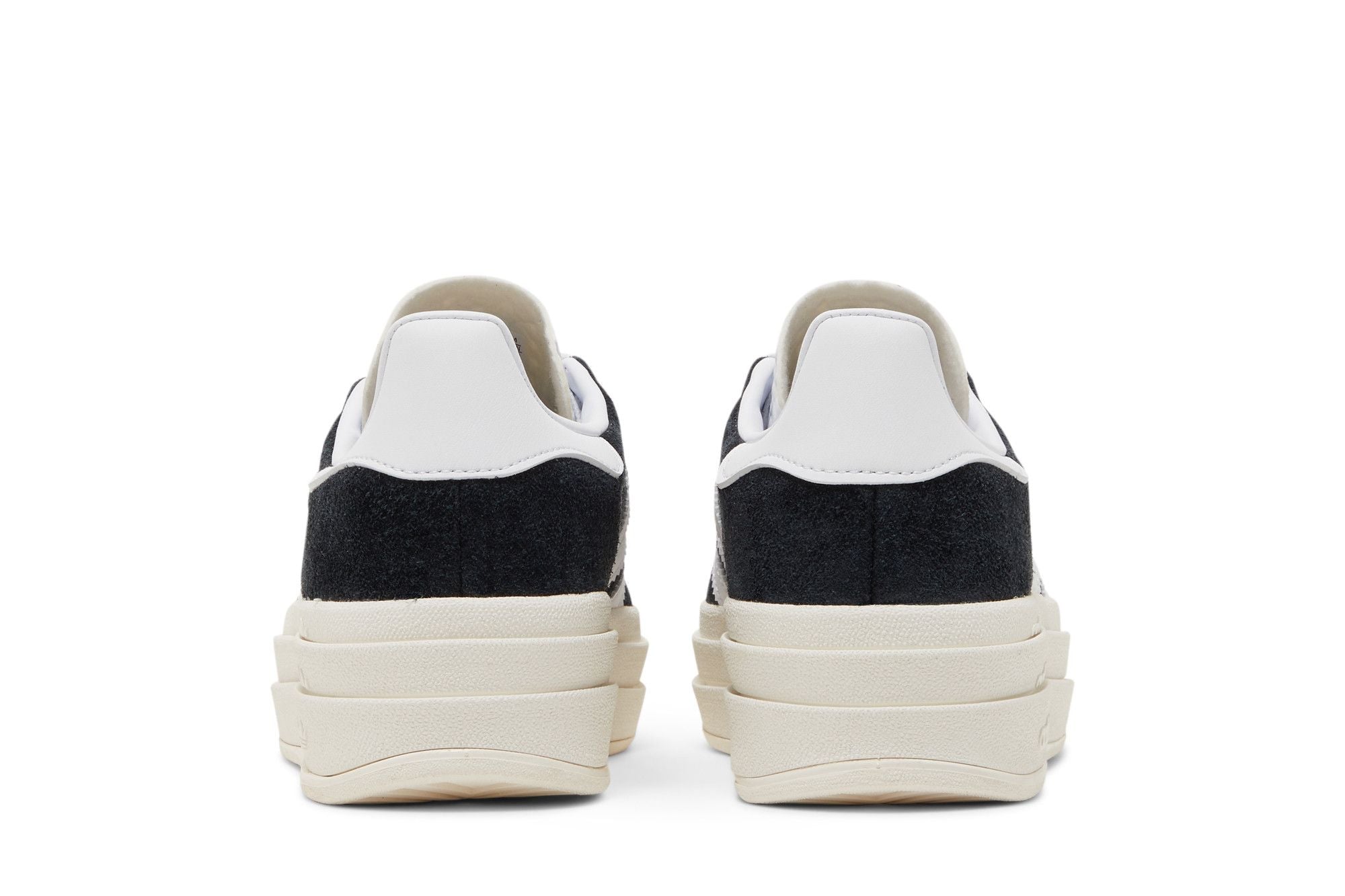 The adidas Gazelle Bold Core Black and White is a sleek sneaker that pays homage to the 1996 original with a triple-lugged rubber outsole. It features a refined design with premium suede and a T-shaped overlay on the toe. "Gazelle" lettering in gold adorns the side panel, following the serrated 3-Stripes. The sneaker boasts a Core Black, Footwear White, and Core White color scheme. The lace-up front, 3-Stripes, textured tongue, and leather heel tab are in Core White and contrast against the black base.