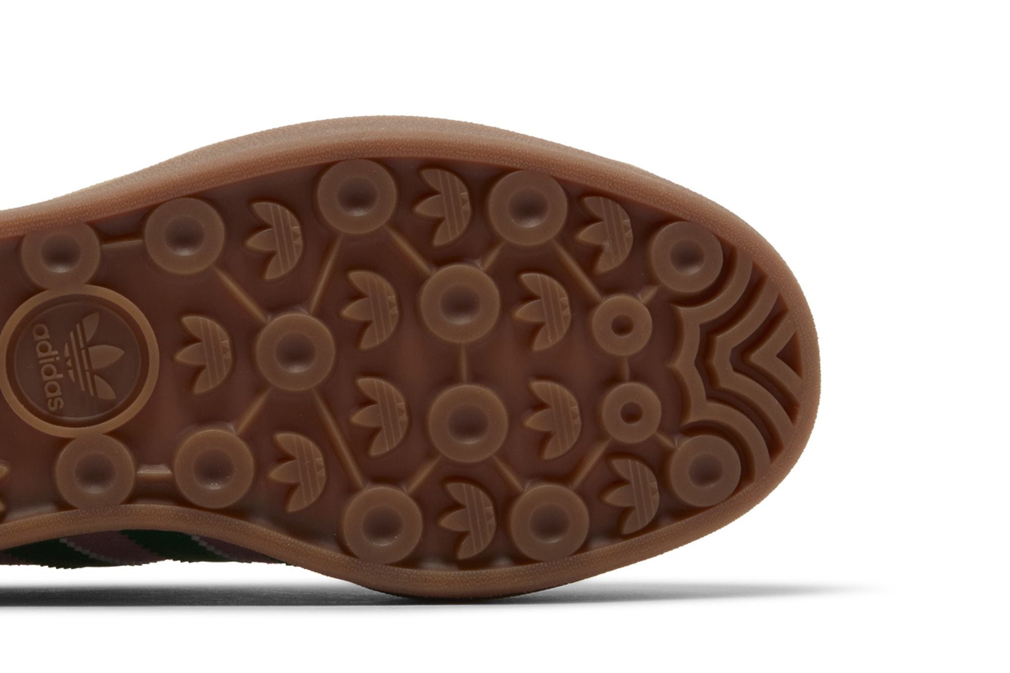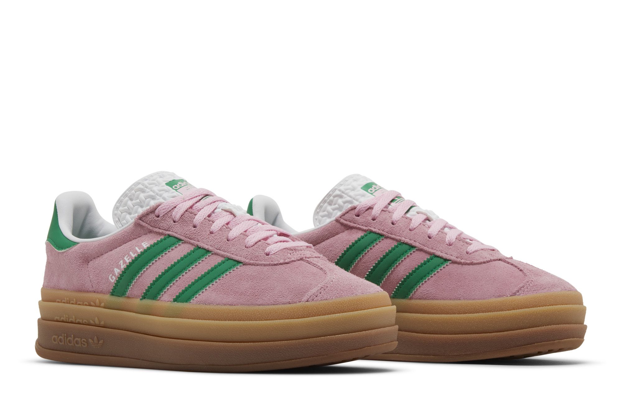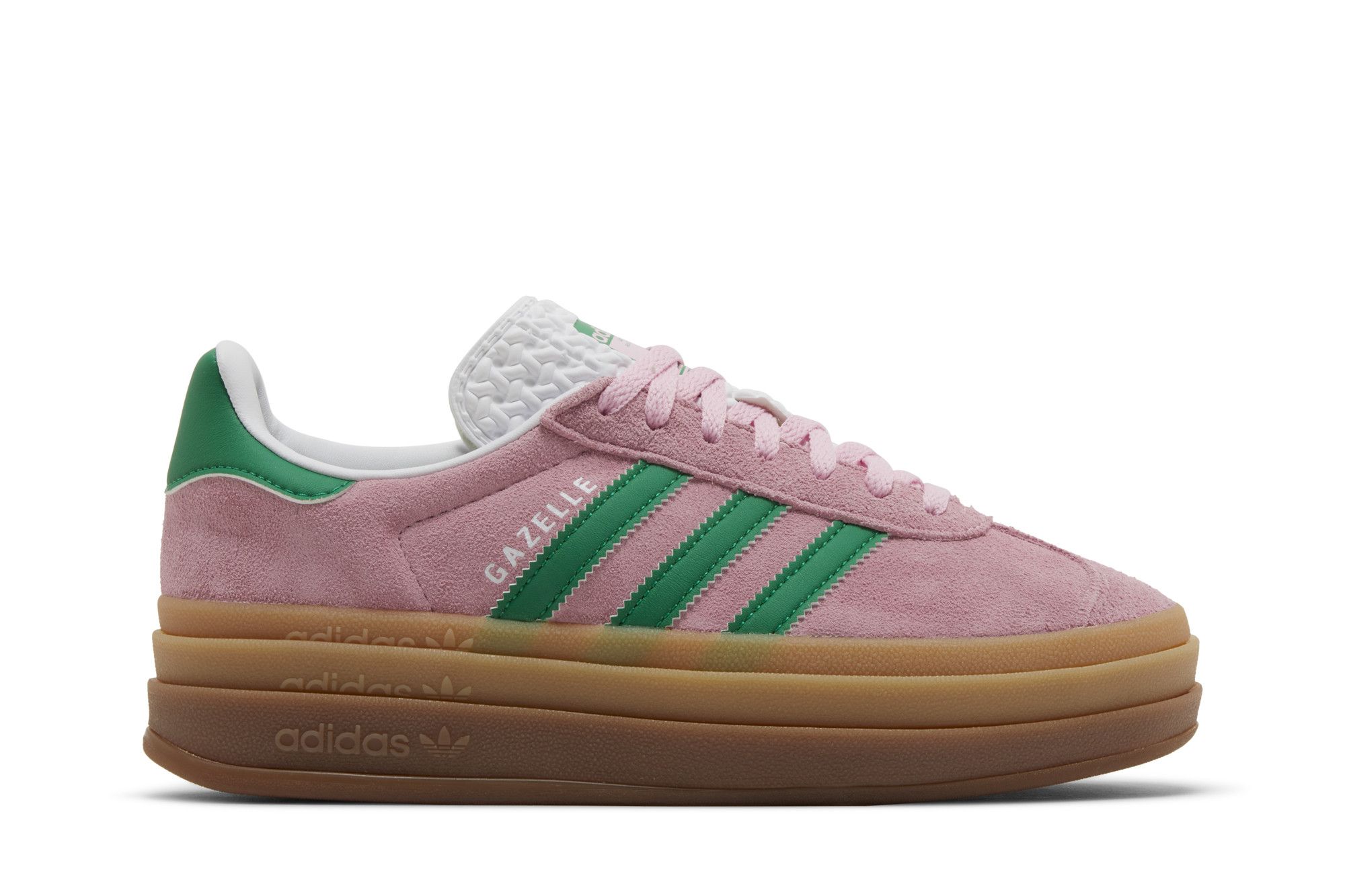 This Adidas Gazelle Bold True Pink features a pink suede base, complemented by a tonal mudguard. We also see the iconic three adidas stripes covered in green leather, paired with a heel tab and tongue branding. A triple-layer rubber outsole adds originality to this retro-looking model.