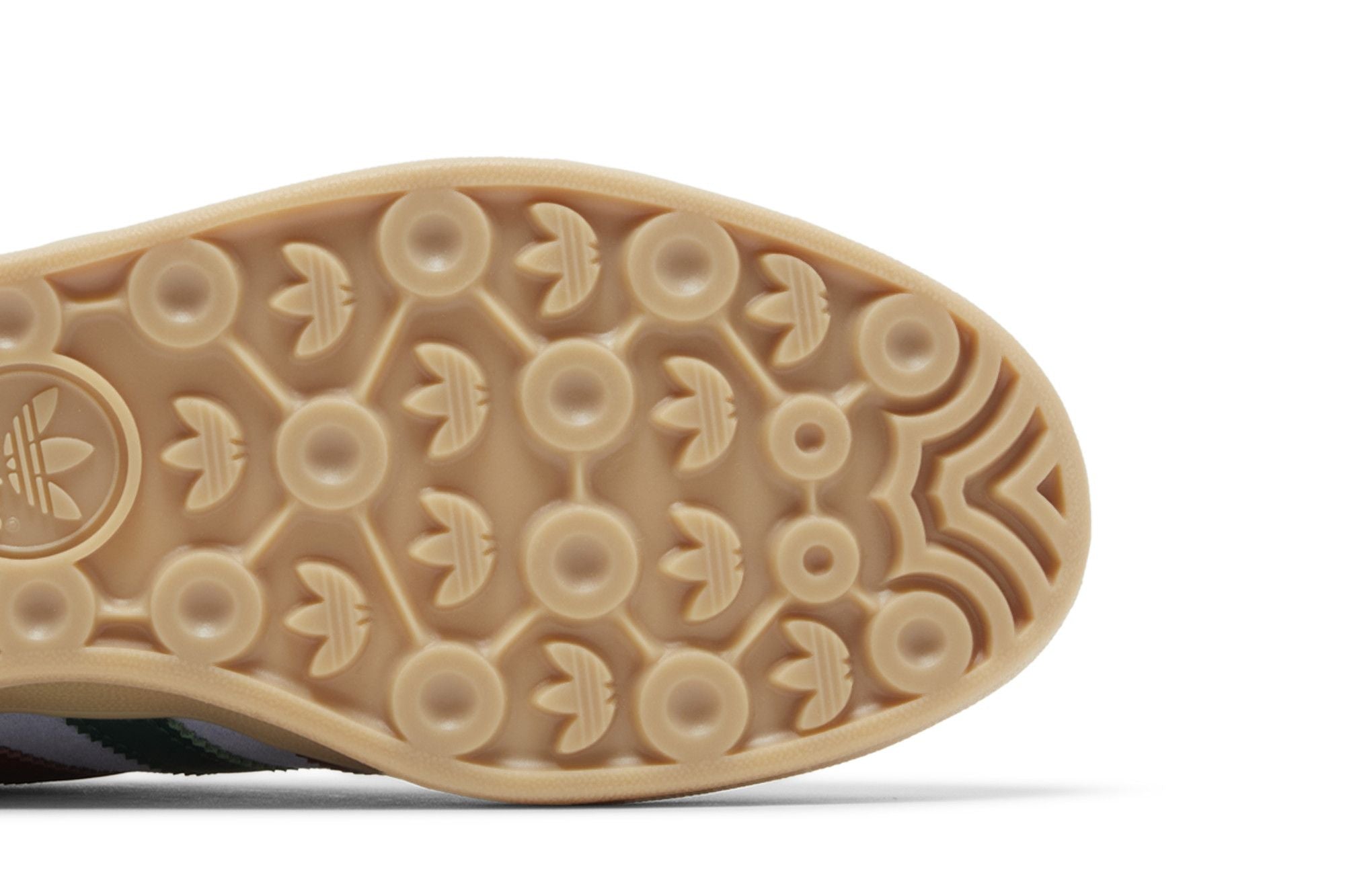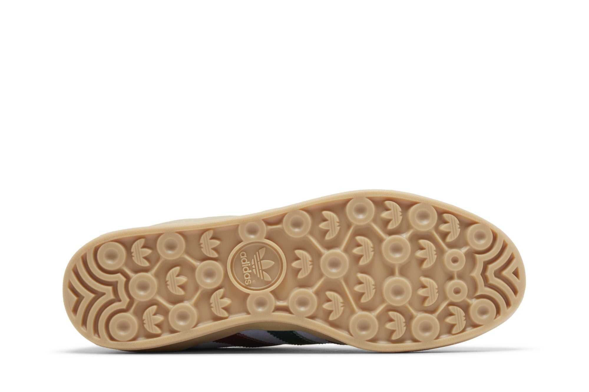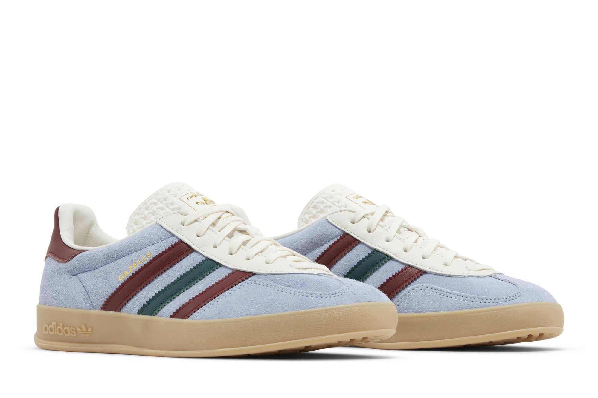 The adidas Gazelle Indoor Blue Dawn Collegiate Burgundy features a refreshed design with a new color scheme. This indoor soccer shoe features a Blue Dawn base with a Collegiate Burgundy and Core Green 3-Stripes logo on the suede upper. The leather rear is also Collegiate Burgundy, coordinating with the 3-Stripes. Like all Gazelles, this version features a rubber outsole, an adidas Trefoil logo on the tongue, and gold 'GAZELLE' lettering next to the 3-Stripes. The sneaker features classic T-bar overlays and a low-bulk midsole with an embossed 'adidas' logo. The interior features branding details and a soft material. The look is rounded out by white laces, a lace cage, and a tongue that contrast with the bright colors of the upper.