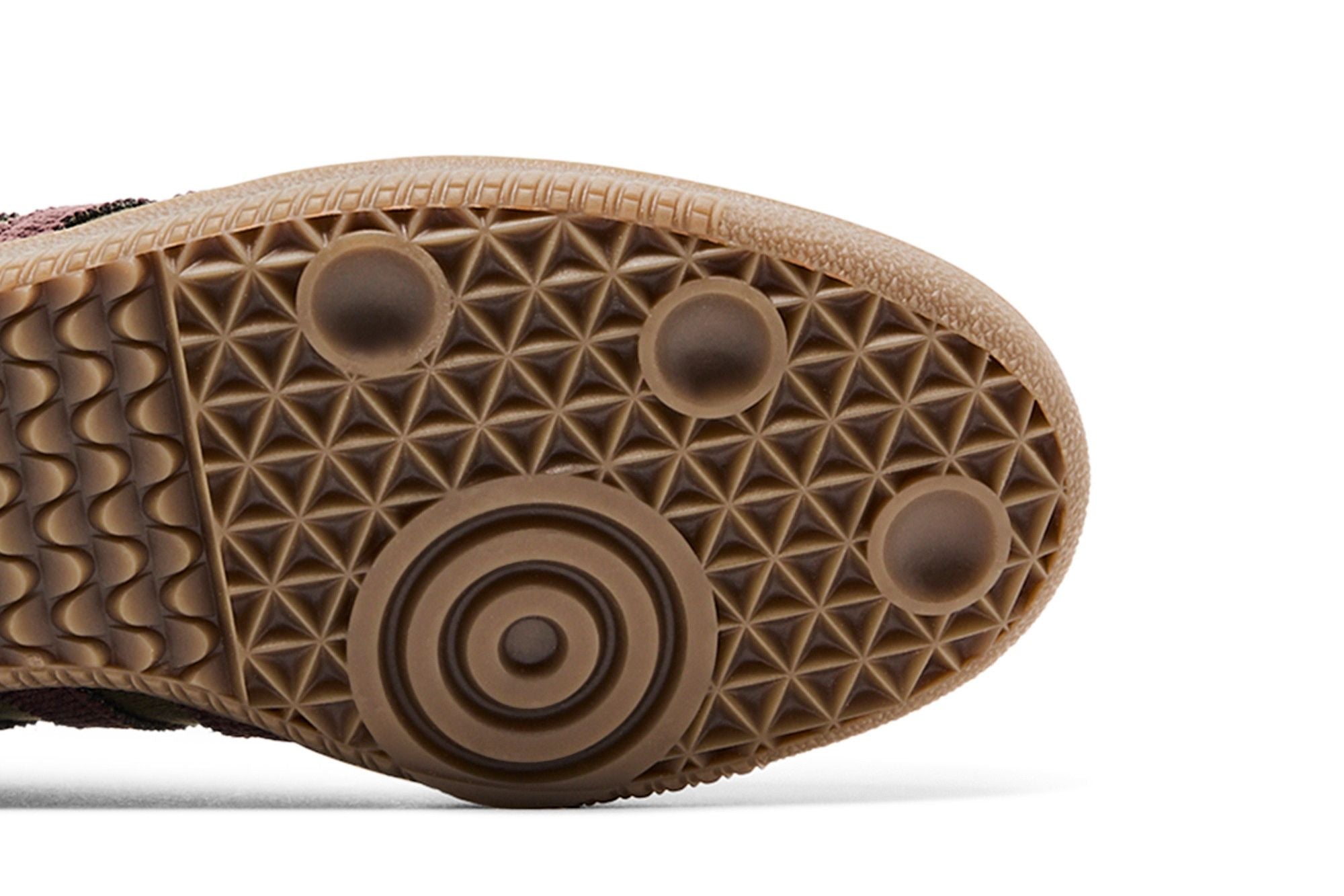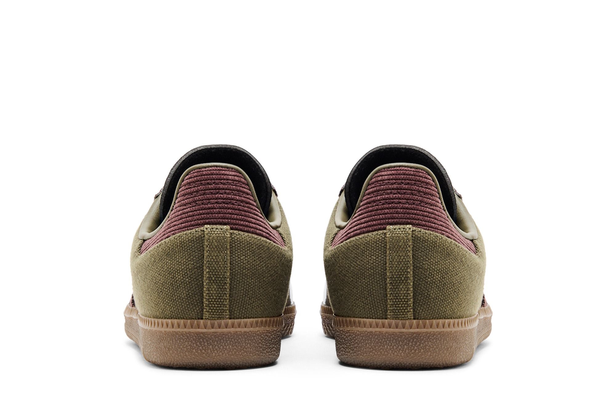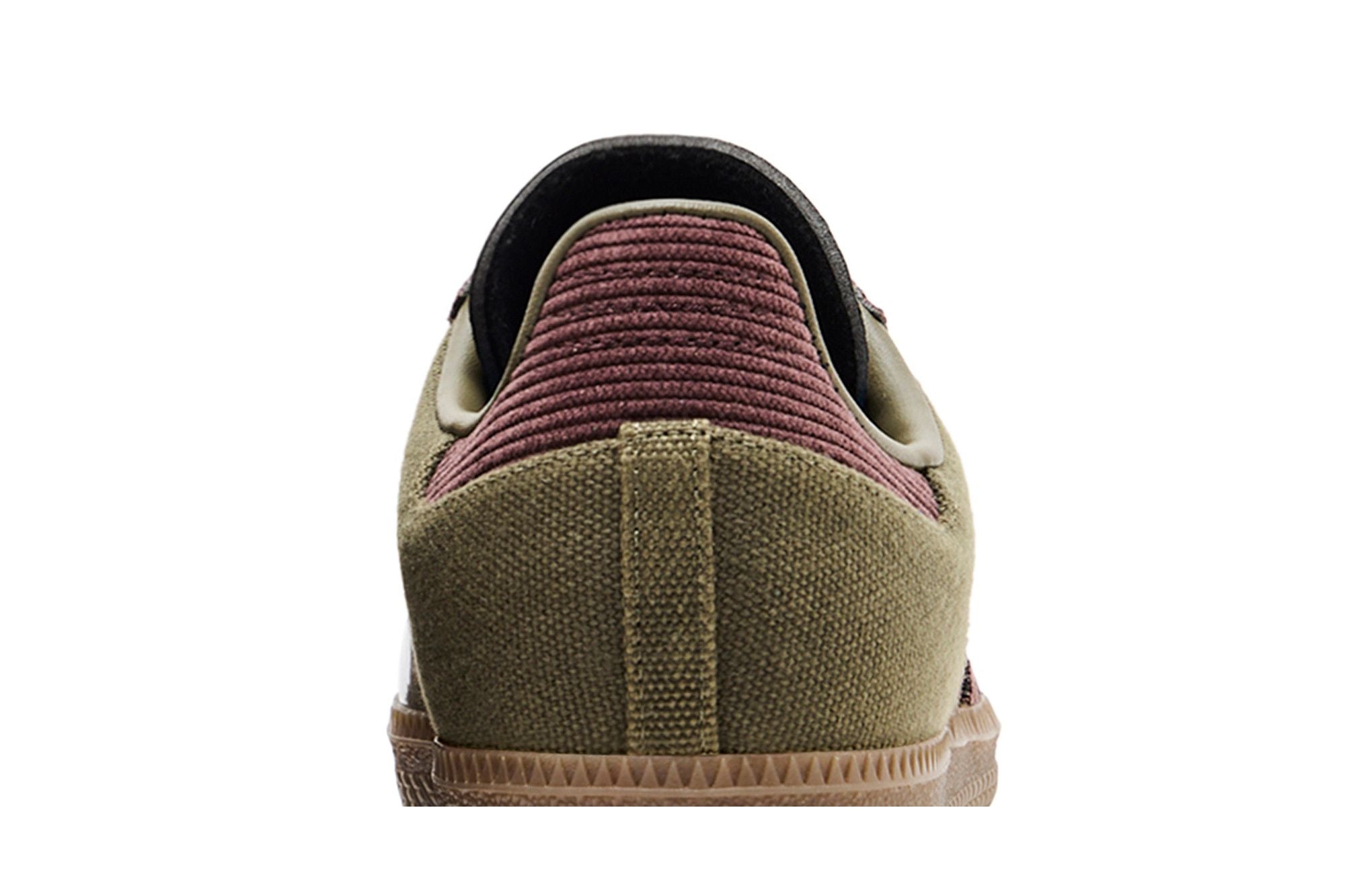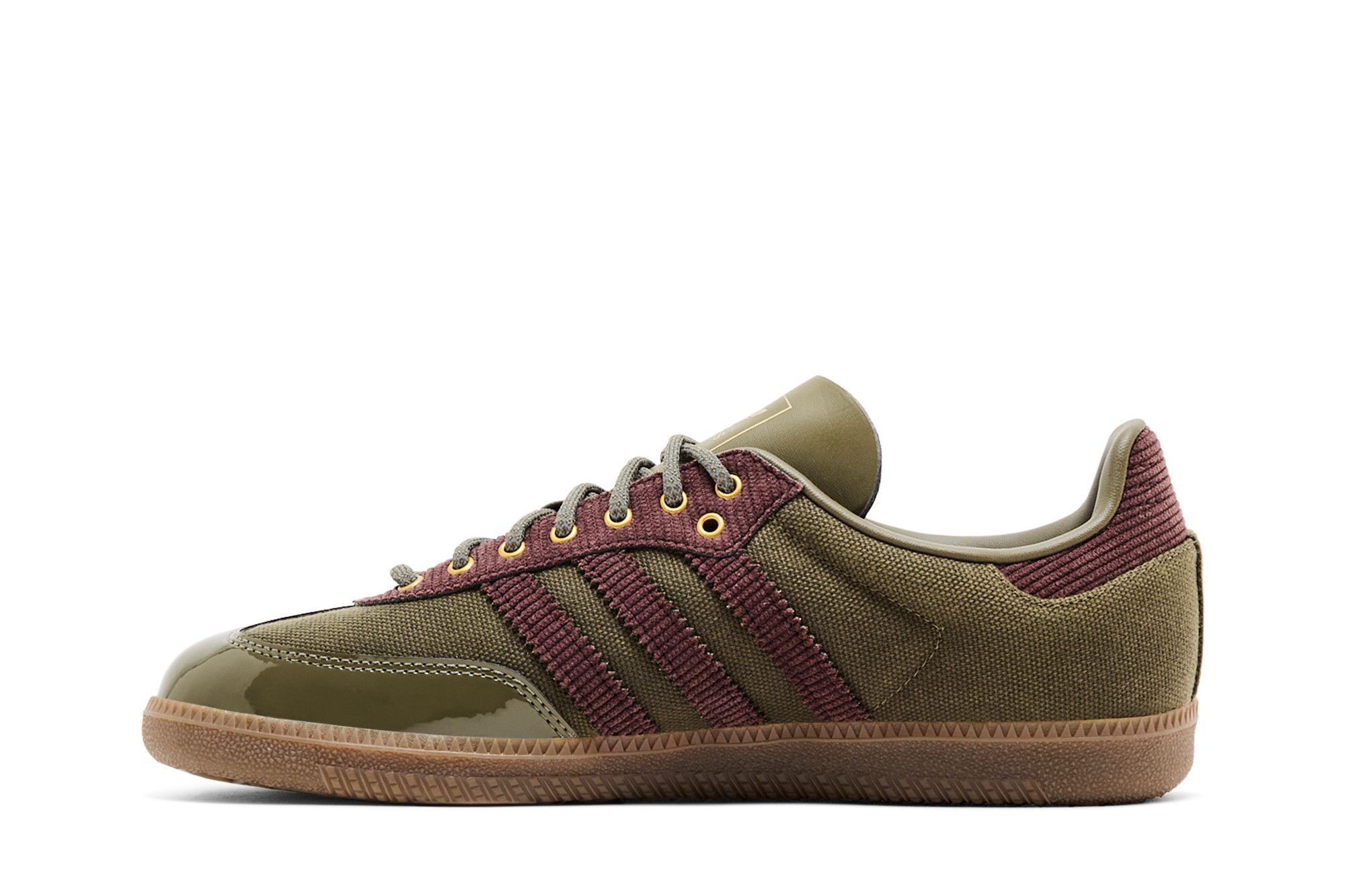 The Sambaal Yezty is a sneaker with elegant, modern lines. Its upper is made of fabric, with darker inserts forming lateral stripes. The upper is olive green, while the sole is brown with a textured pattern. The gold logo on the side and the metallic details on the lace loops stand out.