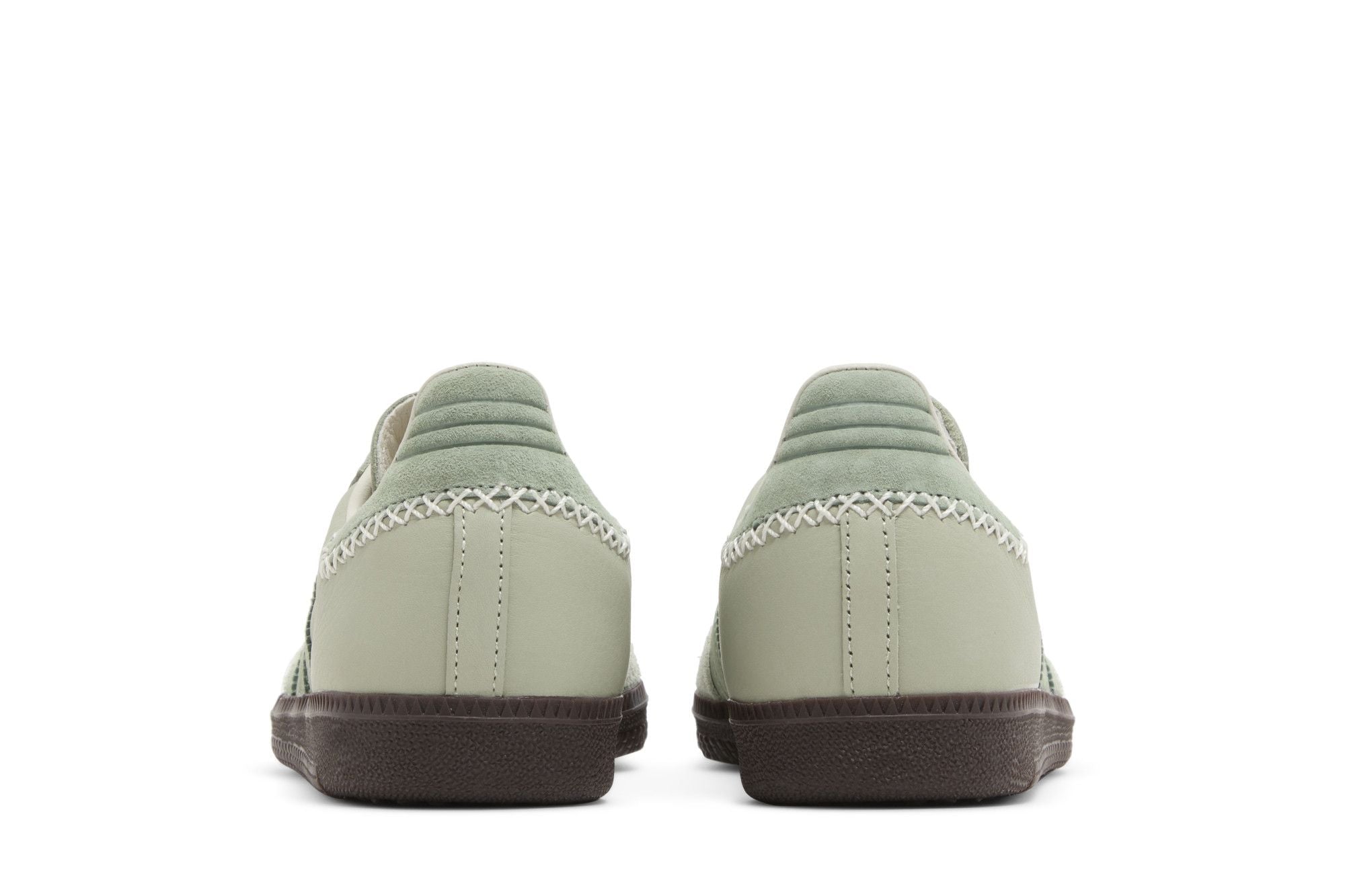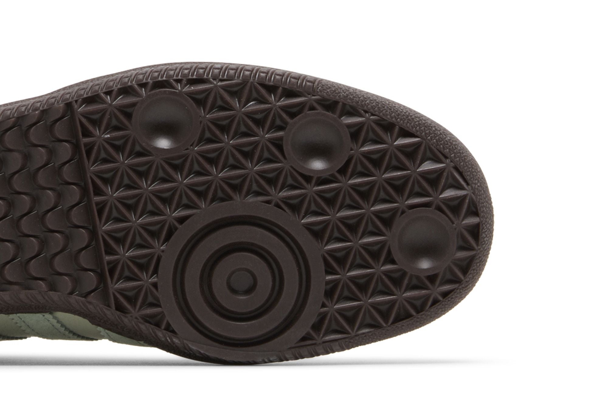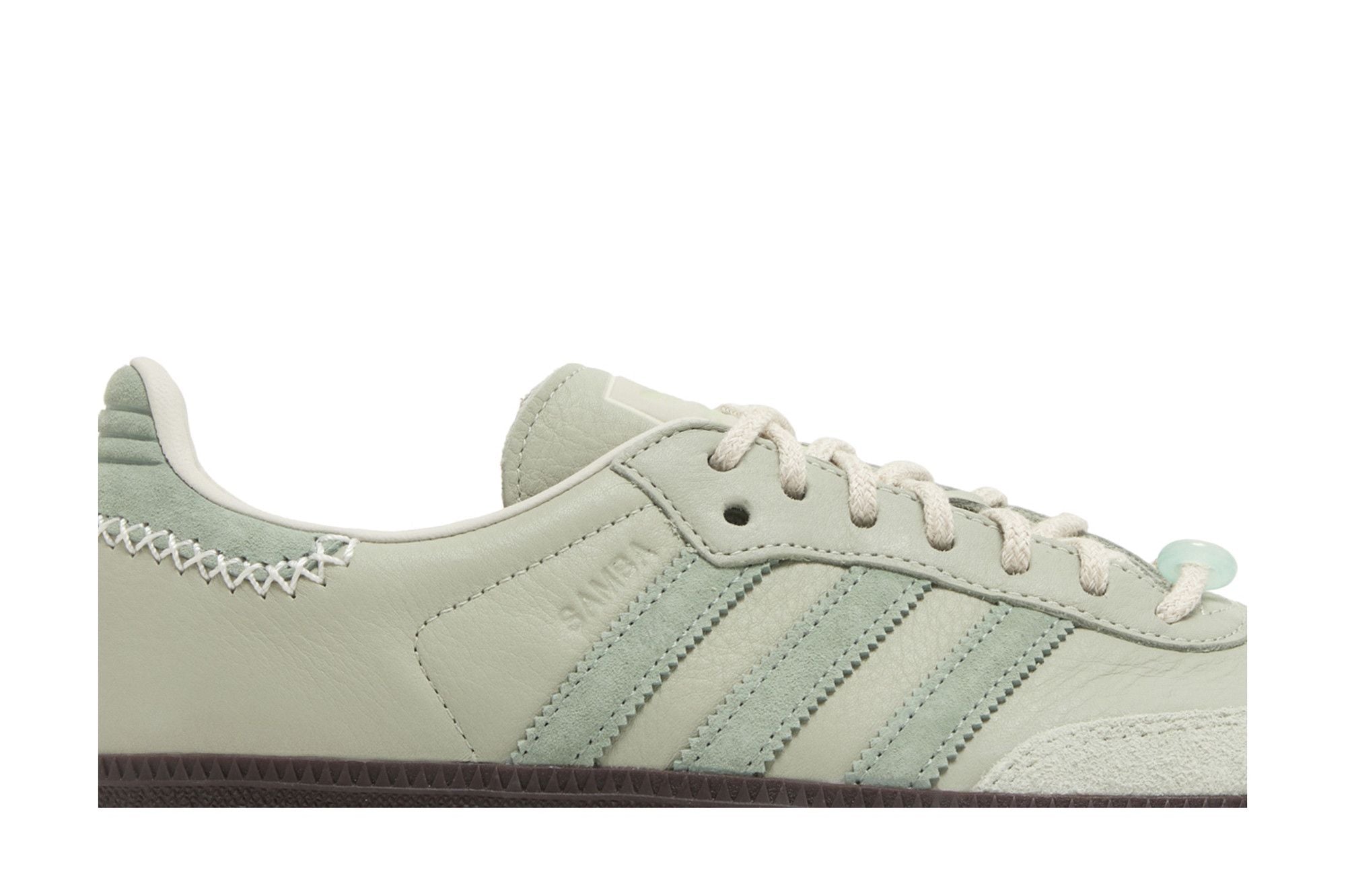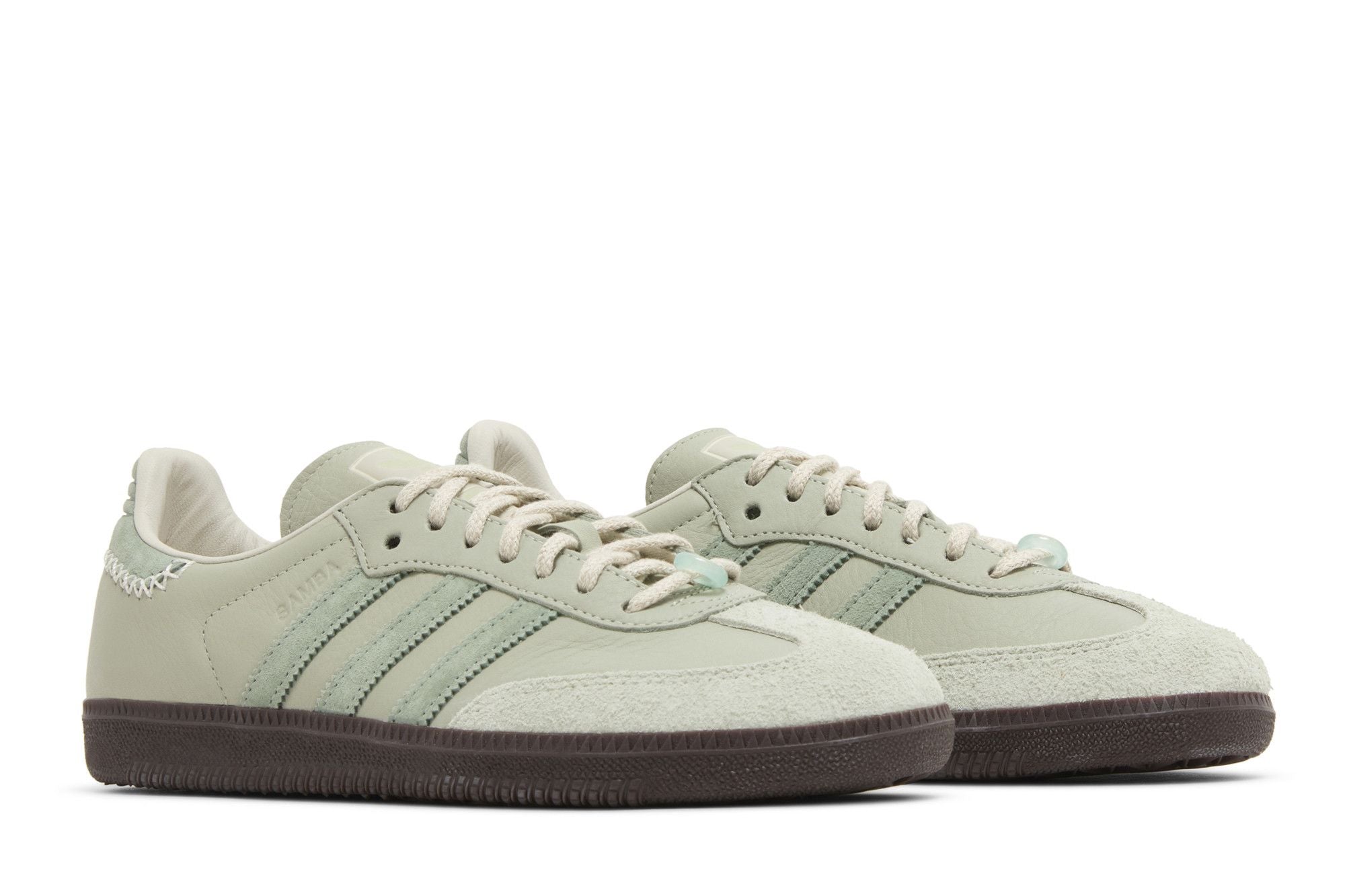 The adidas Samba OG Maha Half Green features a distinctive design with light green hues and off-white accents. Its leather construction and furry suede overlay on the toebox in silver green, along with classic design elements such as the serrated 3-Stripes logo and the "whisker" on the heel, give it a touch of elegance and history. The "SAMBA" name is debossed on the 3-Stripes, while the tongue features a trefoil, giving a touch of unique personality to the adidas Samba OG Maha Half Green.