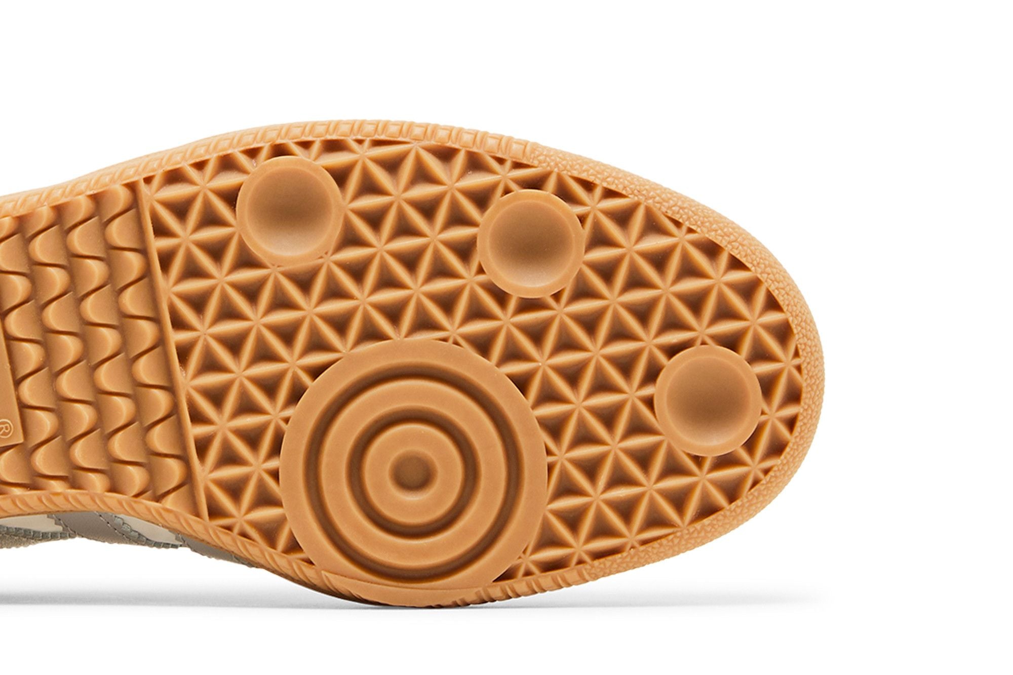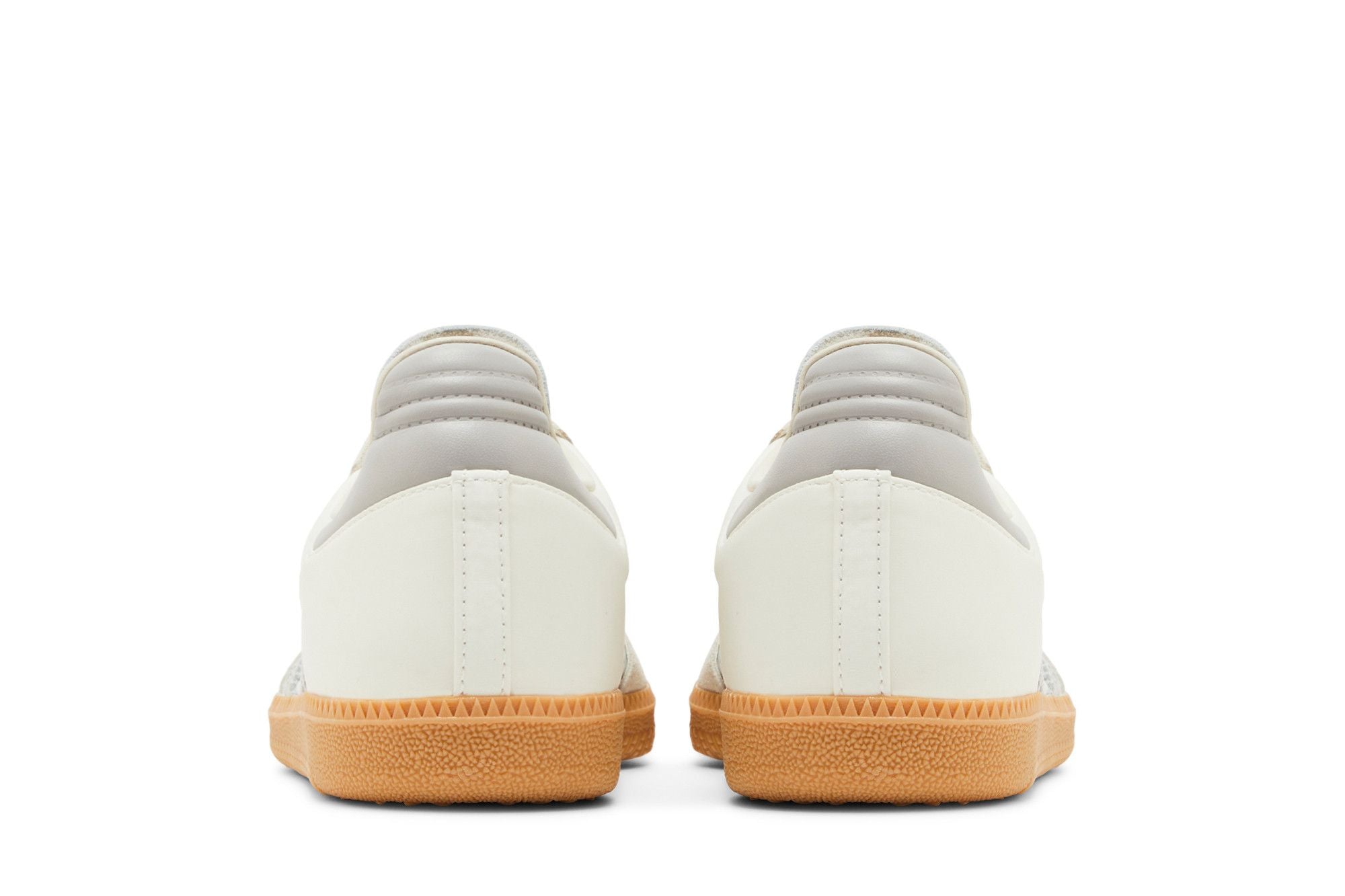 The Adidas Samba OG Off White Aluminum is a sleek reinterpretation of the classic Samba silhouette, featuring a combination of neutral tones and sophisticated details. The upper is crafted from off-white leather, with beige suede overlays on the toe and along the laces, adding texture and depth to the design. The serrated three-stripes in gray aluminum provide a subtle contrast, paired with the gray leather heel counter. A suede tongue, embellished with a gold adidas logo, nods to the model's vintage aesthetic. The shoe is completed with a classic gum rubber outsole, which ensures durability and a timeless look, perfect for those seeking a casual yet refined style.