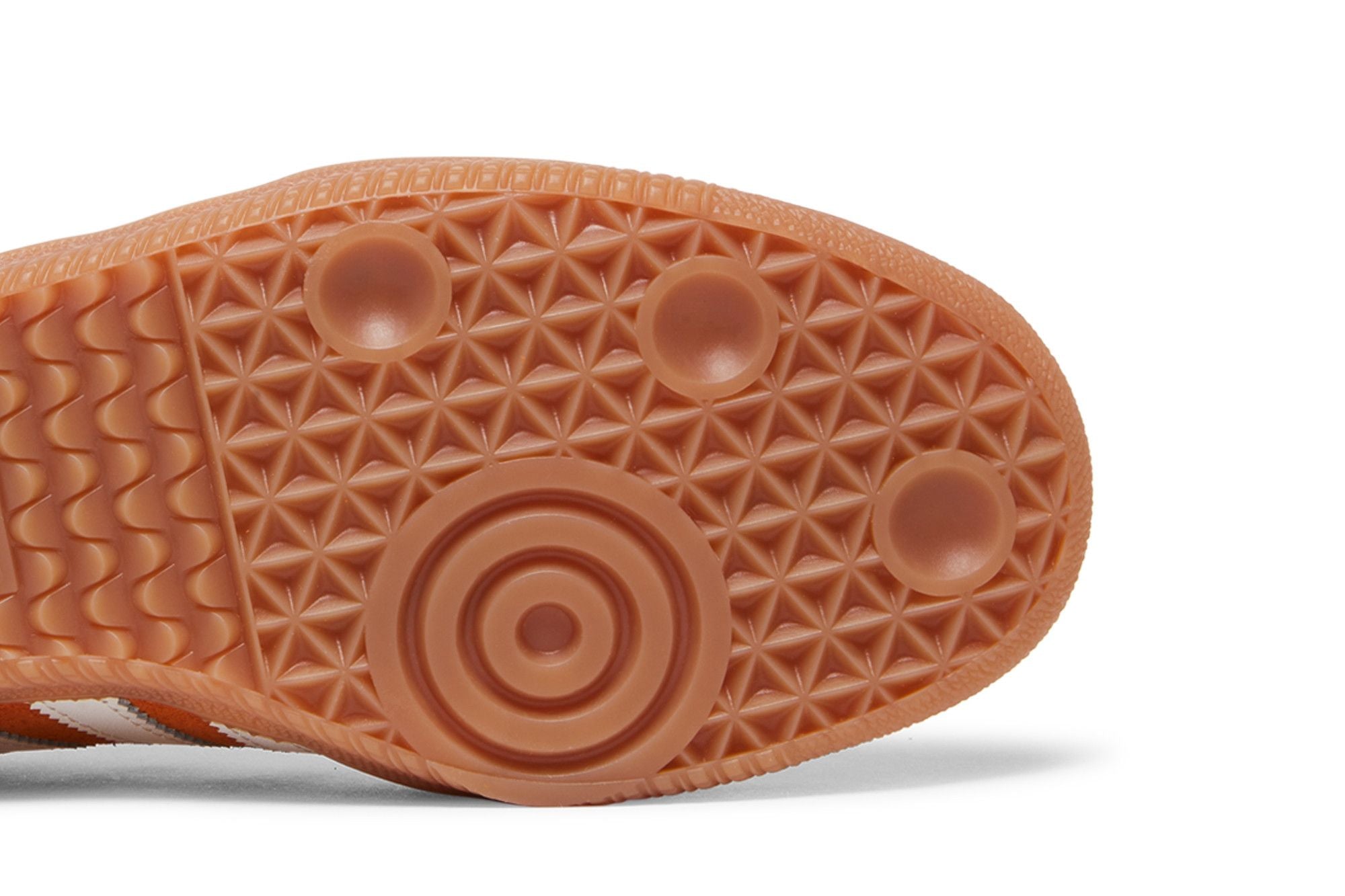 The adidas Samba shoe has been reinvented with a new variant, the adidas Samba OG Orange Rush Gum, which stands out for its unique design. Its leather surface is almost entirely orange, with hints of white on the tongue and heel labels, as well as the adidas Three Stripes logo. The shoe is completed with slightly lighter orange laces and a rubber sole that creates a nice contrast with the rest of the design. This variation of the adidas Samba demonstrates the brand's ability to innovate without betraying the classic features that have made the adidas Samba an icon of the brand.