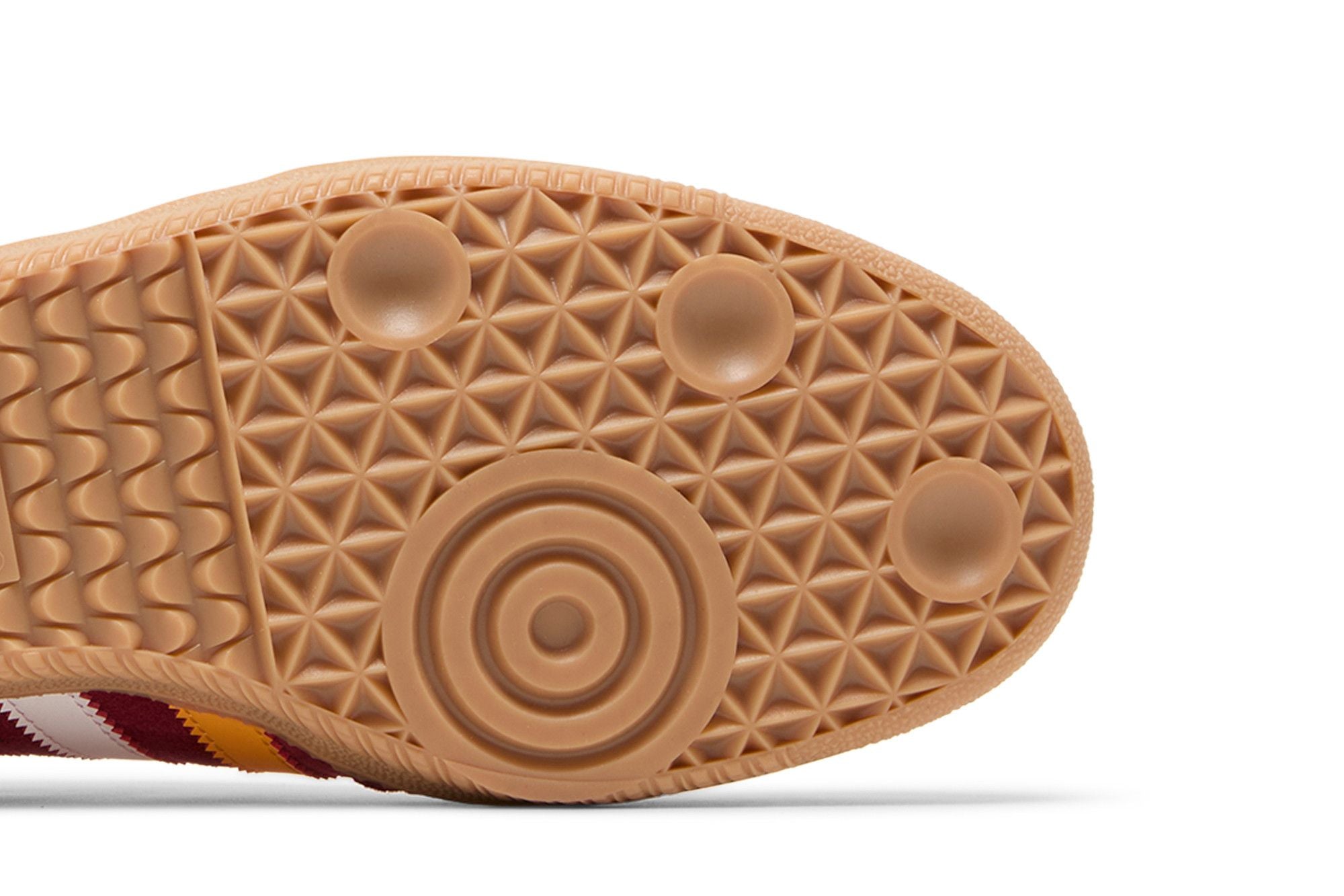 The adidas Samba OG USC Trojans is a sneaker with elegant and sporty lines, made of high-quality material. The upper is in soft burgundy red leather, embellished with three colored stripes - one orange, one white and one red - that give it a touch of liveliness. The sole is in light brown rubber, while the tongue and heel have white details. The laces are black and contribute to giving a clean and minimalist look. The "SAMBA" writing in yellow gold on the side adds a touch of style.