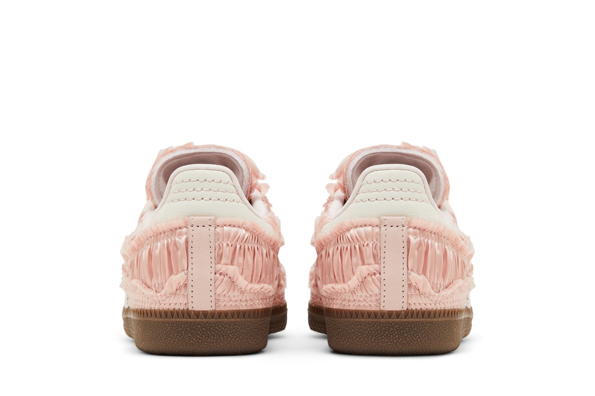 The adidas Samba Reverie by Caroline Hú CLOT is an elegant and refined sneaker with a pink textured silk upper. Its sinuous lines and white leather details give a touch of class to this shoe. The light brown rubber sole gives a pleasant color contrast. The three side stripes typical of the brand, in white, further embellish the shoe.