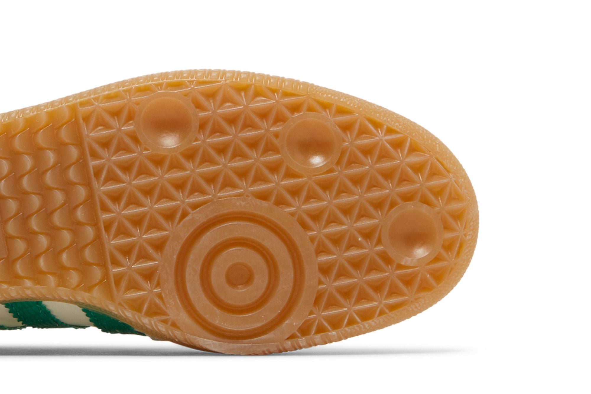 The adidas Samba Wales Bonner Cream Green features a smooth white leather upper with furry suede overlays on the front and green three-stripes and heel overlays with crocodile texture. Large mesh stitching around the tongue and heel adds a custom touch. Down below, a large rubber outsole completes the design of the adidas Samba Wales Bonner Cream Green.