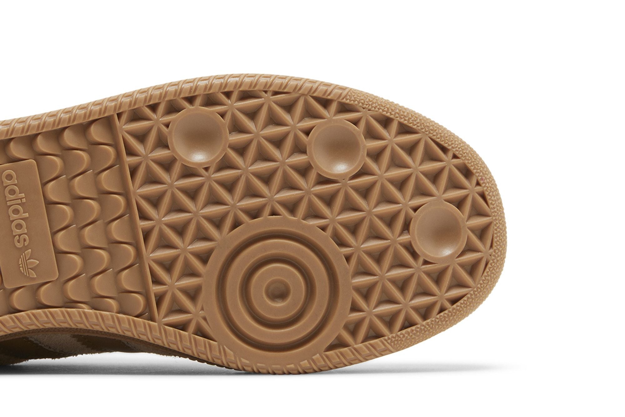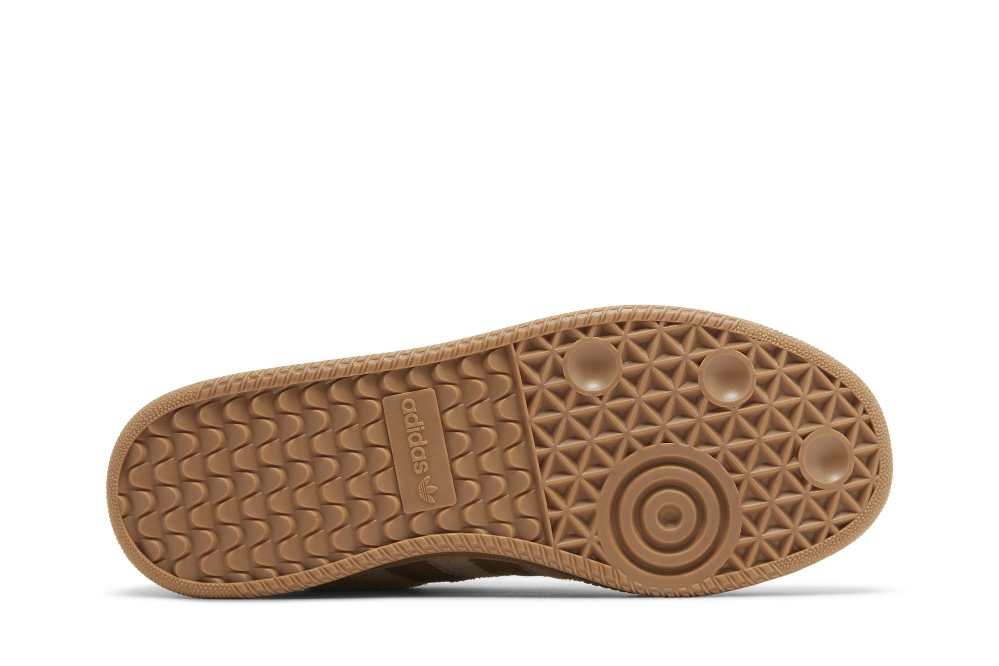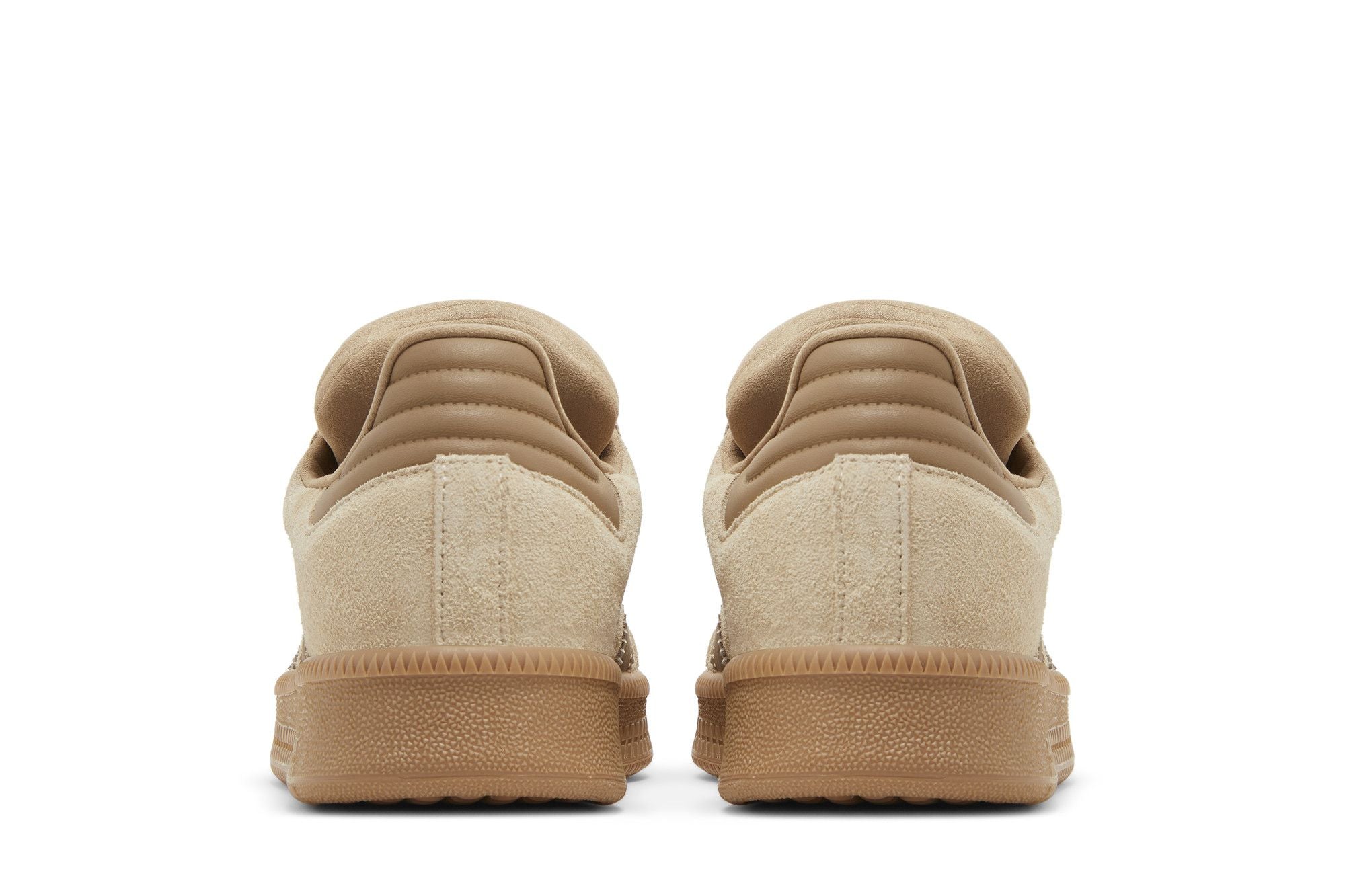 The adidas Samba XLG Magic Beige Cardboard is a sneaker featuring a beige and light brown color scheme. Its upper is made of a mix of materials, including sponge and faux leather. The three side stripes and the sole are light brown. The design is completed by a beige rear vamp and laces. The sole is made of light brown rubber with a textured embossment.