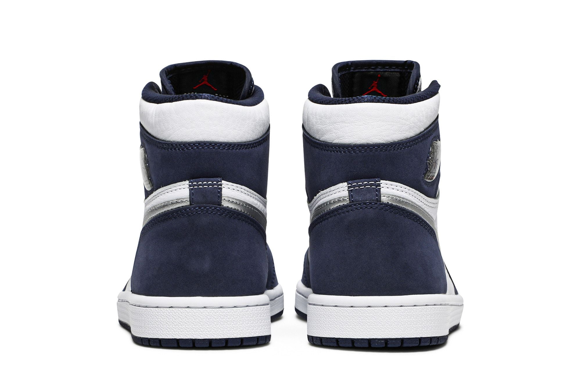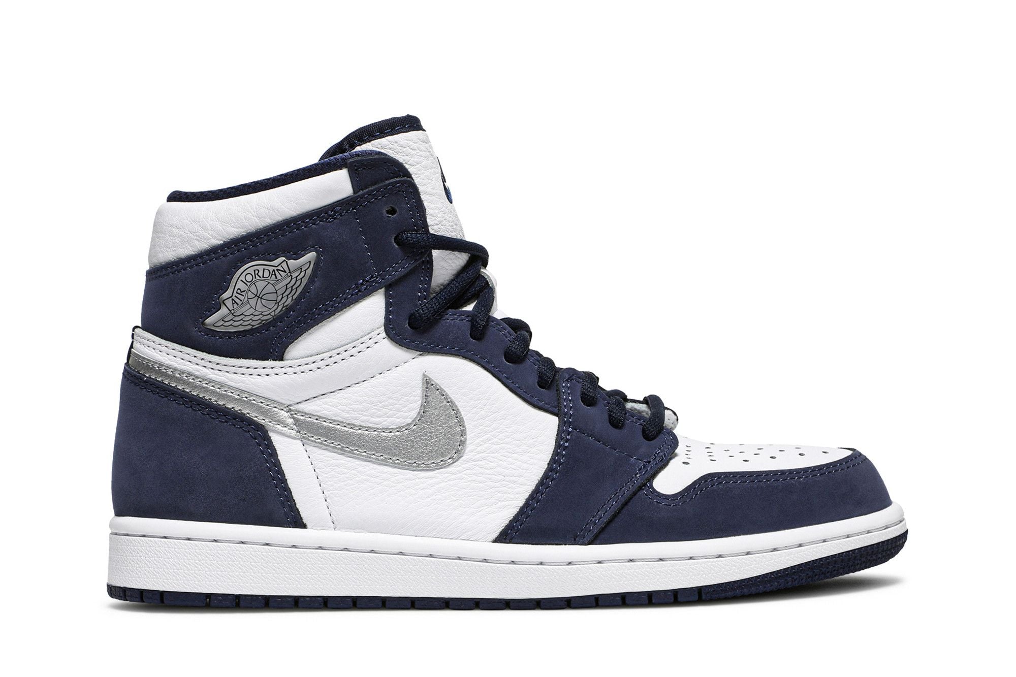 The Air Jordan 1 Retro High Midnight Navy (2020) is crafted from White leather, found primarily on the toe box and side panel. Everything is embellished with some navy blue suede inserts as well as the Swoosh and the metallic gray Wings logo. The two-tone sole and the Nike Air tag embroidered directly on the tongue complete everything. See all the specs on Nike.
