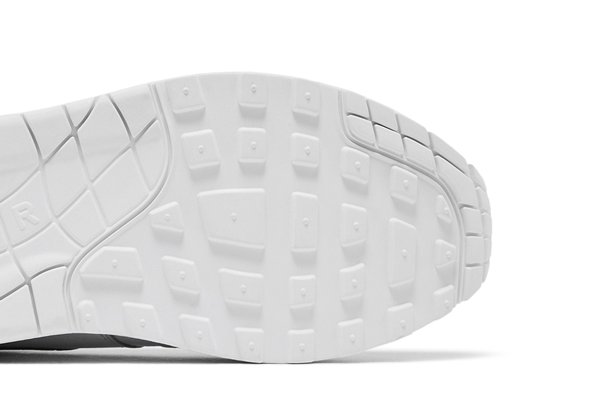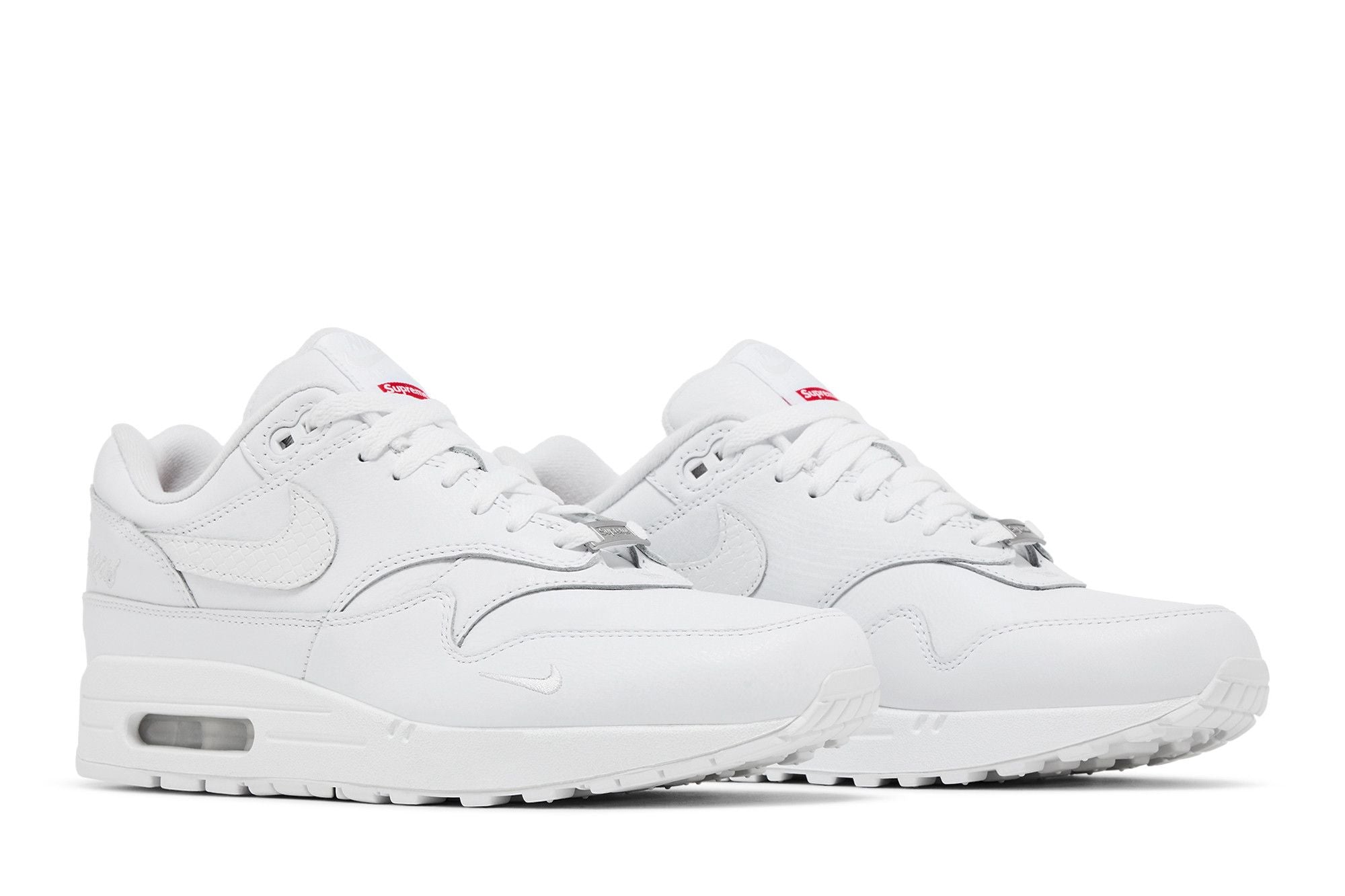 Part of an exclusive four-pack, the Supreme x Nike Air Max 1 '87 SP 'Varsity Purple' features a layered purple leather upper, accented with a white snakeskin-textured leather Swoosh . An embroidered mini-Swoosh adorns the front lateral area, while signature Supreme details include custom dubraes on the laces , a co-branded tongue label and "World Famous" embroidered on the heel. A white polyurethane midsole with a visible Max Air unit in the heel provides lightweight cushioning.