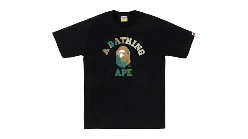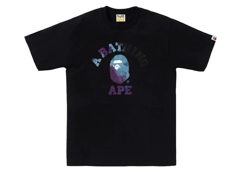The A BATHING APE is a black cotton T-shirt with short sleeves and a minimalist design. The A BATHING APE features a colorful "A BATHING APE" logo and a stylized monkey head in the center. The logo is available in colorways, including blue, purple, beige, and green. The T-shirt has a classic fit and a casual look, perfect for wearing on a variety of occasions.