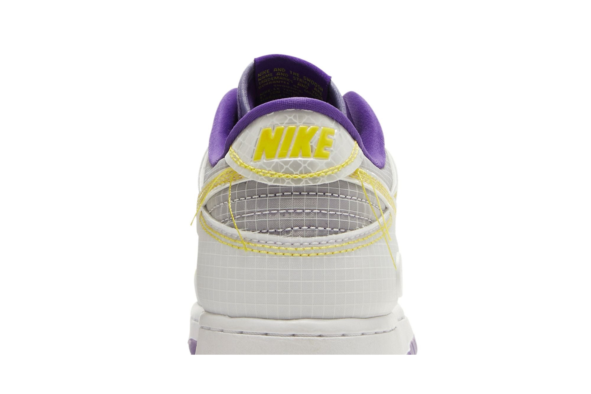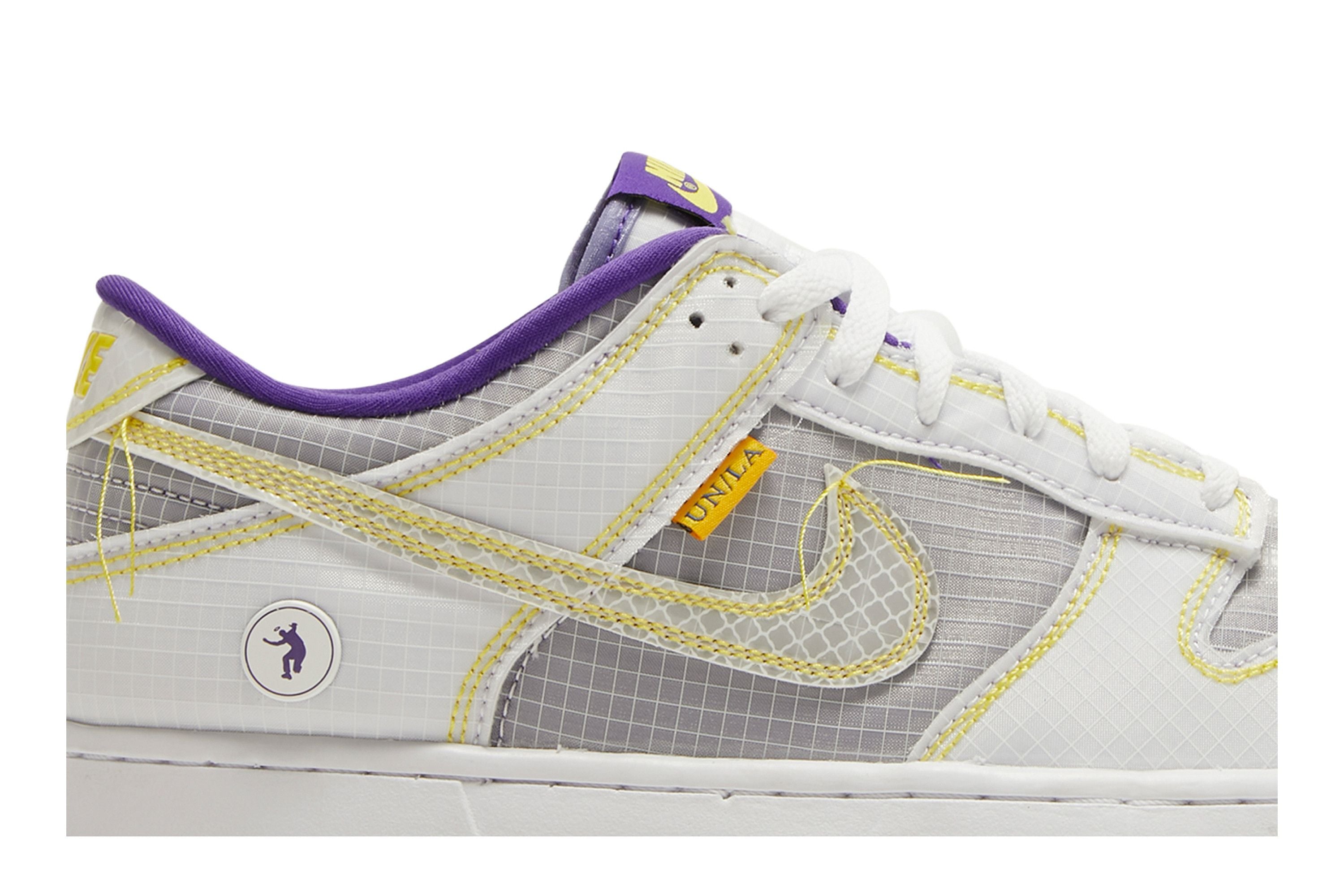 The Nike Dunk Low Union Passport Pack Court Purple is decorated with the emblematic colors of the Los Angeles Lakers. It has a gray ripstop over white checkered overlay and yellow stitching. Reveals a second layer of white and purple leather referencing the Nike Dunk High CO.JP "Reverse City Attack" released exclusively in Japan in 1999. The "UN/LA" label The Los Angeles store "Frontman Logo" patch is added to the quarter panel. The whole is set on a White midsole with a translucent Purple outsole marked with the Frontman logo in red. See all the specs on Nike .