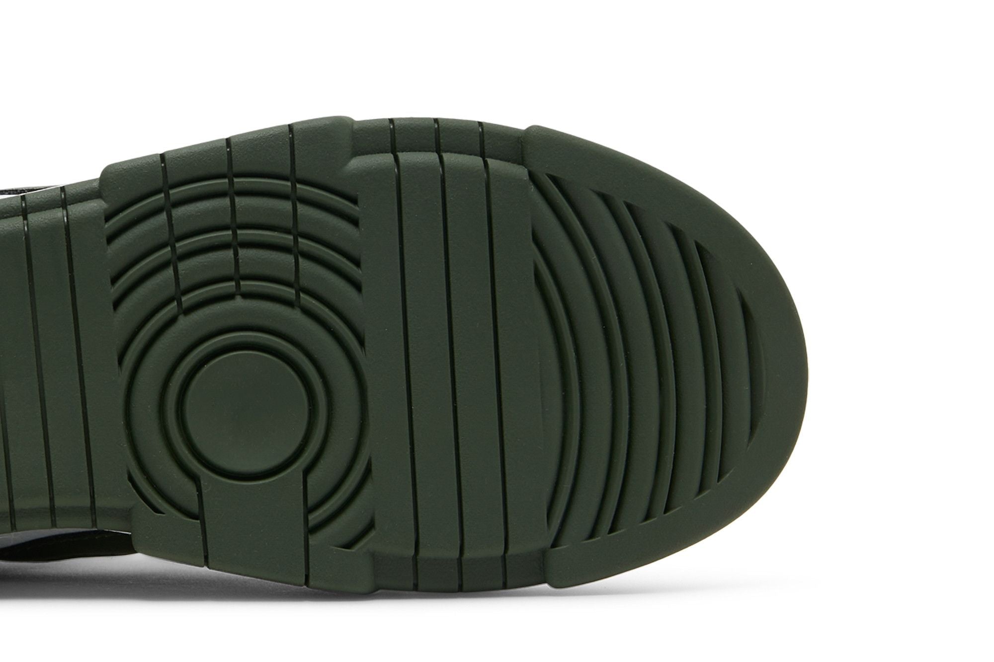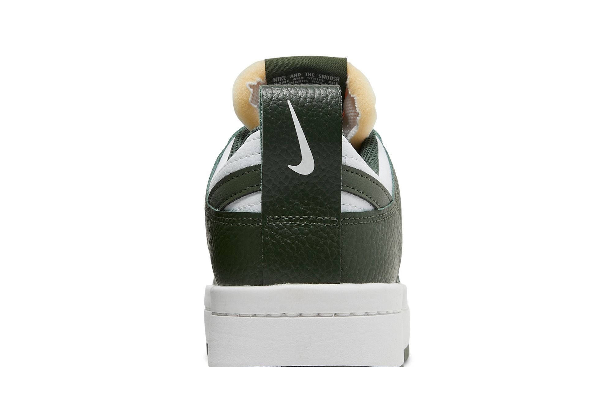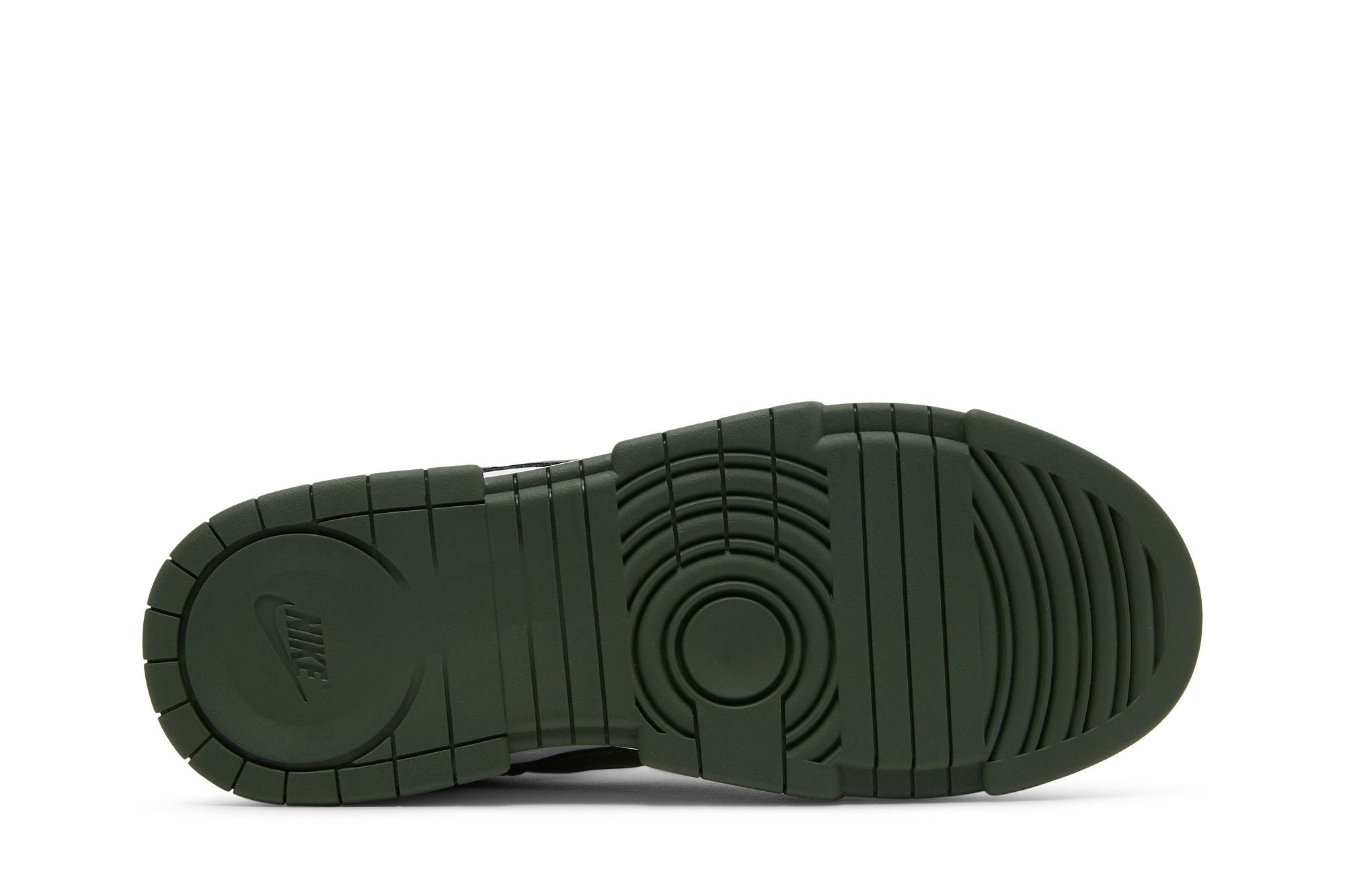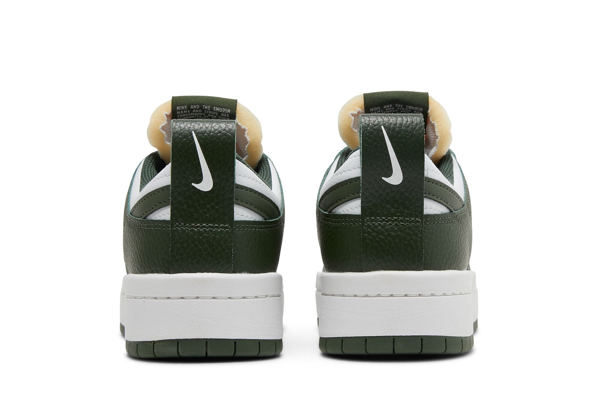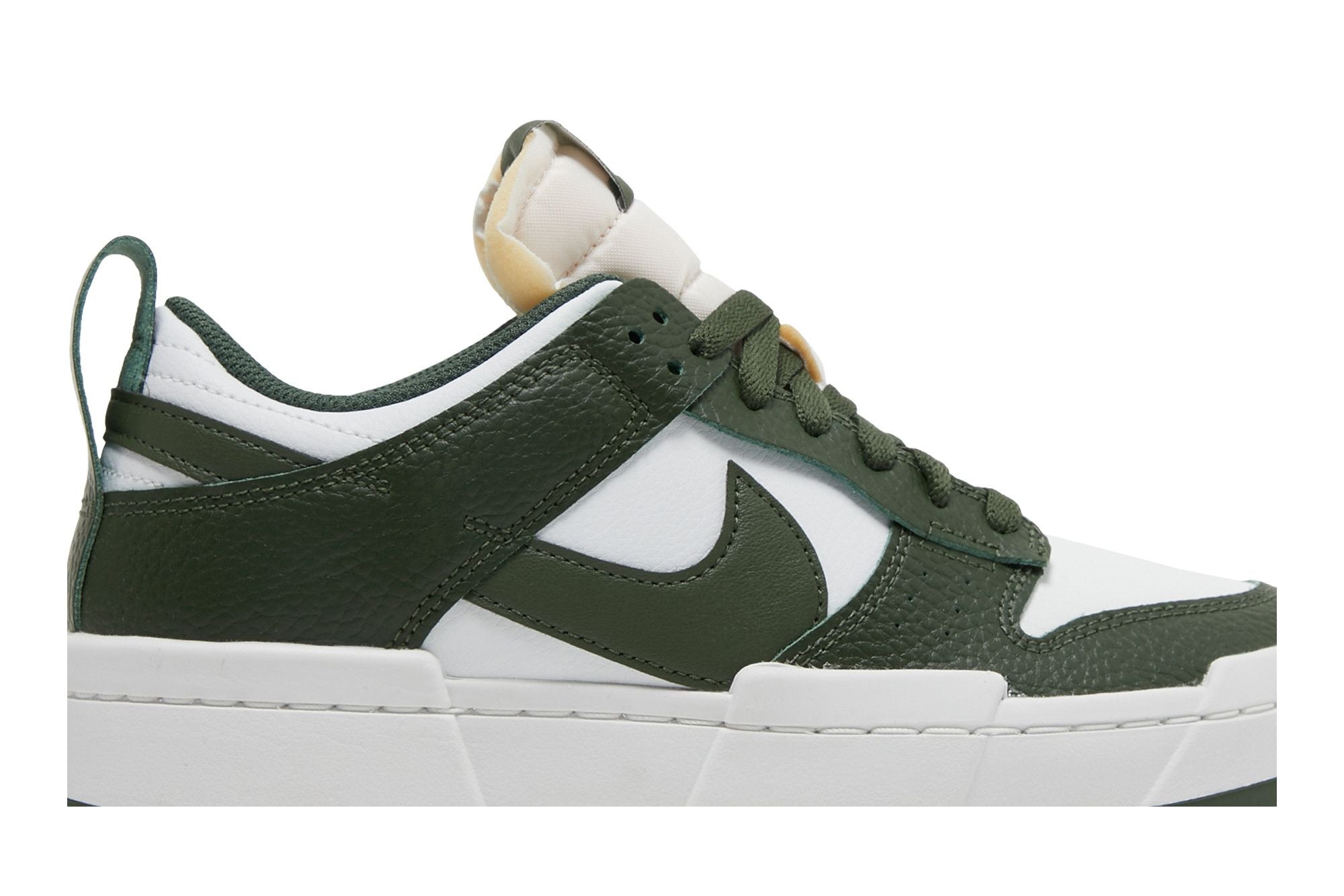 The Dunk Low Disrupt Dark Green White (W) has a white leather base with alternating khaki green inserts. Only the beige fabric tongue stands out from the two-tone color blocking. See all the specs on Nike .