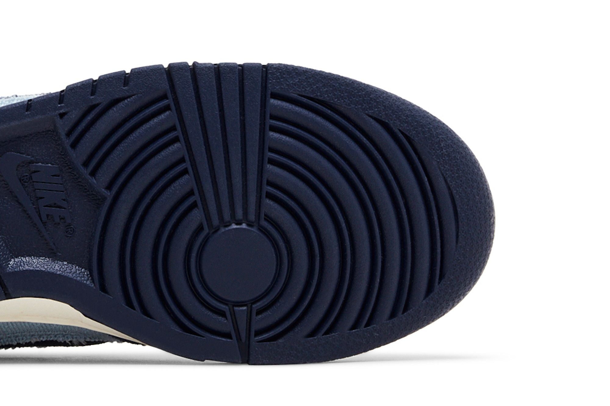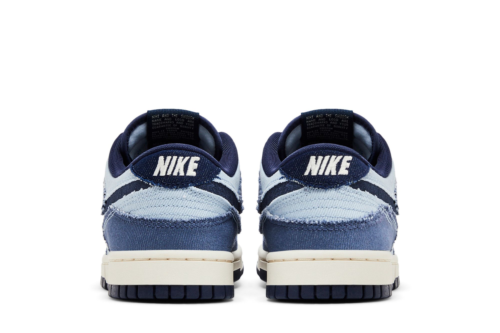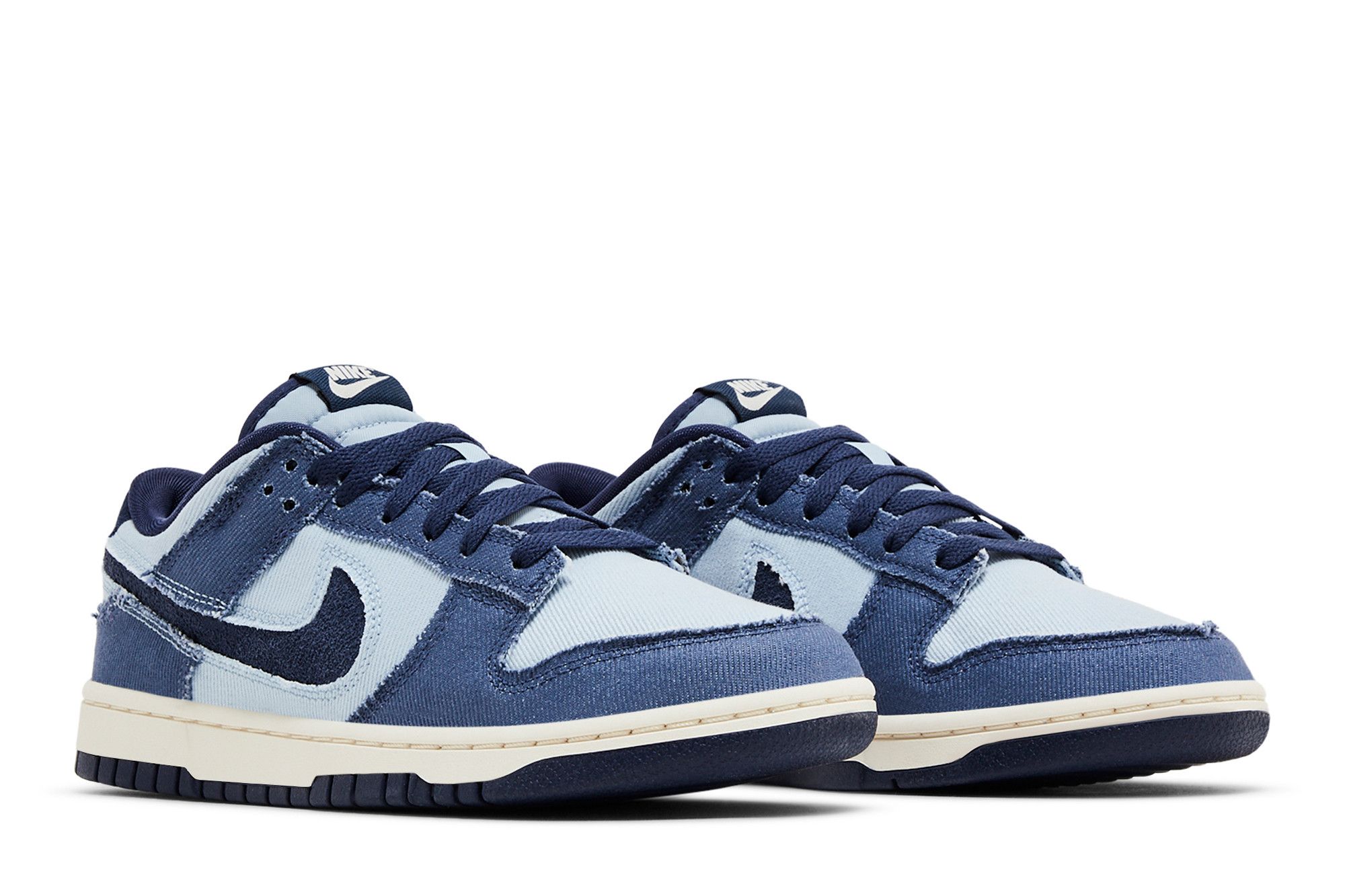 The Nike Dunk Low Light Armory Blue Denim is a sneaker with a casual, modern aesthetic, featuring an Armory Blue and Denim color scheme. The shoe is made of a denim-like material with solid-color details and a black and white outsole. The upper features a paneled construction with exposed stitching and a Nike Swoosh logo on the side. The laces are black, and the rear tongue features a tag. The sturdy outsole features a black rubber tread.