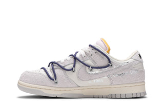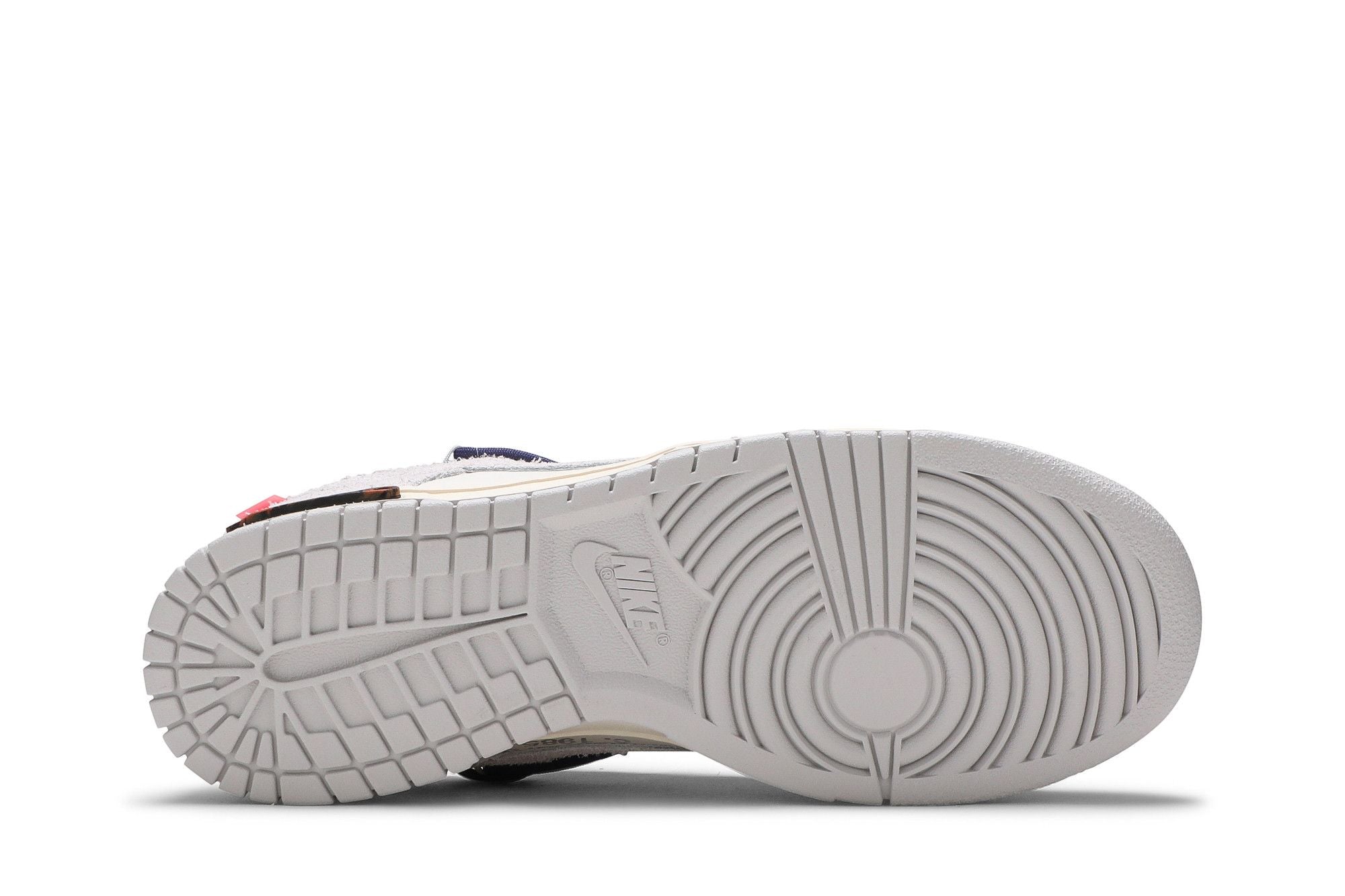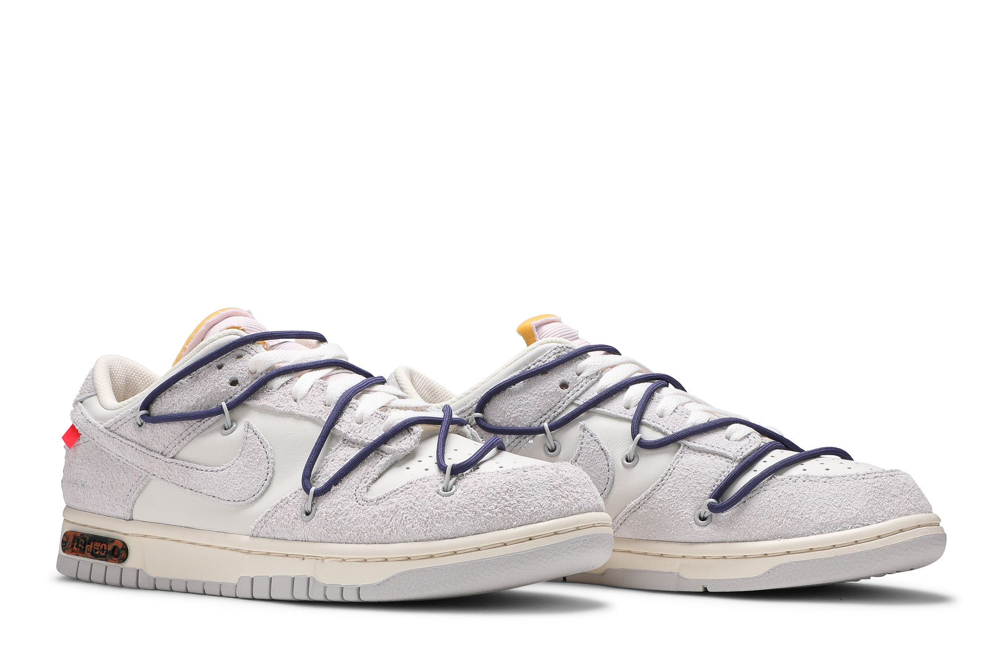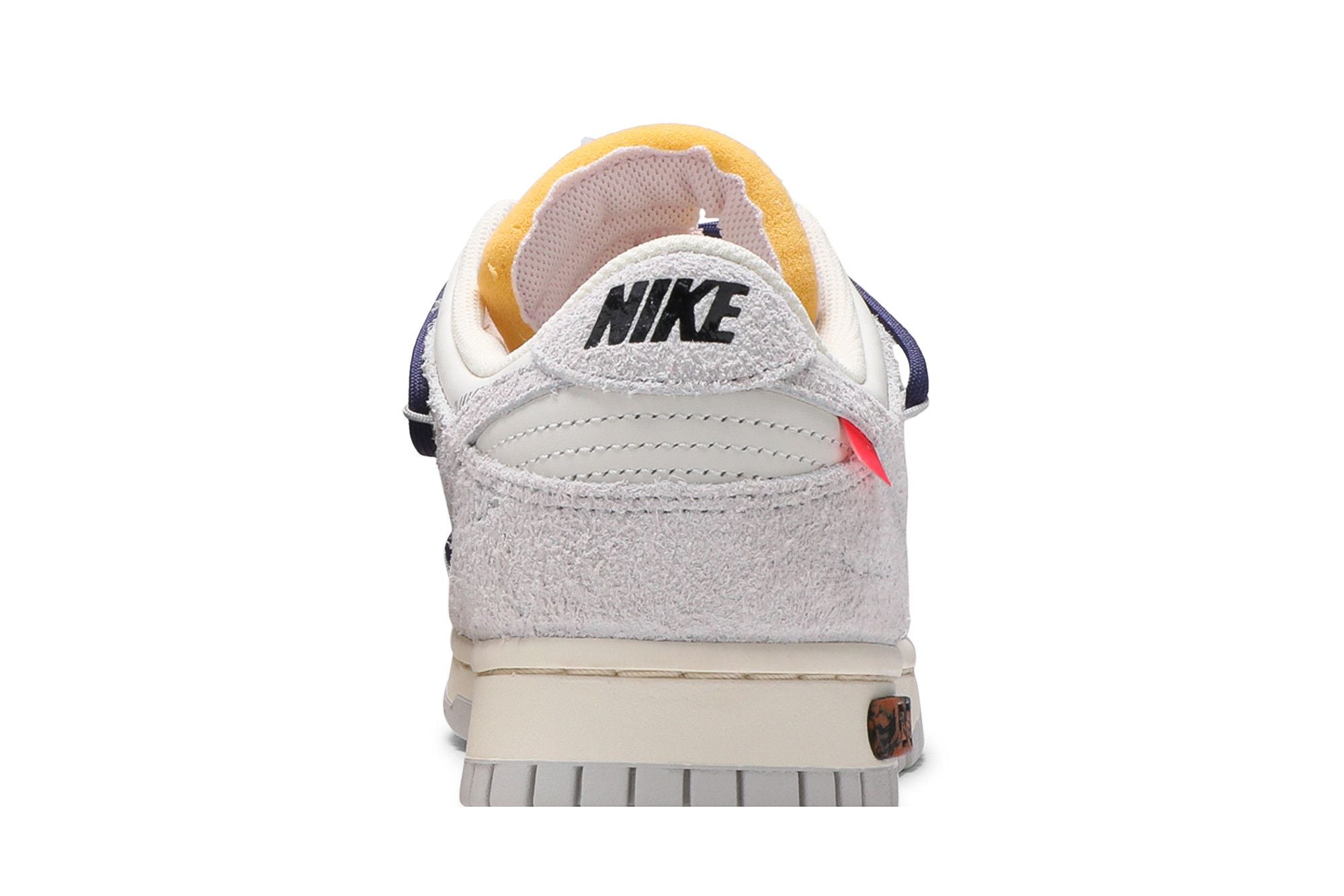 This Dunk Low Off-White Lot 18 featured a White leather upper highlighted by a set of Light Gray suede overlays. It also featured many of the touches found in other Virgil Abloh x Nike sneakers, including a plastic tie on the laces and a red tab attached to the Swoosh on the lateral side. See all the specs on Nike.