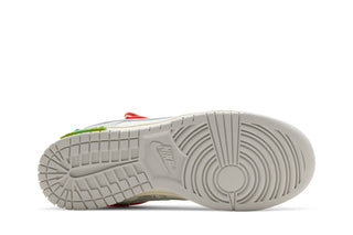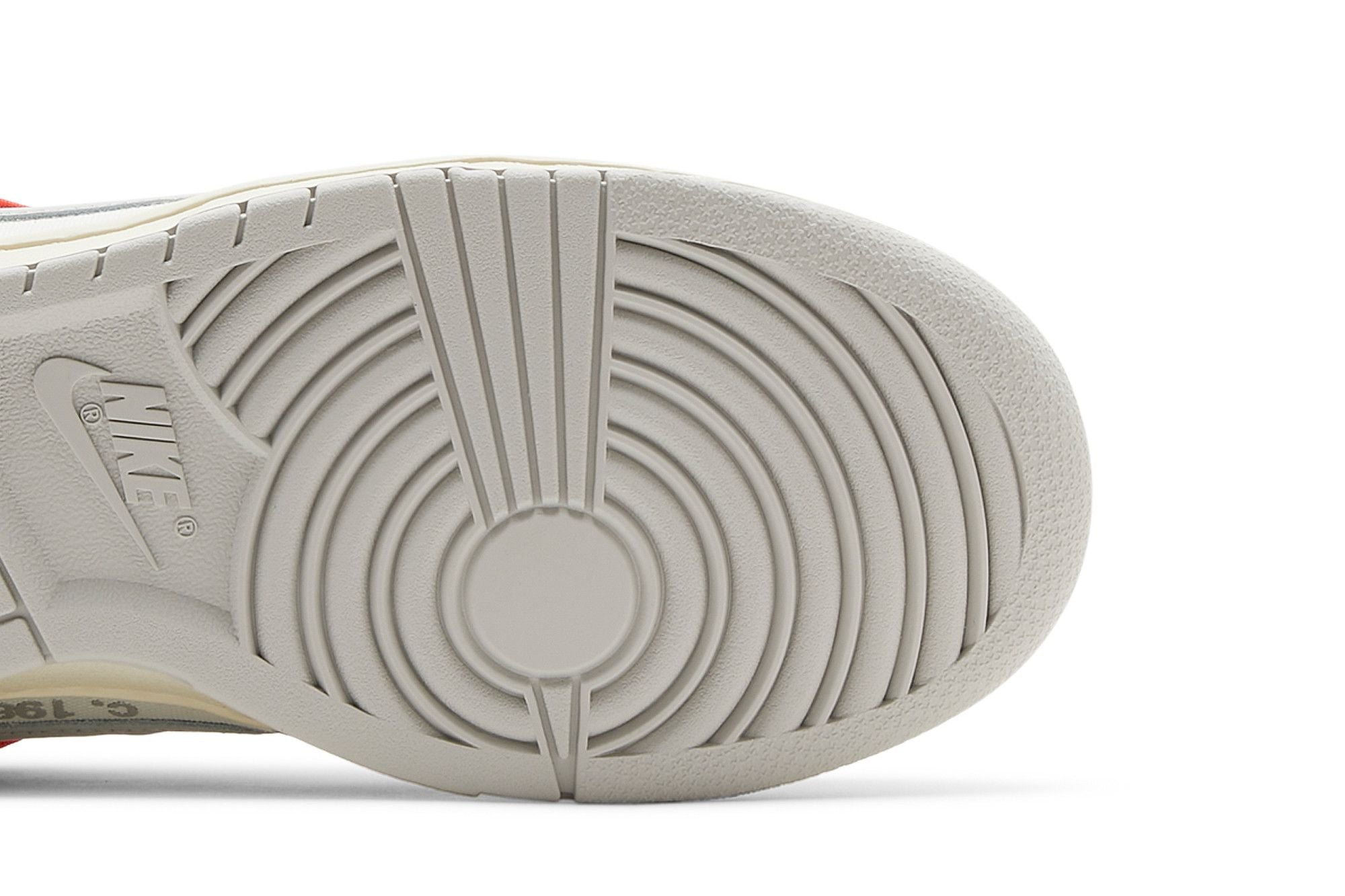 The Dunk Low Off-White Lot 23 features Sail canvas on the base, contrasting with neutral gray leather on the collar, toe, eyelets, forefoot and heel. The Swoosh branding on both sides is also upholstered in neutral grey leather. Rounding out the design is the side midsole decorated with the "23 of 50" badge, indicating that only 50 pairs were produced. See all the specs on Nike.