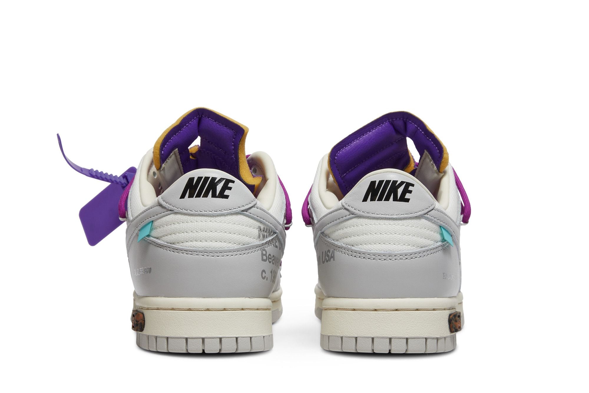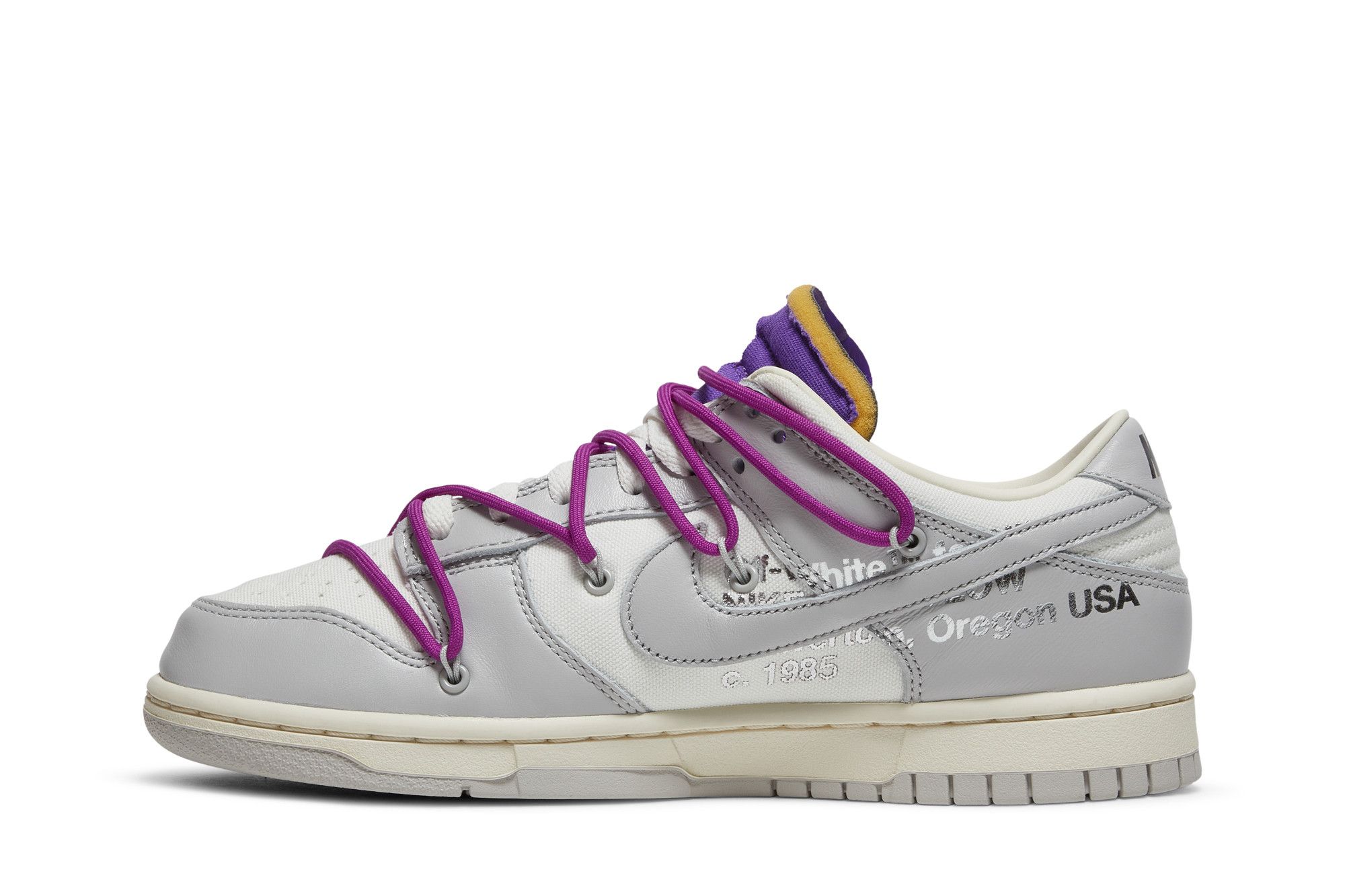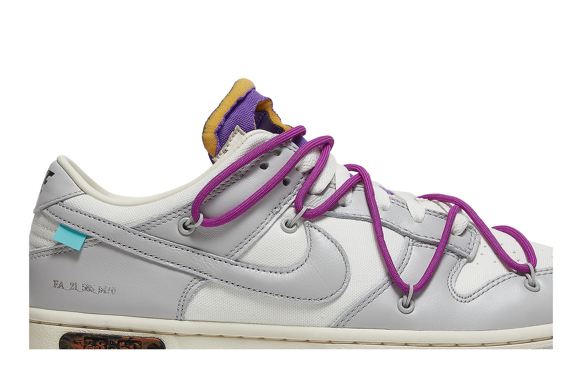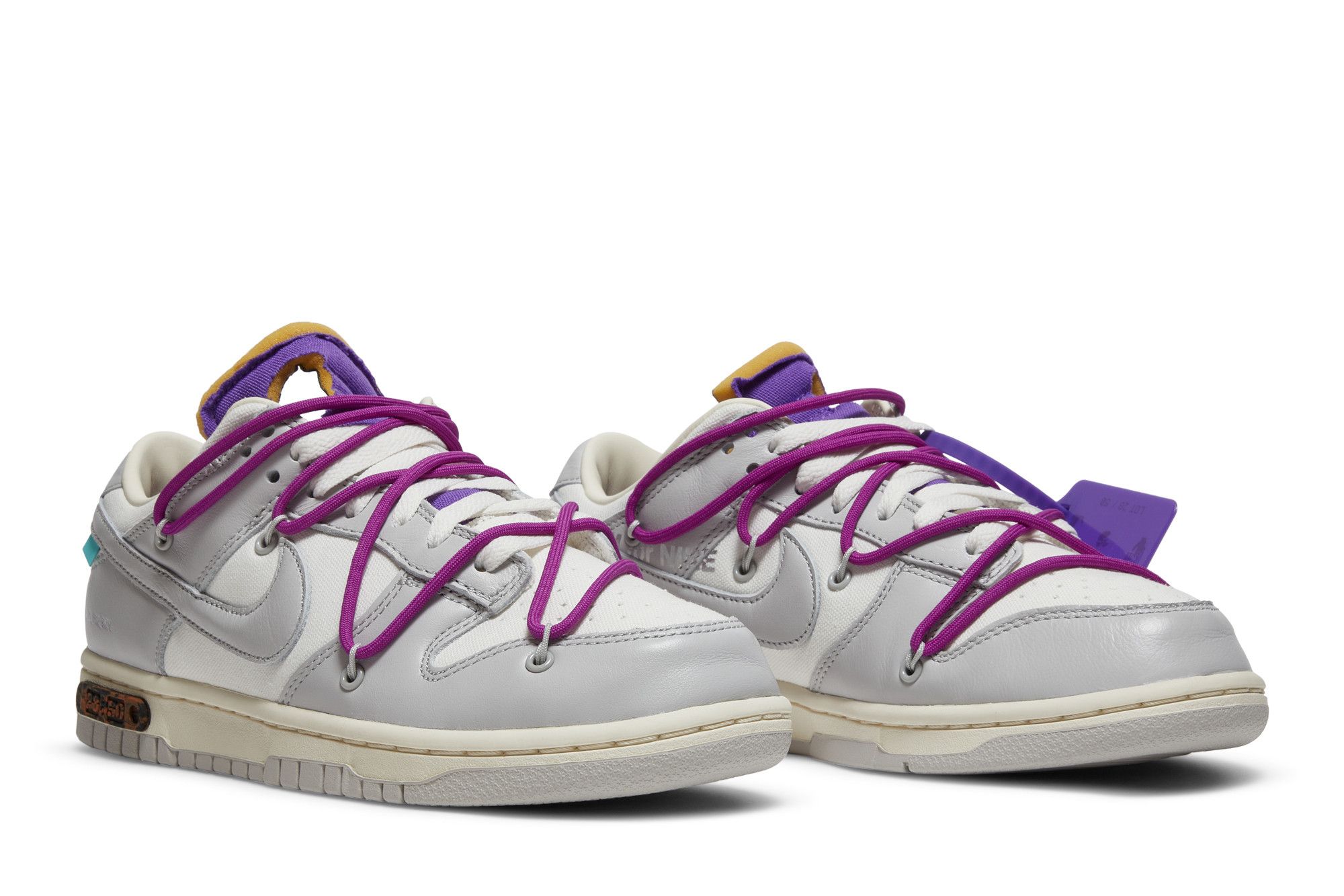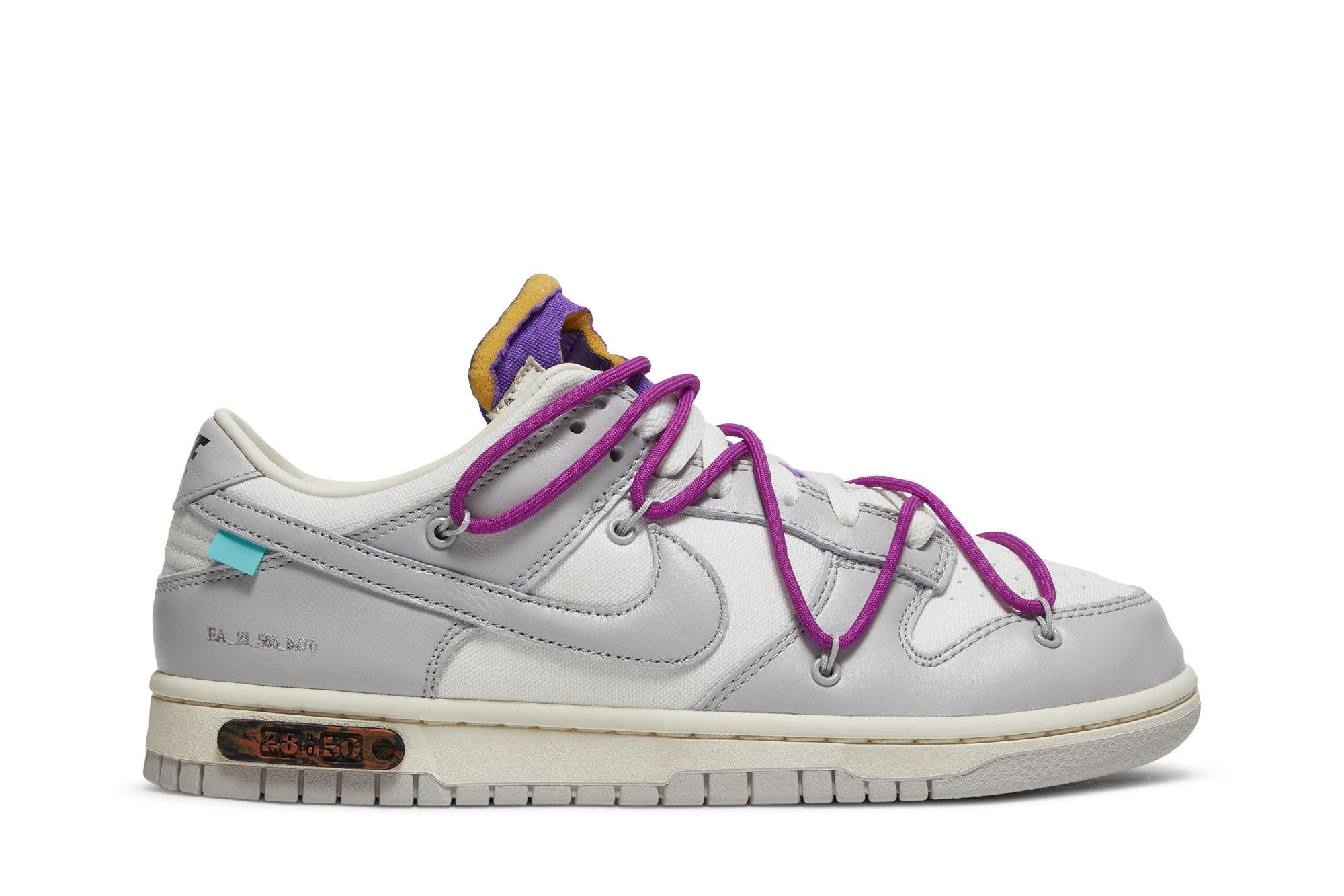 The Dunk Low Off-White Lot 28 adopts a classic silhouette with an upper made of lightweight, breathable and durable leather and textile. The midsole foam, equipped with a visible Air unit, ensures shock absorption and stability. The shoe features intricate details such as monochromatic stitching and a translucent rubber outsole for durability and grip. See all the specs on Nike.
