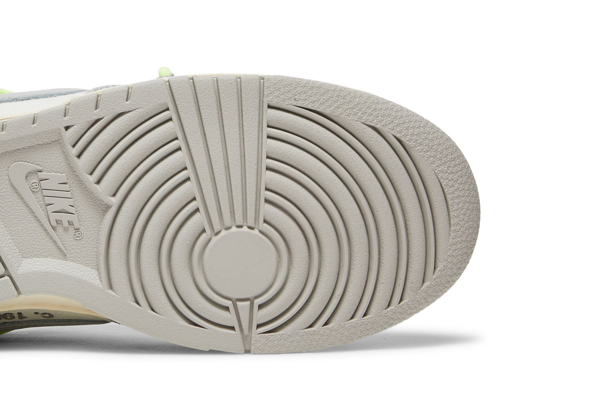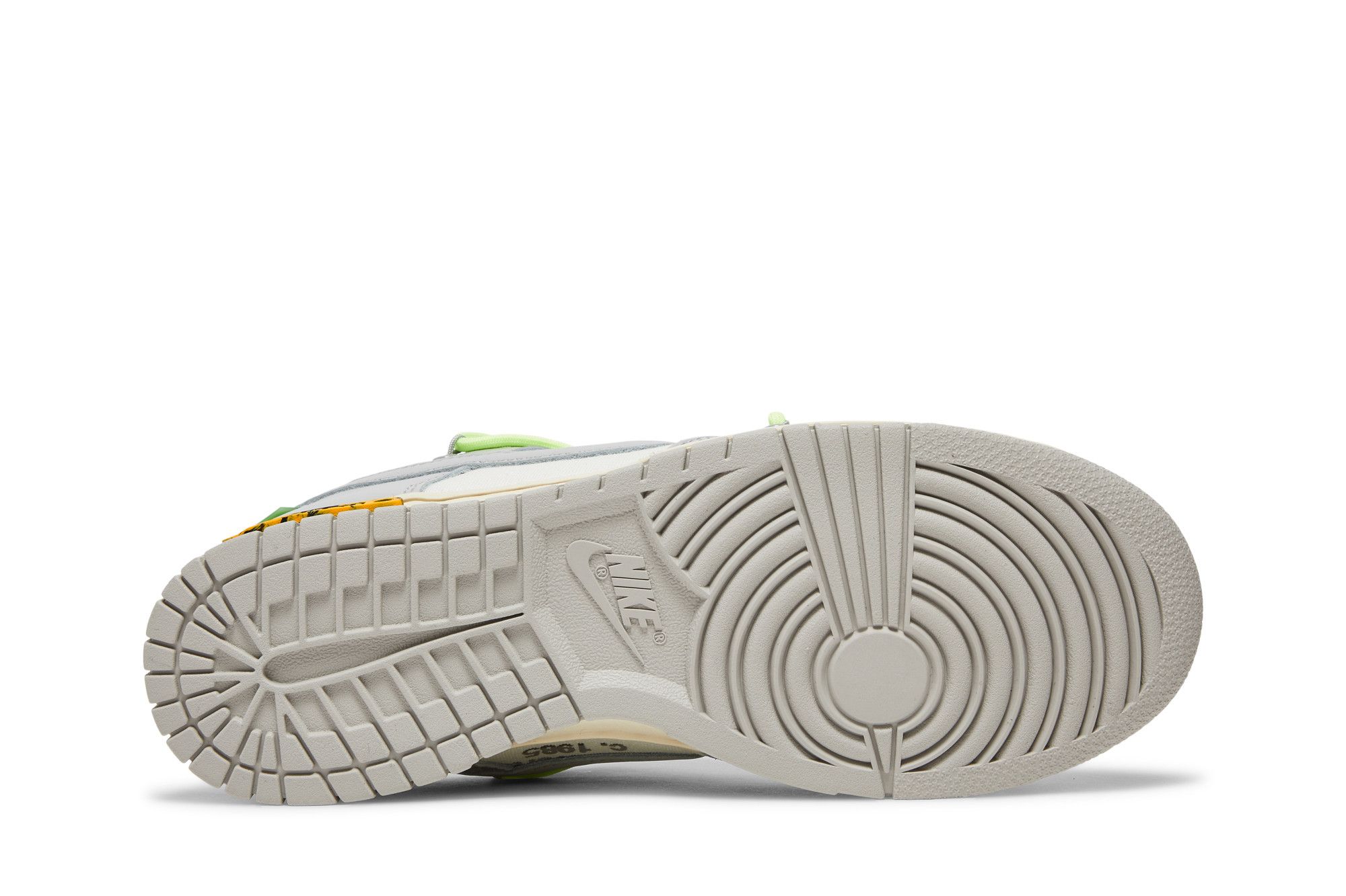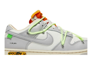 The Dunk Low Off-White Lot 43 features a white leather upper base with signature perforations in the toe. The overlays, Nike Swoosh side panel, and heel tab with Nike branding are all crafted from Gray leather. Then come the details about Virgil Abloh. Pale, green-colored lacing zigzags across the upper, and the bright orange tongue with exposed foam has a hole cut into it. Writing in silver Helvetica lettering and a green tag also grace the upper, giving it a distinctive Off-White vibe. See all the specs on Nike.
