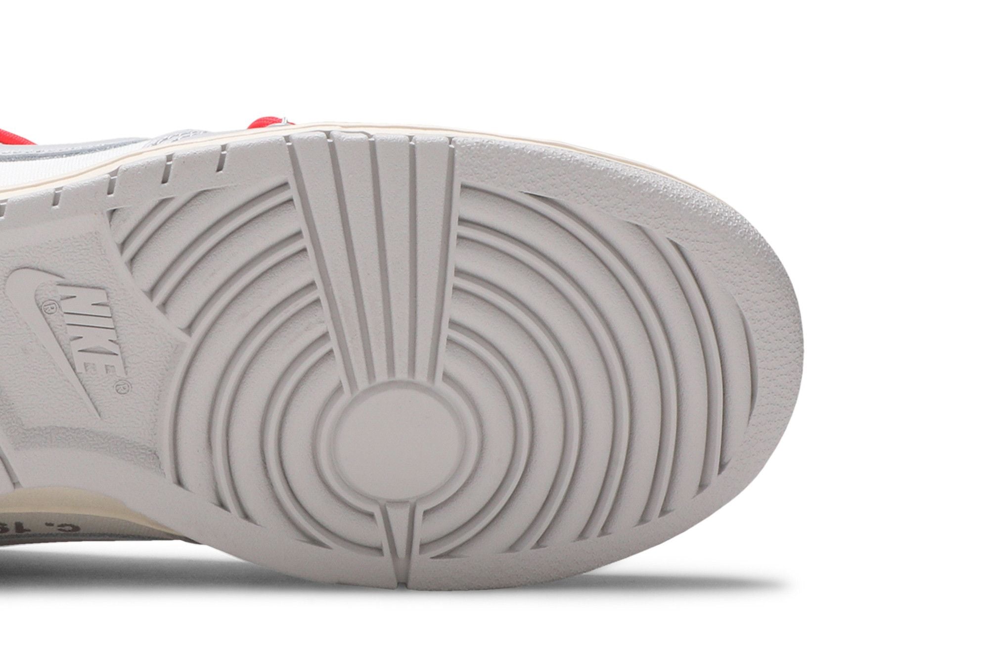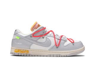 The Dunk Low Off-White Lot 6 features a Sail and Neutral Gray colorway, with Off-White branding prominently displayed on the side of the shoe next to the Nike Swoosh. The shoe also boasts a rubber outsole designed to provide support. The midsole features a two-tone gray and off-white colorway with speckled details. The shoe's lacing system is a traditional lace-up model, with orange laces. See all the specs on Nike.