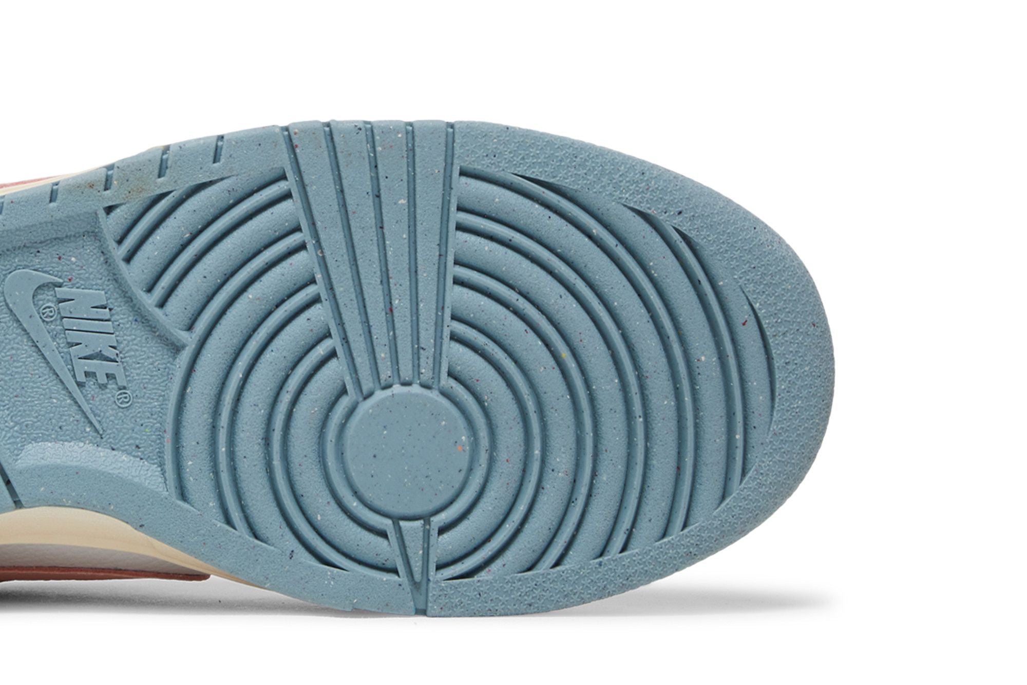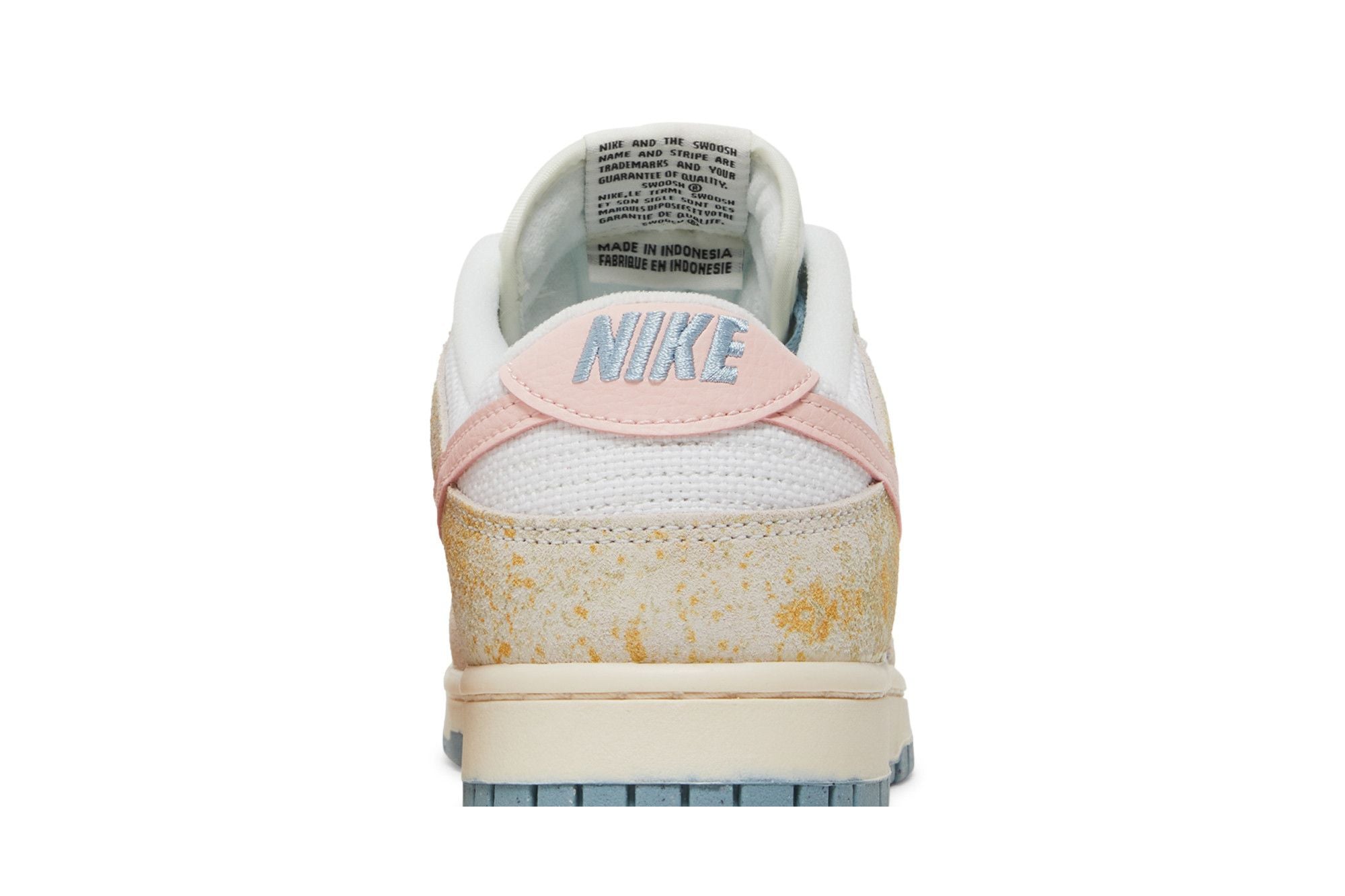 The Nike Dunk Low Oxidized features a white grained leather base complemented by gray suede overlays. Several blue, yellow and orange spots cross the upper and offer an oxidized effect. A pair of light blue laces highlight the tongue and contrast with the pastel pink side Swoosh. The whole rests on a beige speckled sole with a vintage style. See all the specs on Nike .