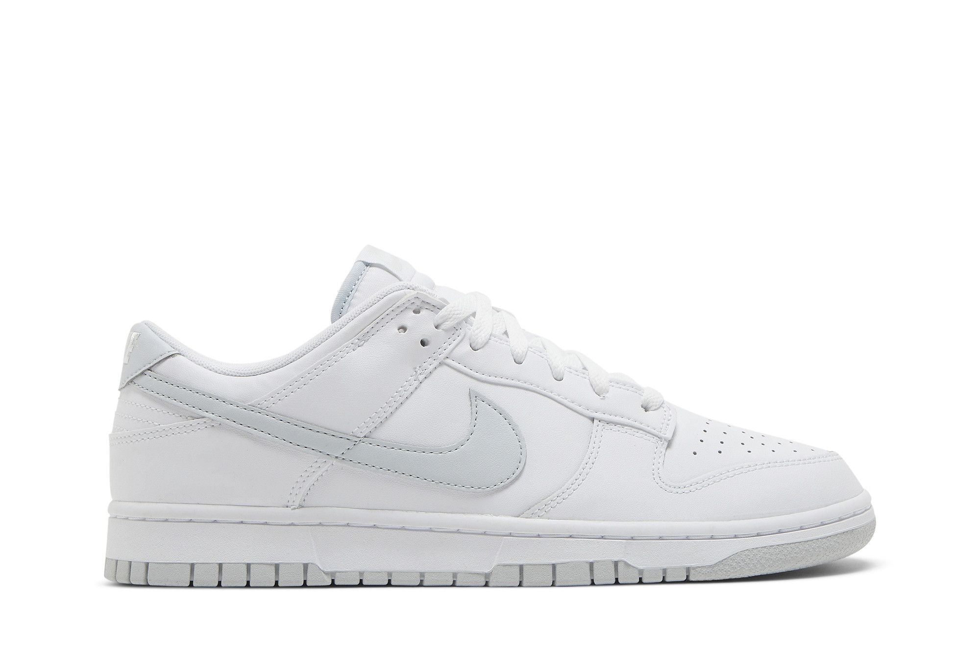The Nike Dunk Low Retro White Pure Platinum features a White leather base topped with Ton-sur-Ton panels. Only the lateral Swoosh and the leather heel tab give a very light touch of contrast with a light gray shade. To top it all off, the outsole follows the same pattern with an immaculate midsole and exhilarating outsole. See all the specs on Nike.