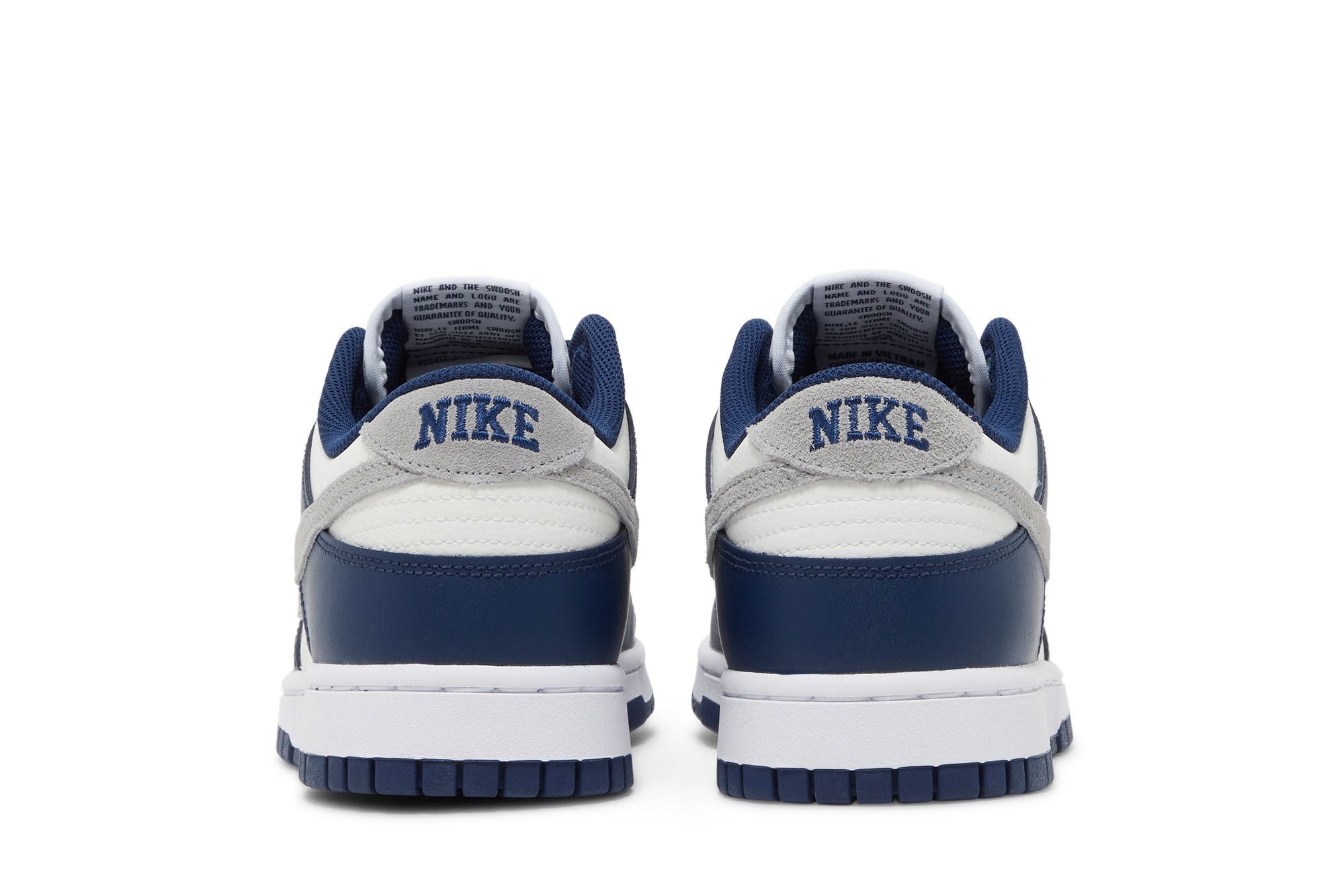 The Dunk Low Summit White Midnight Navy features an off-white pebbled leather base with navy blue leather overlays. A gray suede Swoosh enhances the panels and adds a pop of contrast. Its peculiarity lies in the Nike branding embroidered in an American university sweatshirt style. See all the specs on Nike.